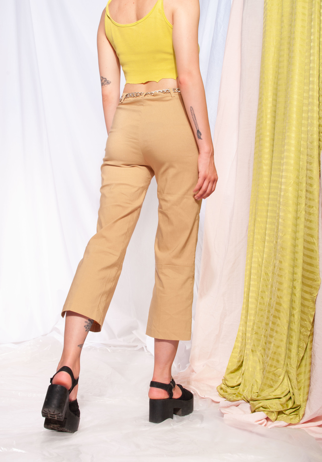 Vintage capri trousers that entered our time tunnel in the 00s and just slipped out here in great condition. It rocks stretchy beige fabric, two pockets and zip closure. We have nothing left to add, so here comes our daily styling tip: mix this one with more vintage stuff!