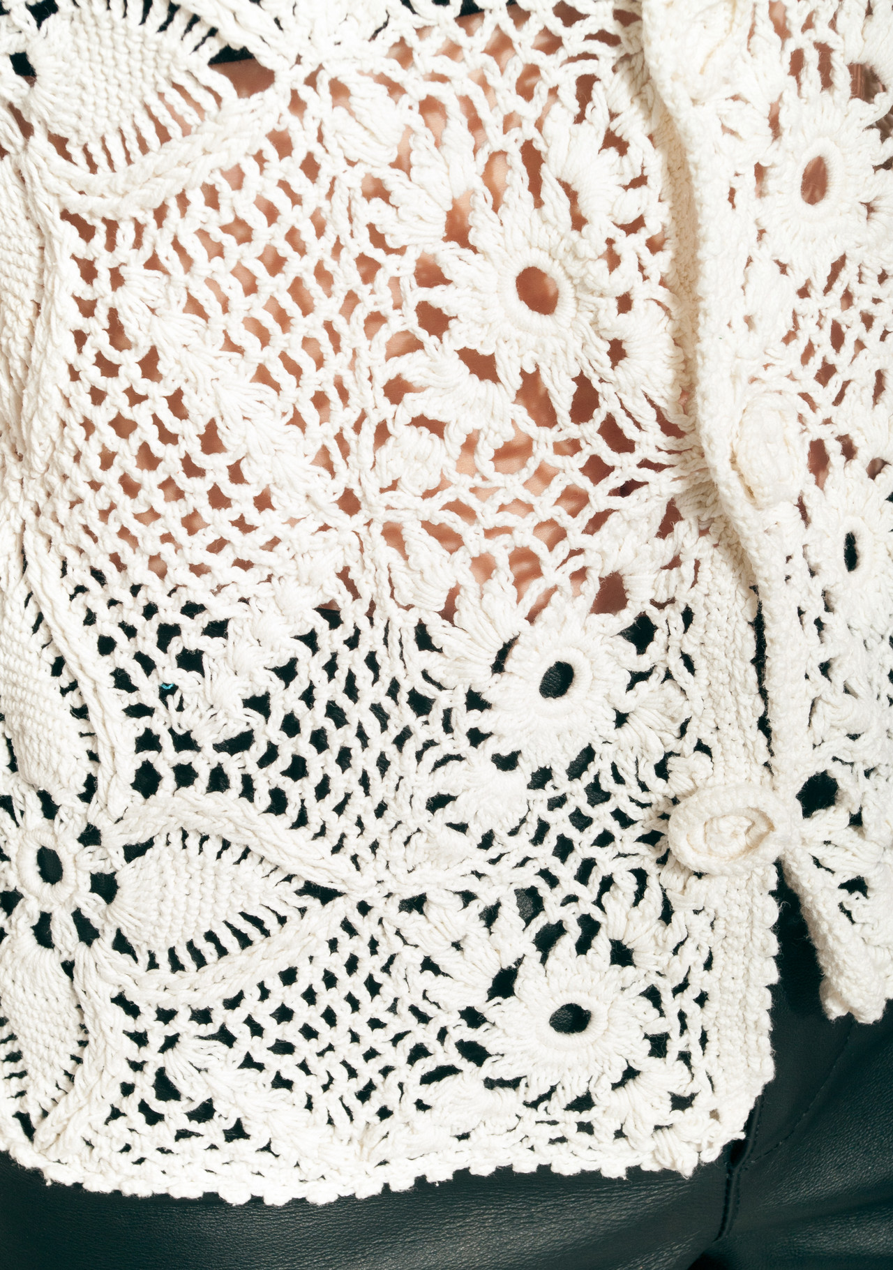 A hand-crocheted vintage cardigan that entered our time machine in the 50s and just slipped out here in great condition. It’s a rare and delicate handmade piece, even its buttons are crocheted. Made of natural fabric. Don’t hesitate, grab this vintage gem before someone else does.
