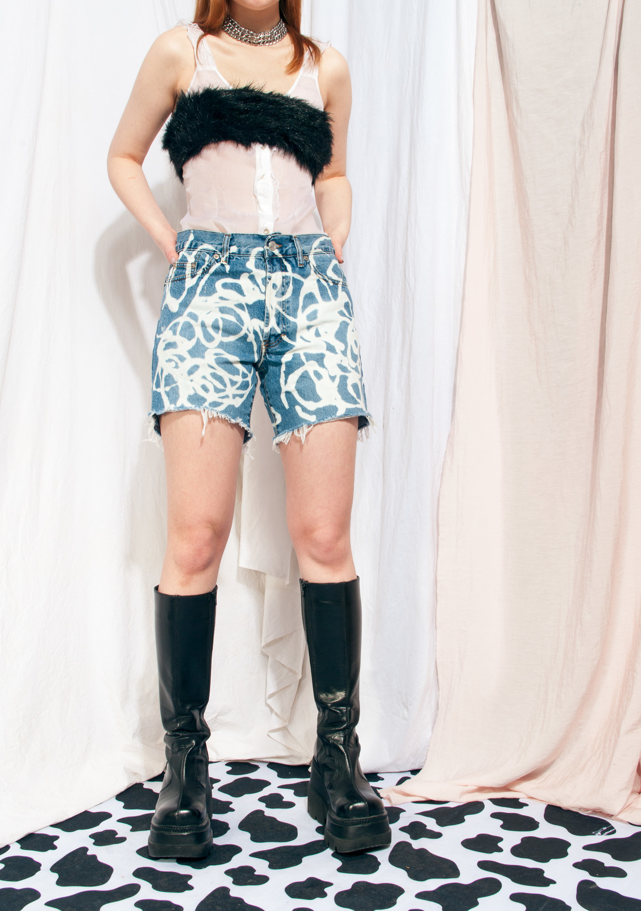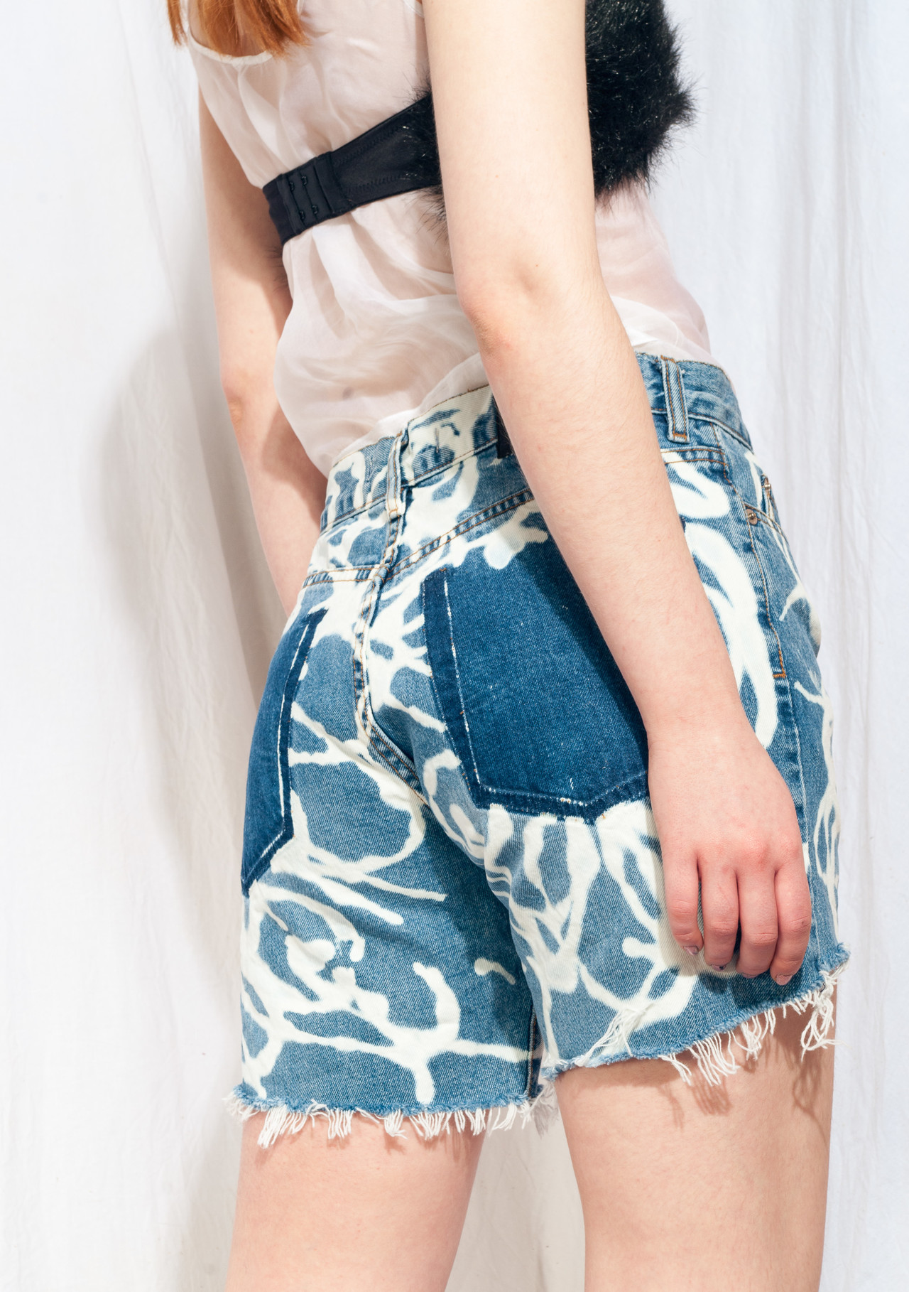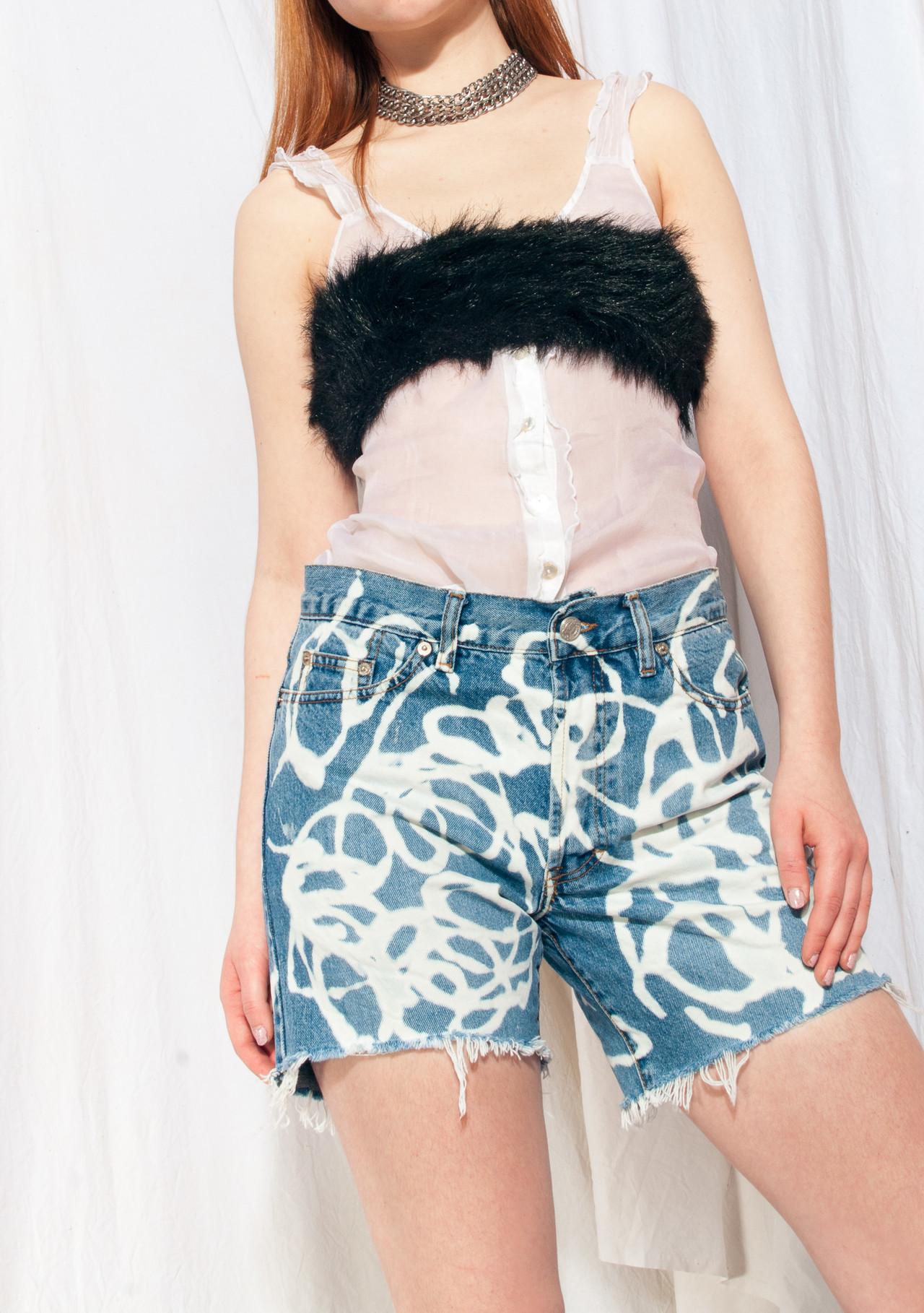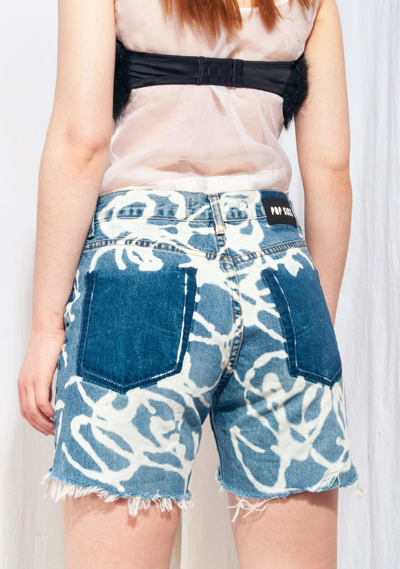 Reworked vintage denim shorts from the 90s. We hand-painted it with bleach and removed its back pockets to get this rad look. It’s a true vintage babe that was made in the USA and survived in flawless condition. Featuring button closure, boyfriend cut and five pockets.