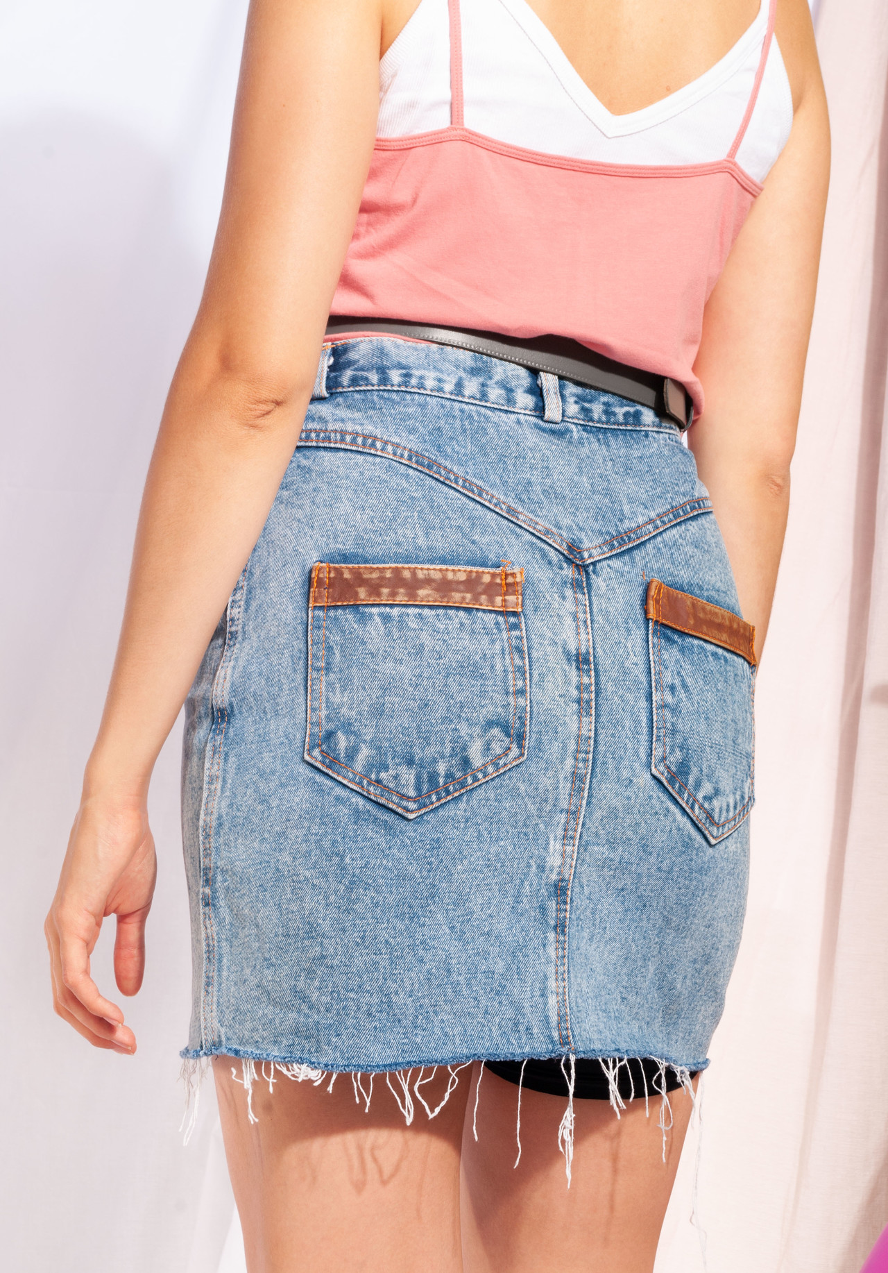 Insane vintage denim skirt from the 80s with leather details at its pockets and the coolest acid-washed colour. It survived all these years in great condition. We cropped it to get this sweet length and the frayed hem. Zip and button closure. Save the planet, switch to vintage now!