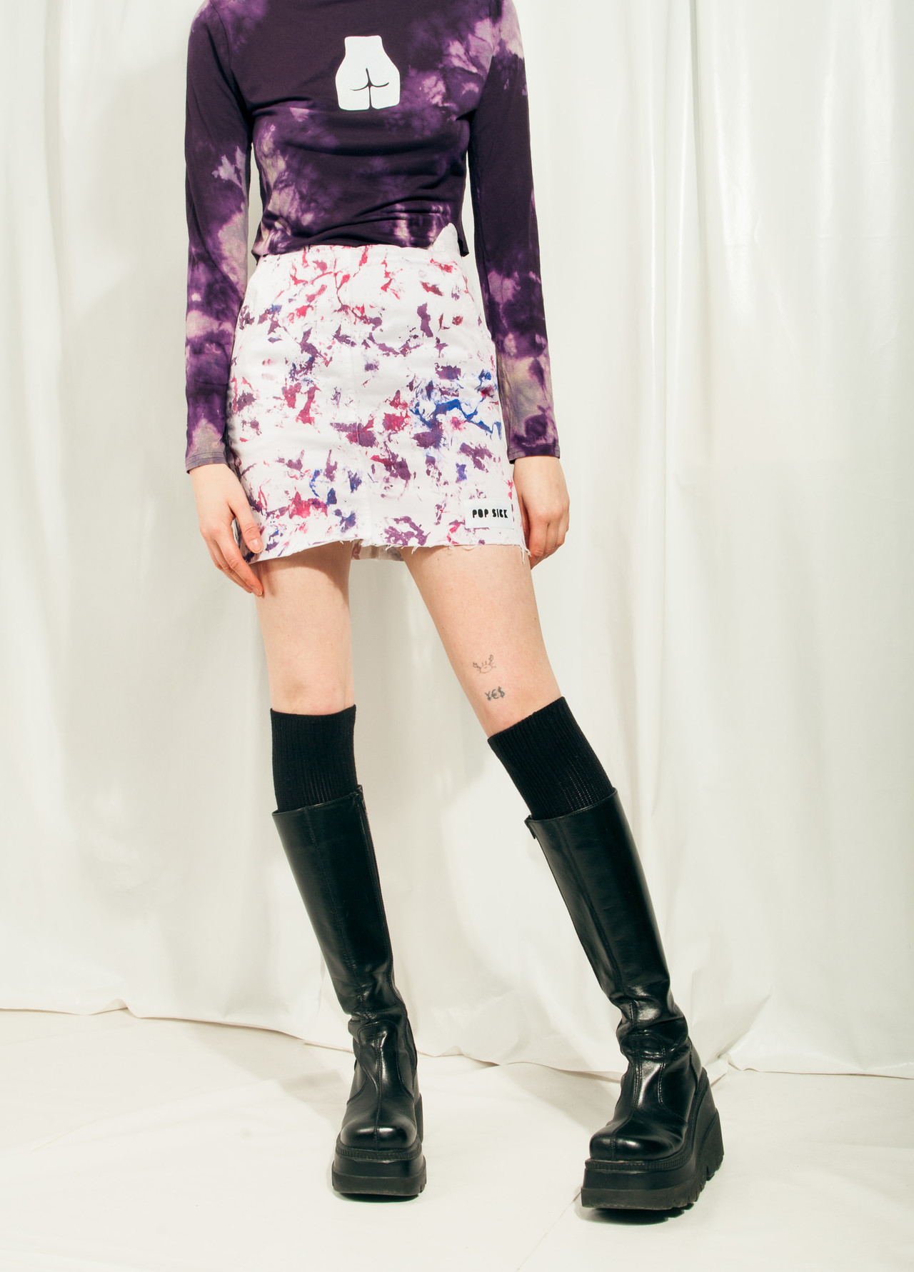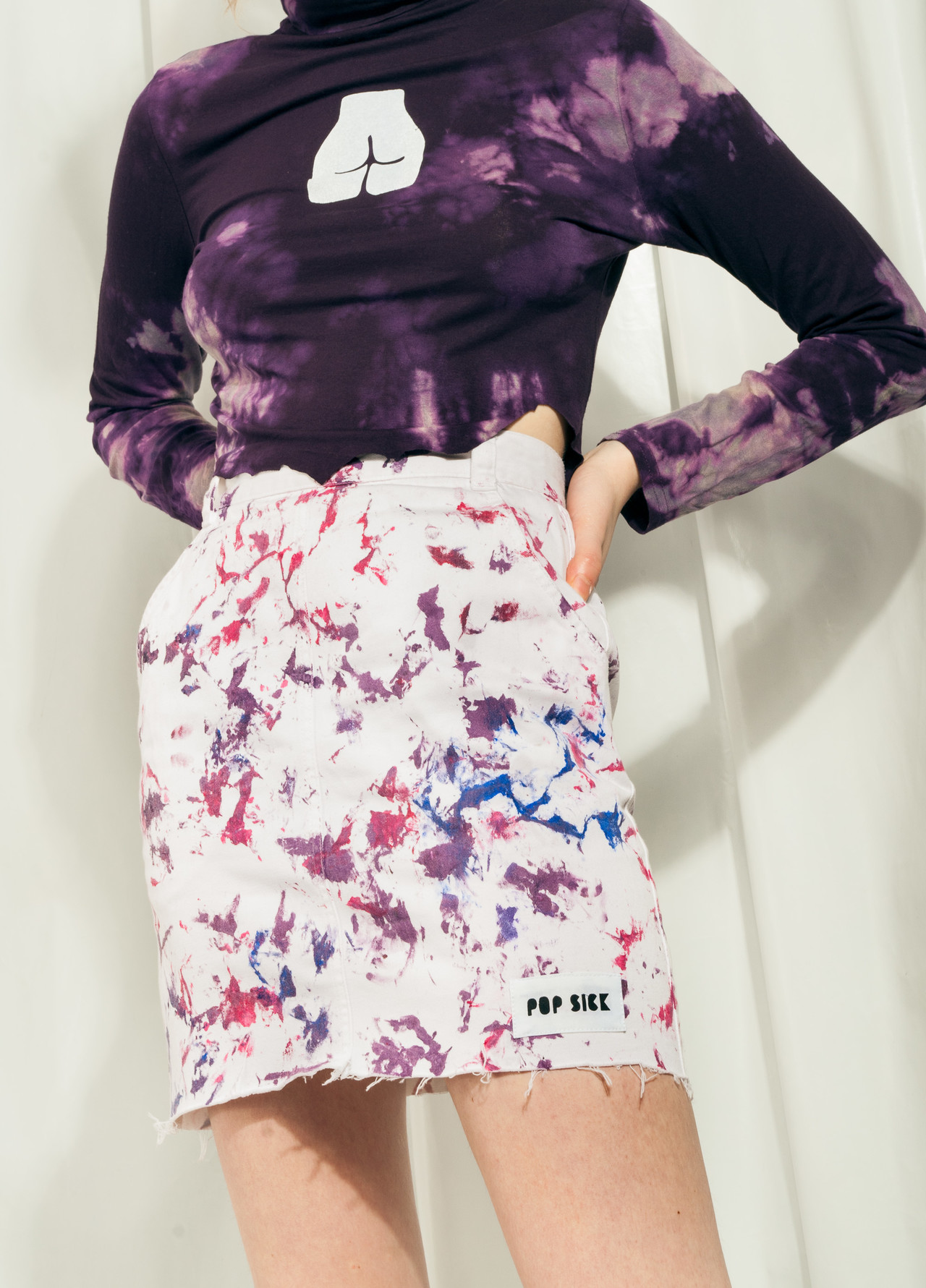 Almost instantly after this cool skirt arrived through our time tunnel from the 90s we hand-painted it to be even cooler. We had some doubts about whether these levels of coolness could be reached. We think the result speaks for itself. Just look at the images. Comes in a high-waisted cut with a raw cut hem and a zip at back.
