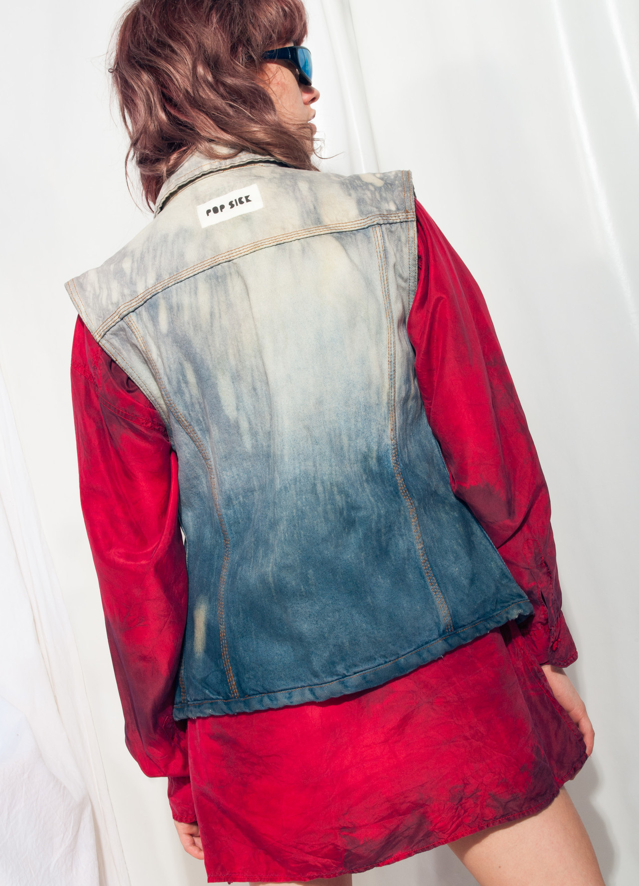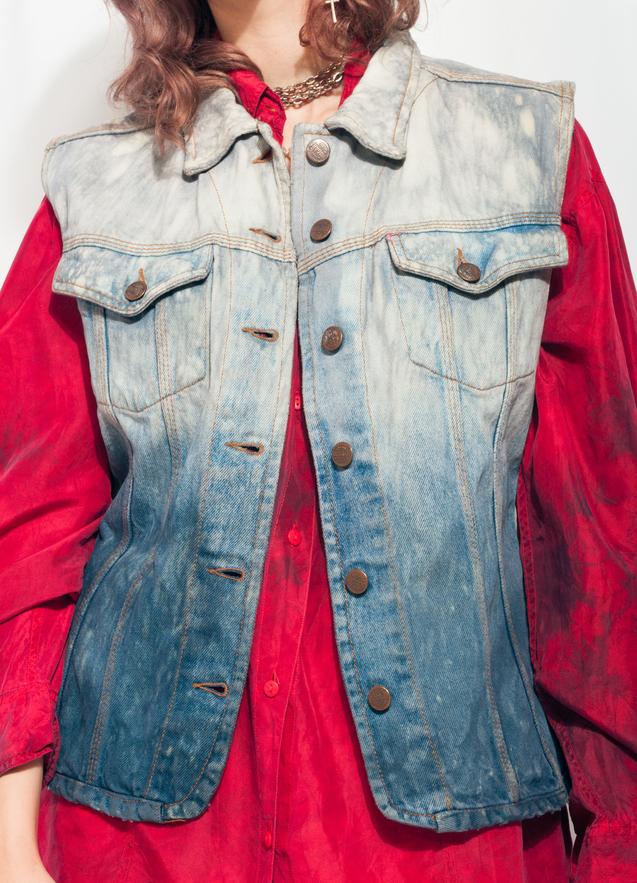 90s denim vest. We added the cool tie-dyed gradient to it to get this one-off look. It features thick vintage denim and copper button closure. Fits more sizes depending on the desired look, please check the exact measurements!