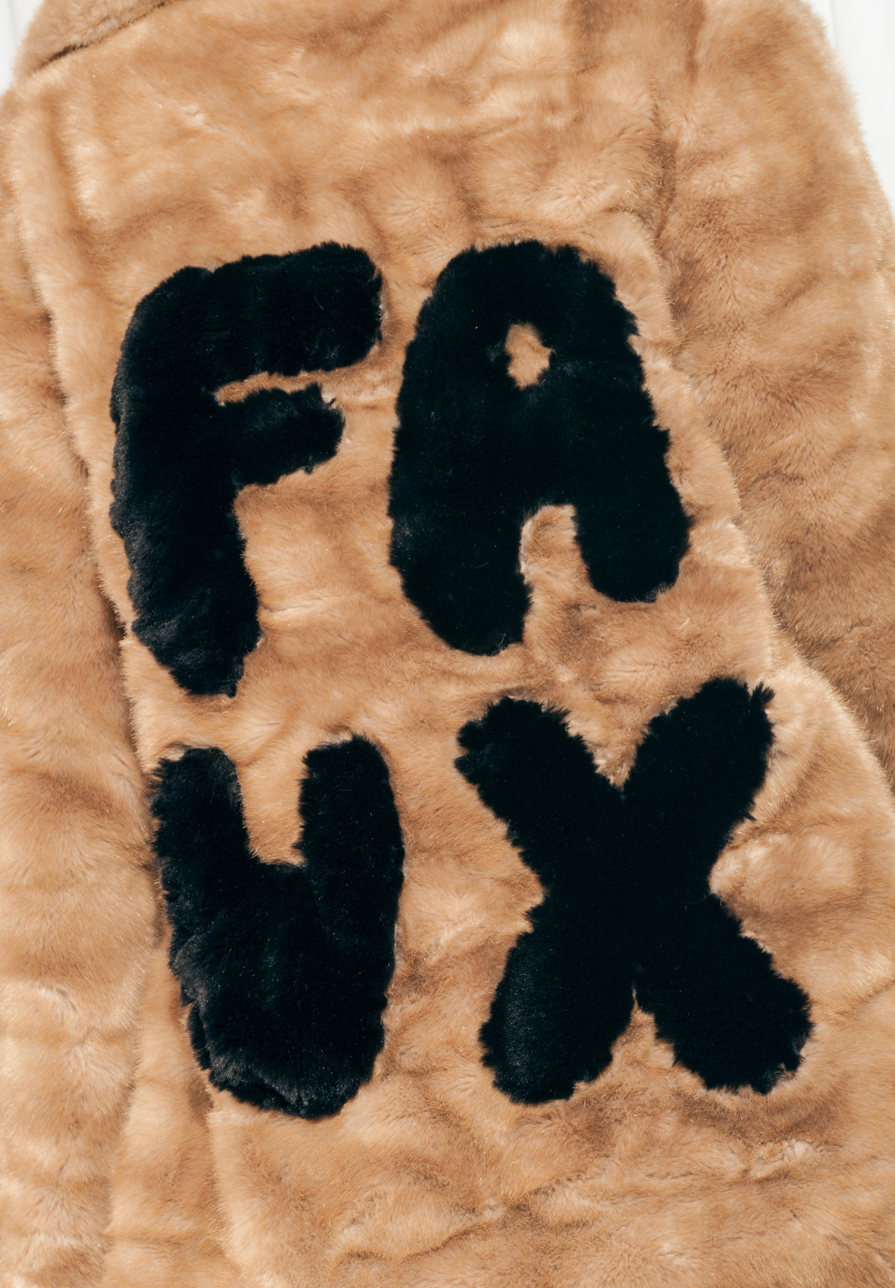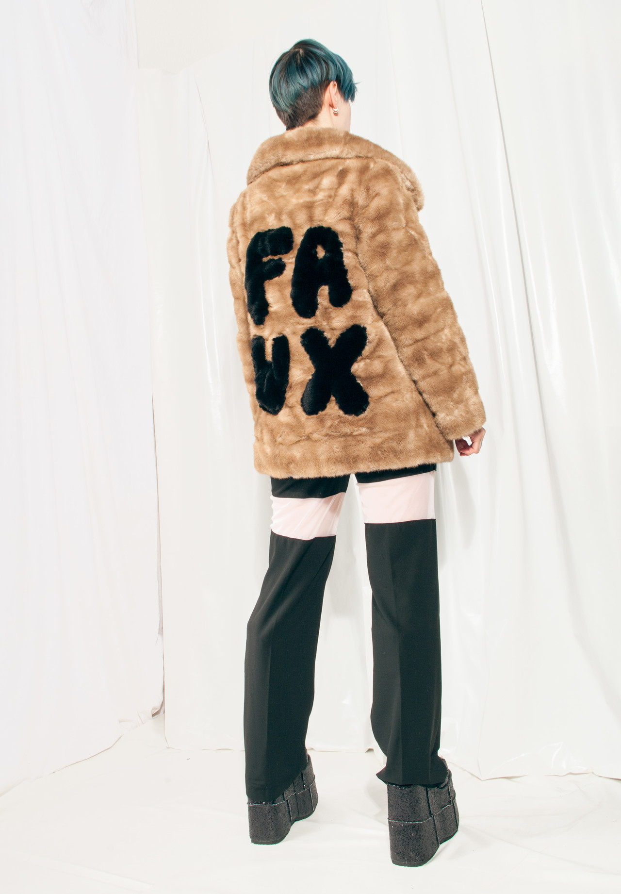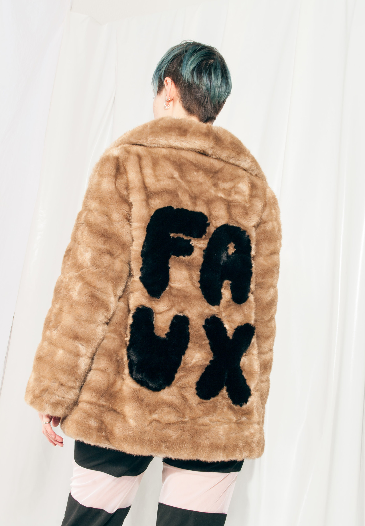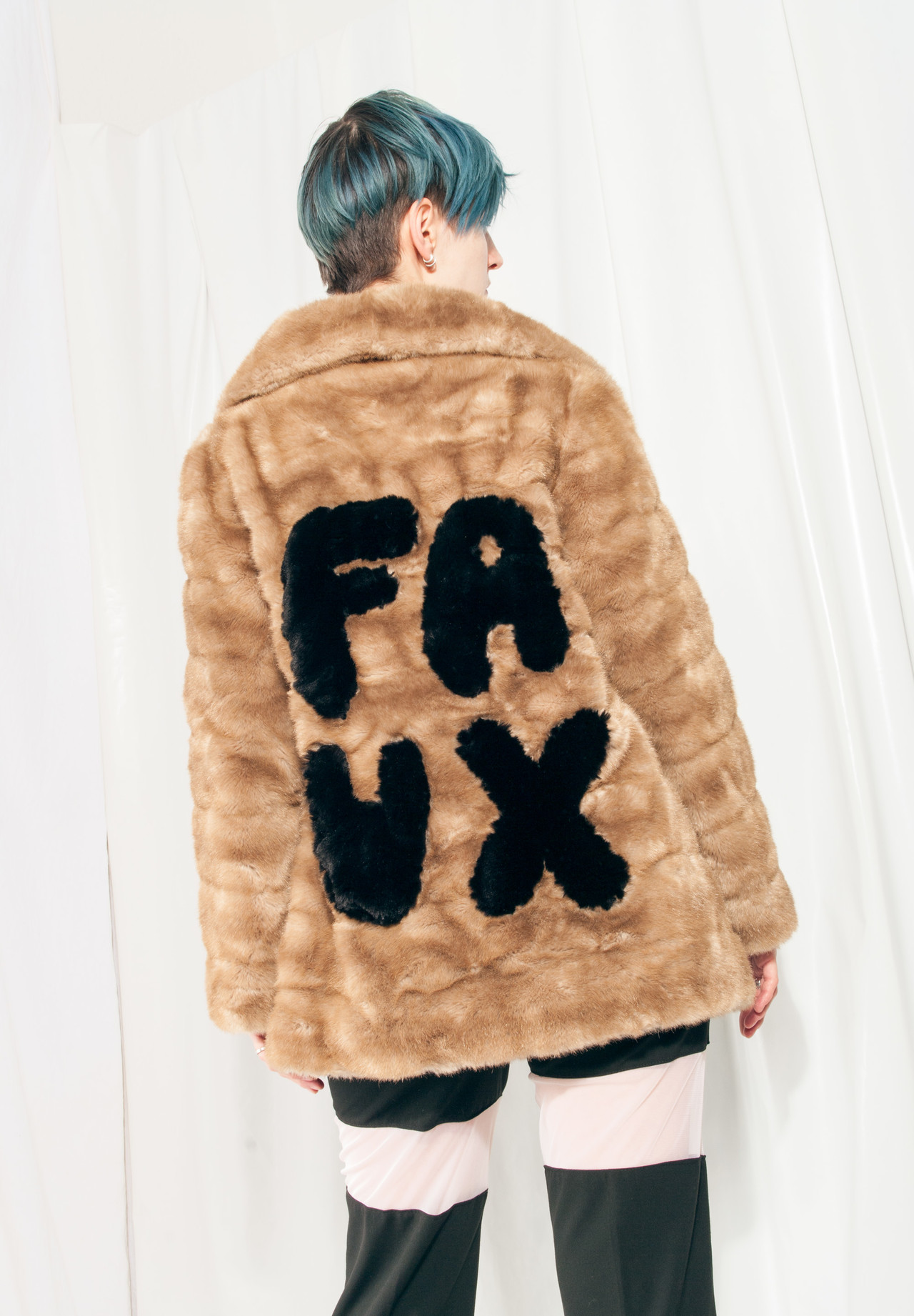 Reworked vintage faux fur coat straight from the 70s in mint condition. The big FAUX pattern on its back is hand-sewn by us. The coat is warm and it has two pockets and a hook closure. It’s fully lined. Made in England.