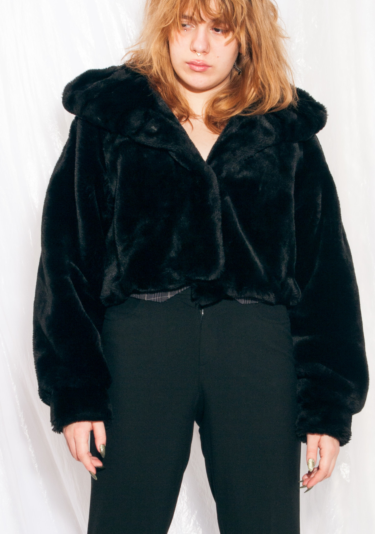 Vintage Faux Fur Jacket 90s Reworked Cropped Coat in Black