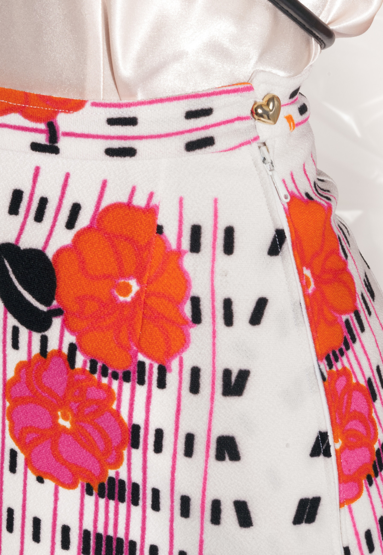 This floral midi skirt is a real vintage item that escaped from the swinging sixties. It miraculously survived in great condition, though, we had to replace its ugly button with a golden heart-shaped one to fix the level of cuteness. It’s fully lined and has a zip closure.