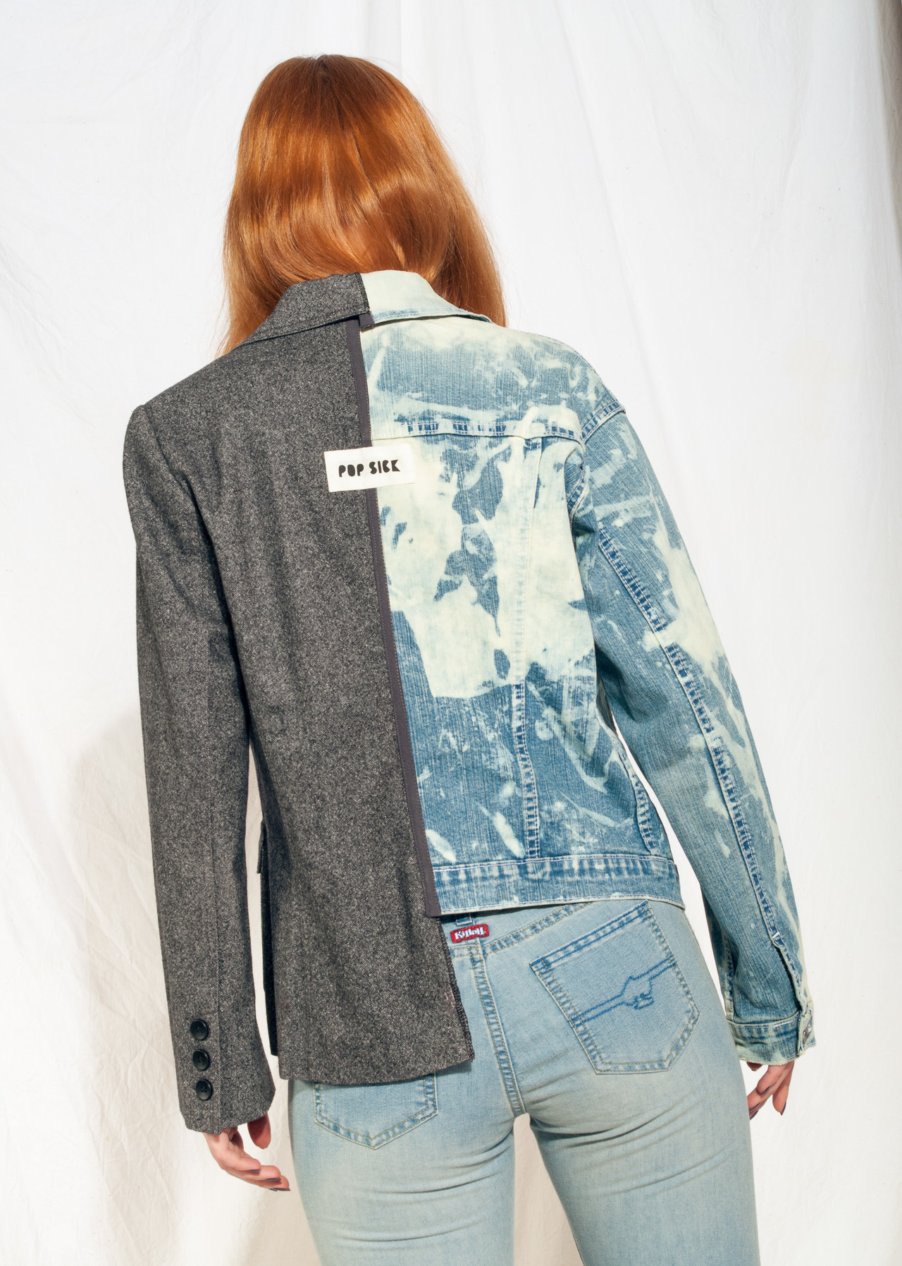 Insane half and half reworked vintage blazer. We matched a reverse tie-dyed denim jacket to a grey blazer. You know how to get the real vintage aesthetic? Simply skip fast fashion and create head-to-toe vintage outfits!