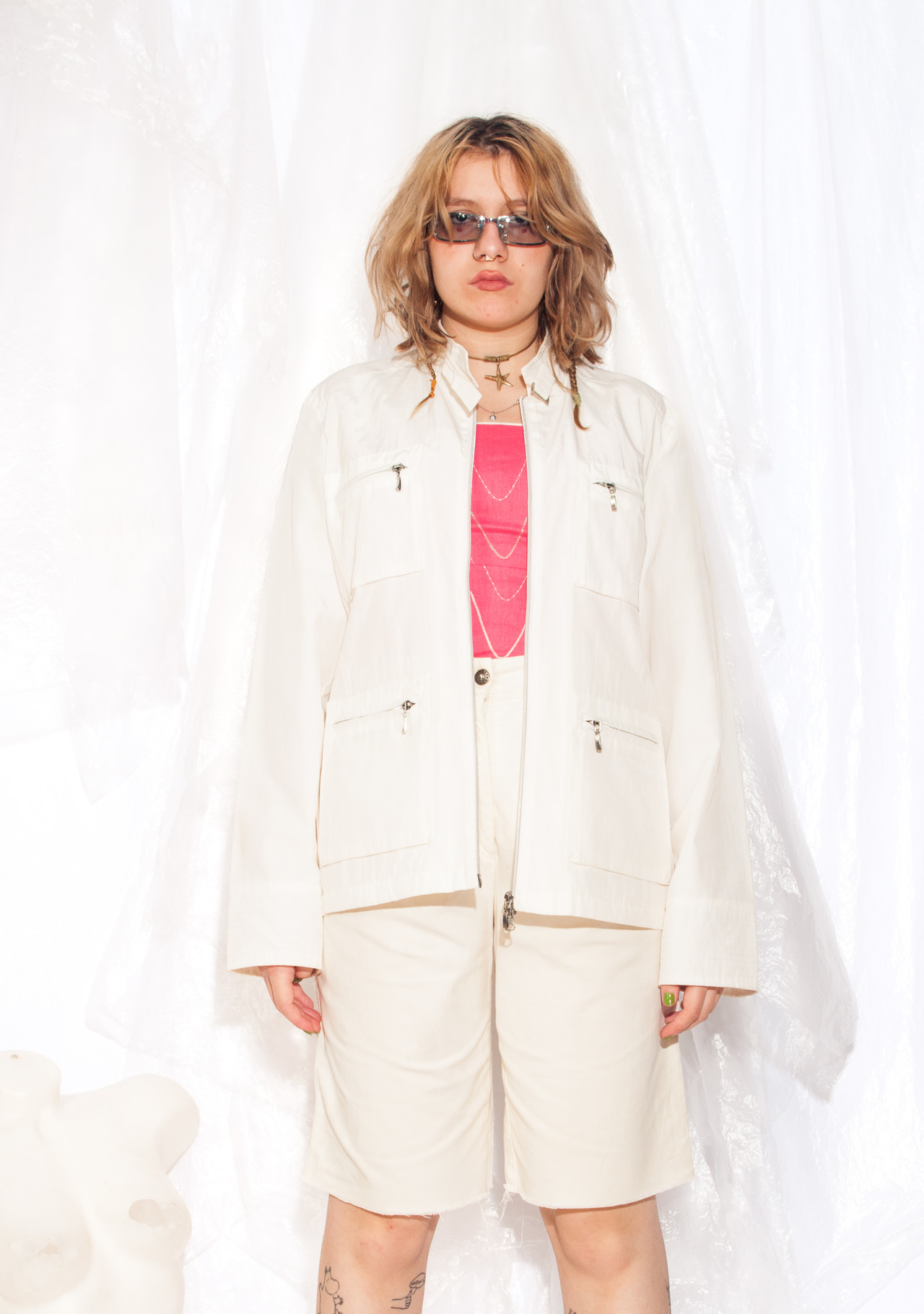 This true 2000s utility jacket just arrived through our very own time tunnel. Zippable pockets — four of them –, zip closure at front, millennials vibes, you really should click for it.