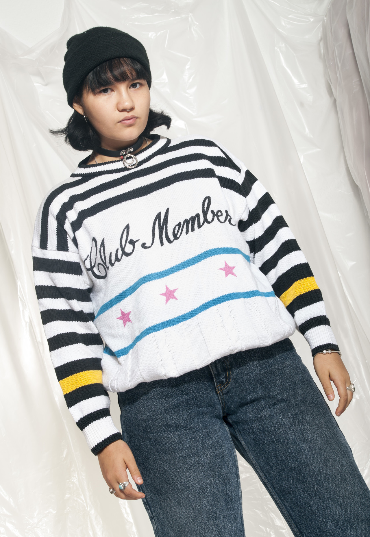 A vintage dream knit jumper that escaped from the awesome 90s in good condition. White background with black stripes and a Club Member caption, wonderful. A really nice piece knitwork made from natural cotton yarn.
