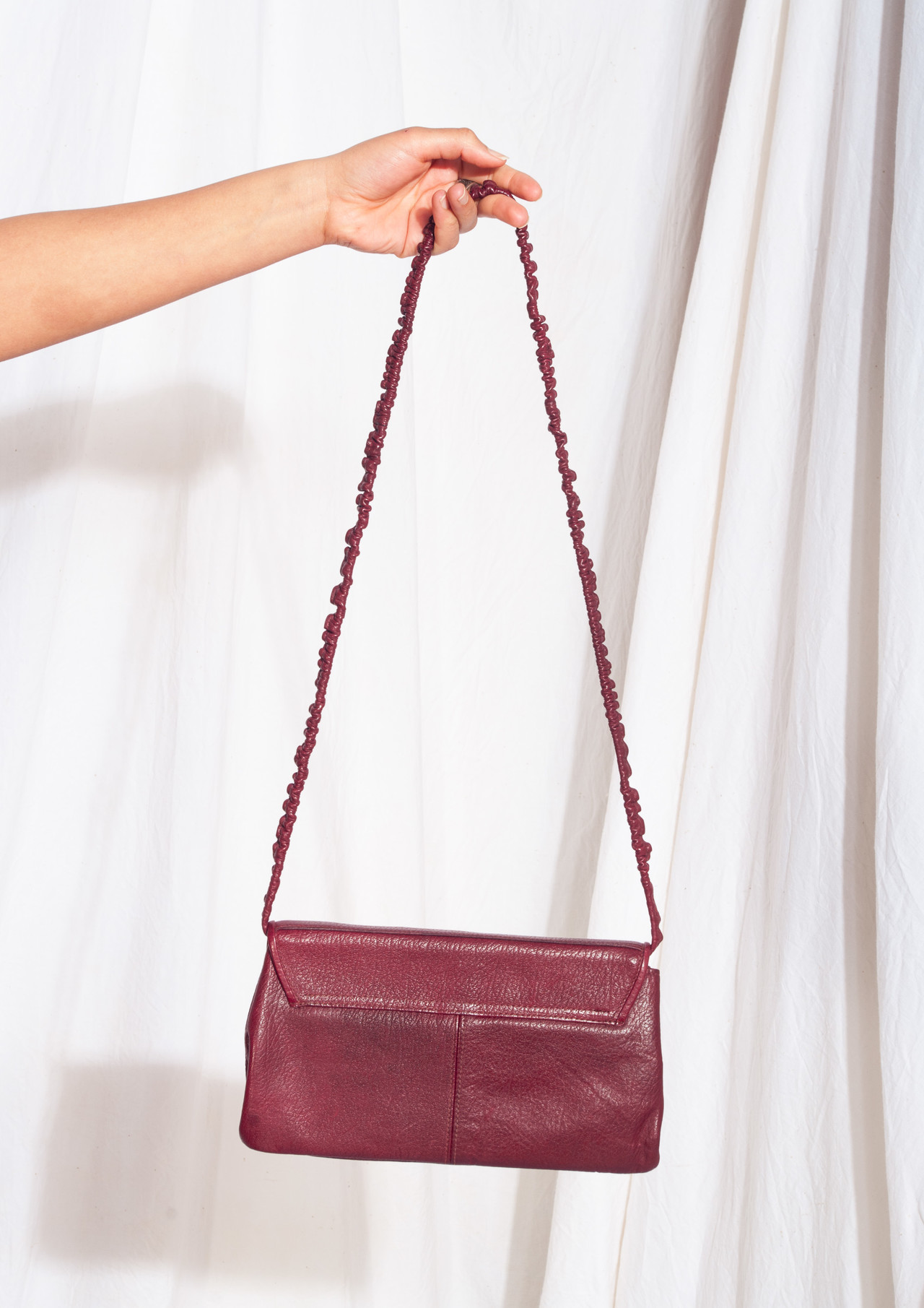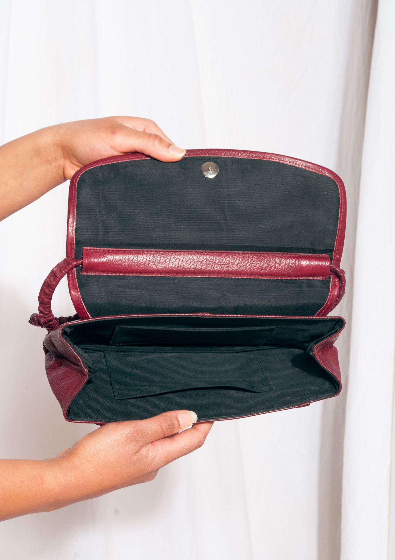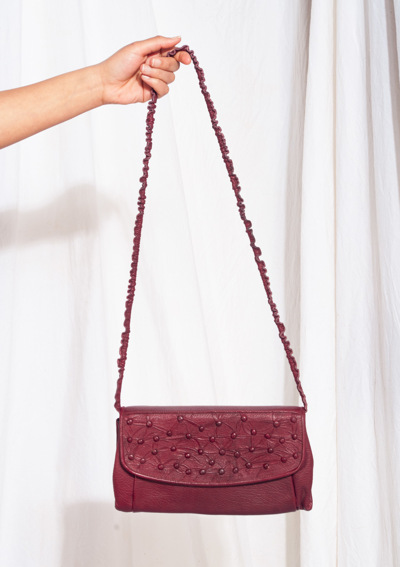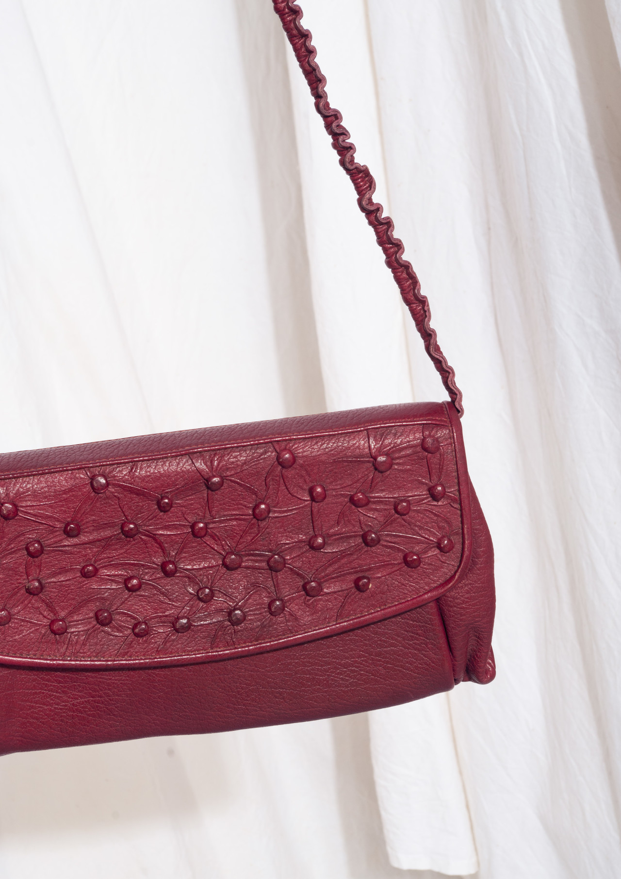 Wow, a one-off vintage bag from the 70s still in mint condition! It features dotted maroon leather, snap fastener closure and three pockets. It’s fully lined. Let’s get sustainable – switch to vintage now!