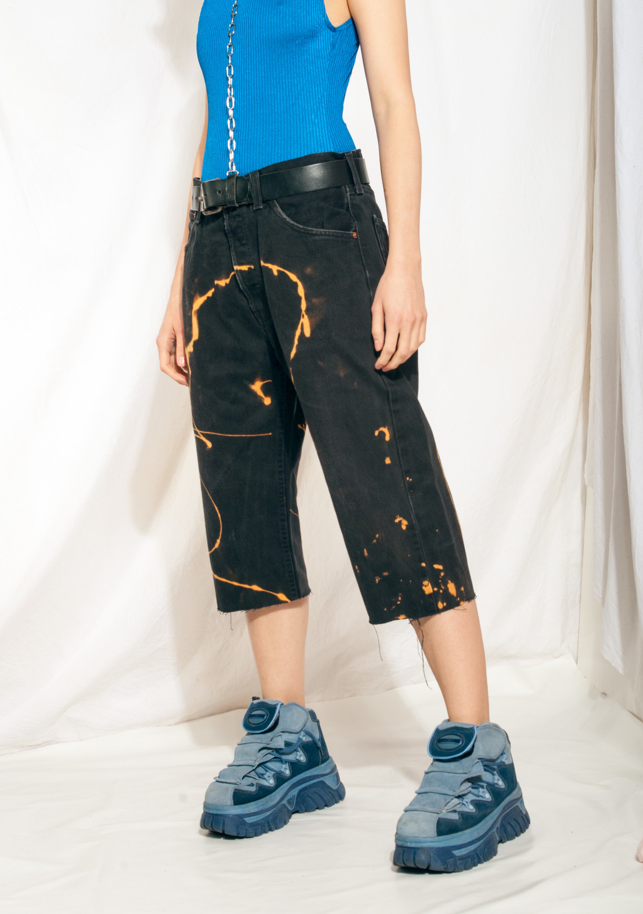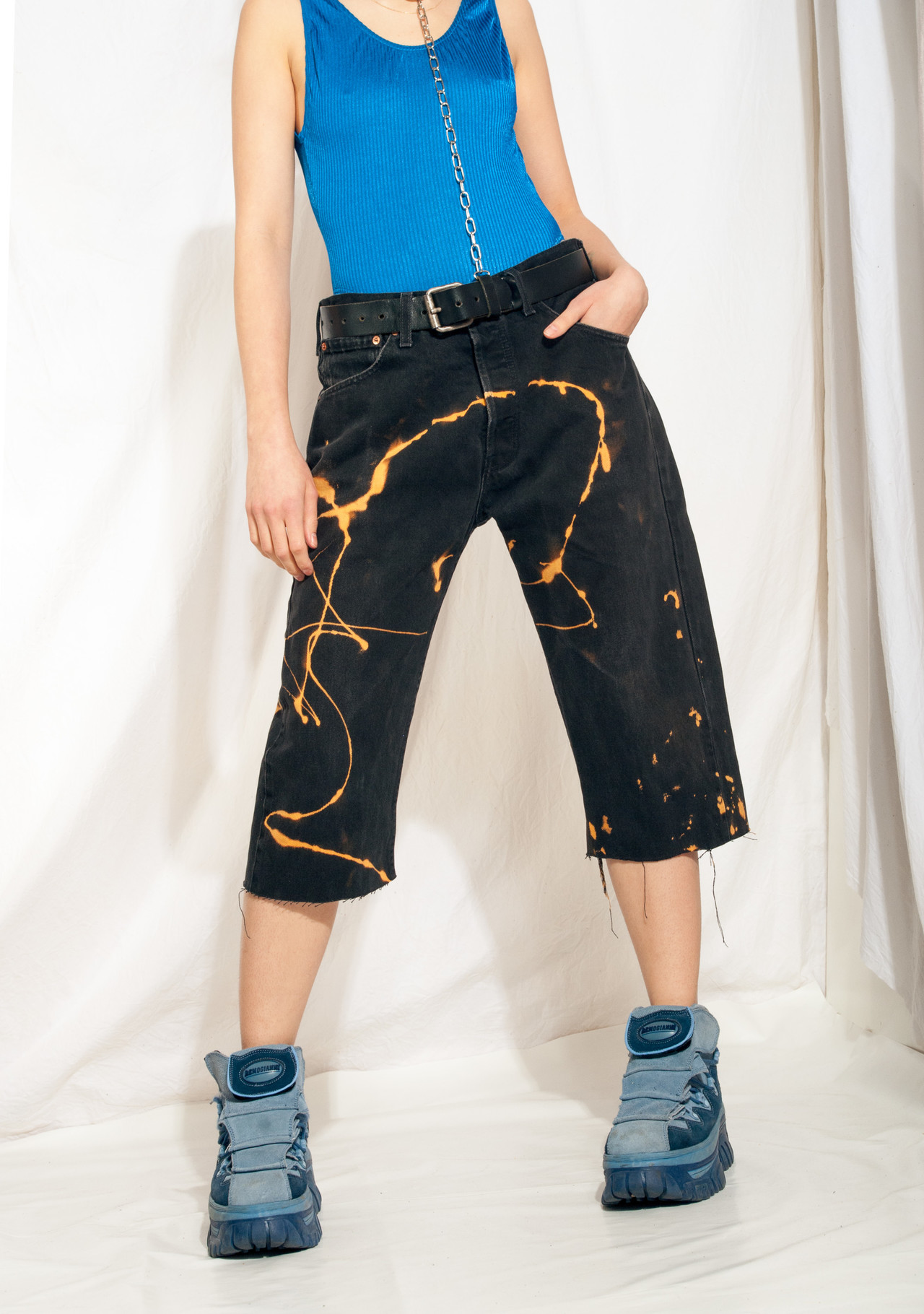 Levi’s denim shorts! Levi’s denim shorts! Is there anything cooler than Levi’s denim shorts? Yes: reworked Levi’s denim shorts! Luckily, this item is no exception to this rule. Made of black denim, this babe comes with a rad bleach-painted pattern. It has five pockets and button closure. Made in the UK. Style: Levi’s 590. Save the planet, switch to vintage now!