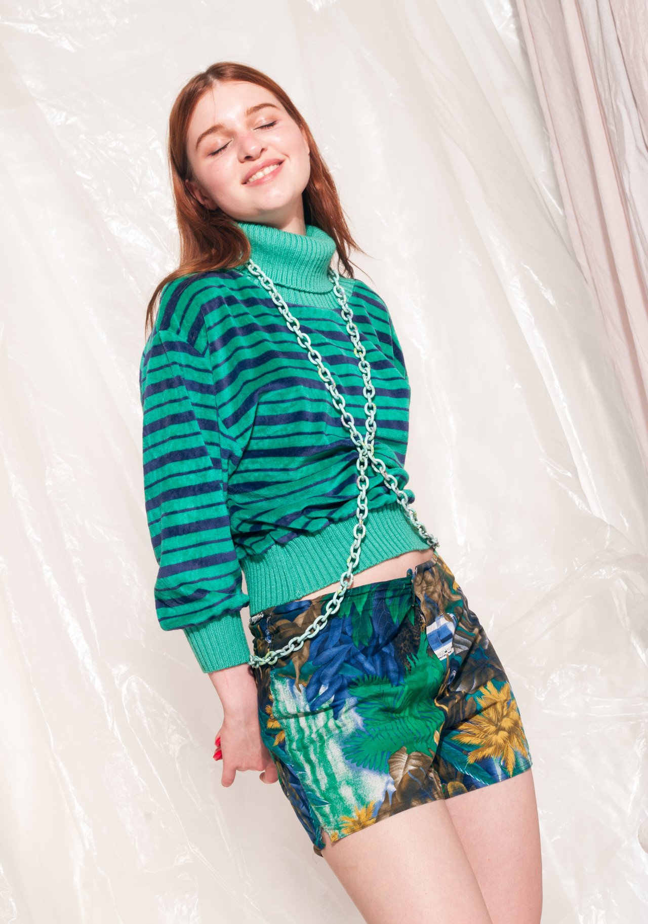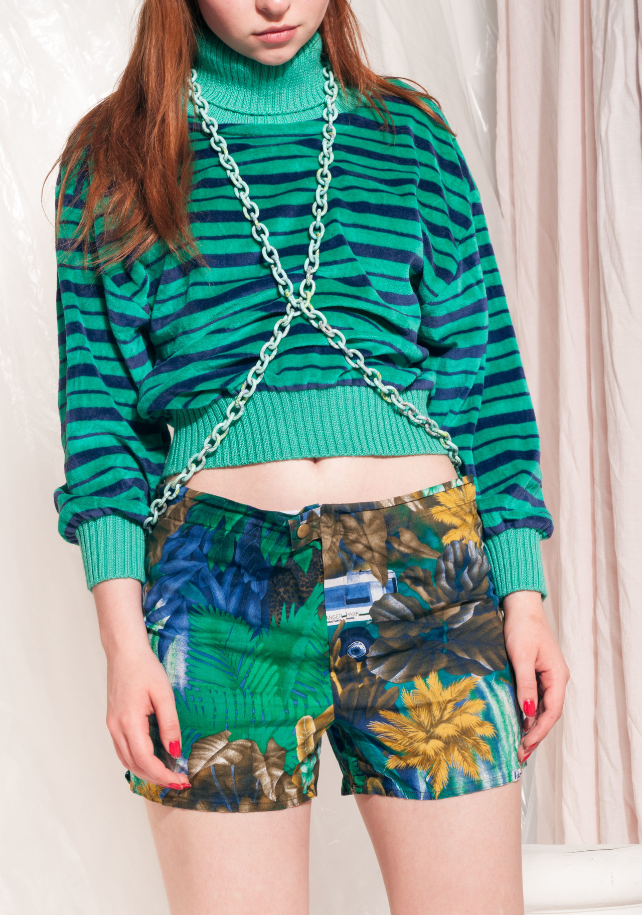 Jungle-printed vintage shorts from the dreamy 70s, made in Paris, France. Although time travel is a bit exhausting, this babe survived the breeze of times in excellent condition. Featuring zip and snap fastener closure, a hidden pocket inside and built-in panties made of stretchy nude fabric. Help us to save this real vintage fashion gem from decay!