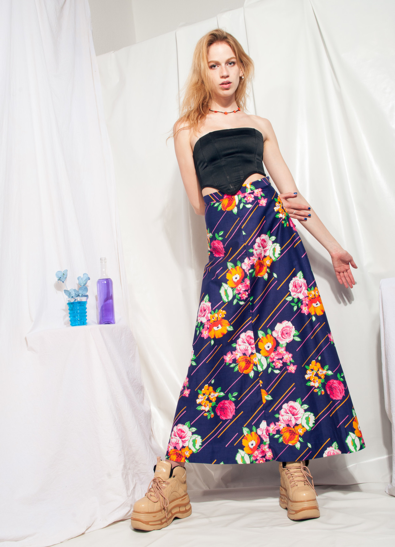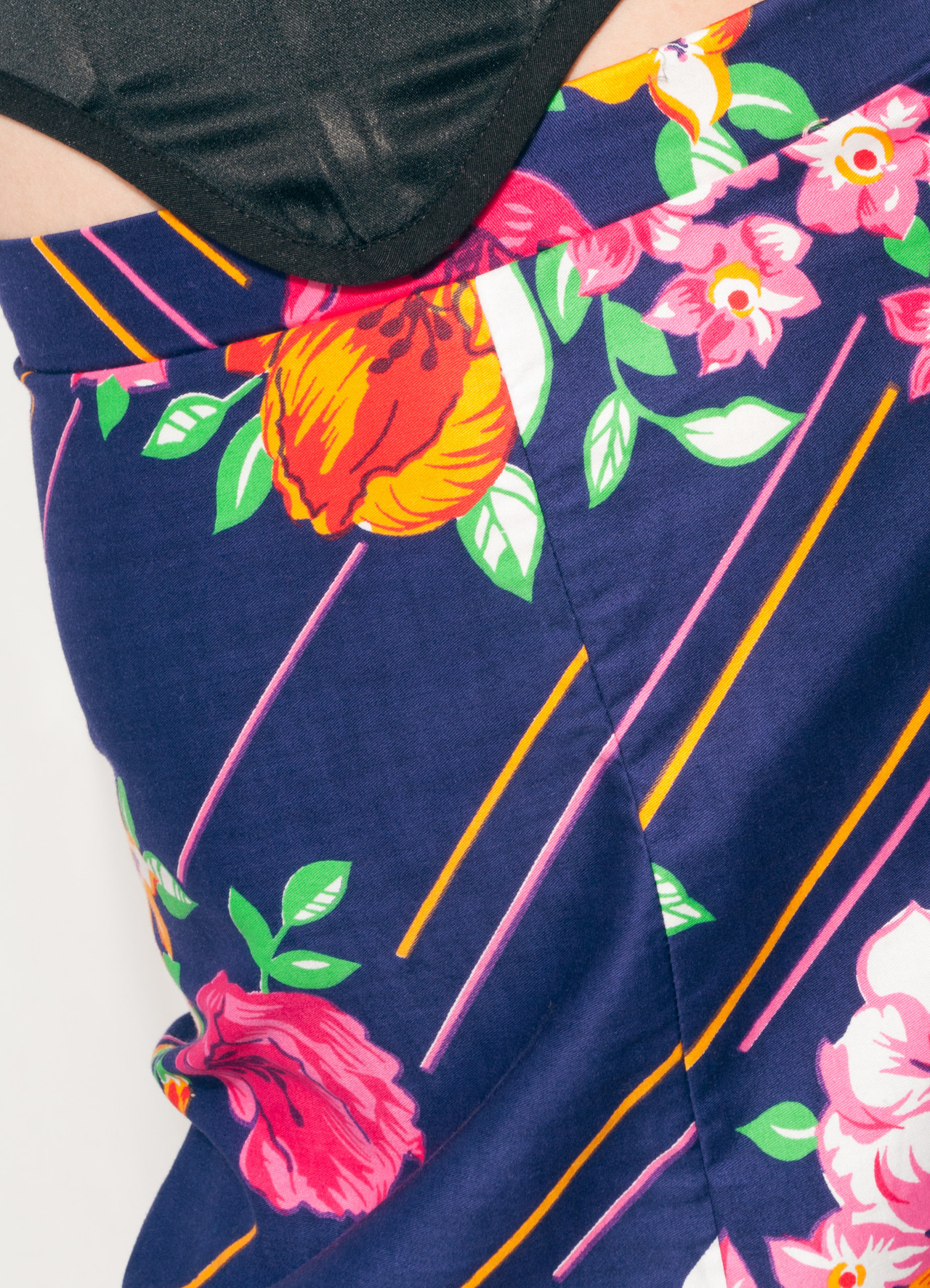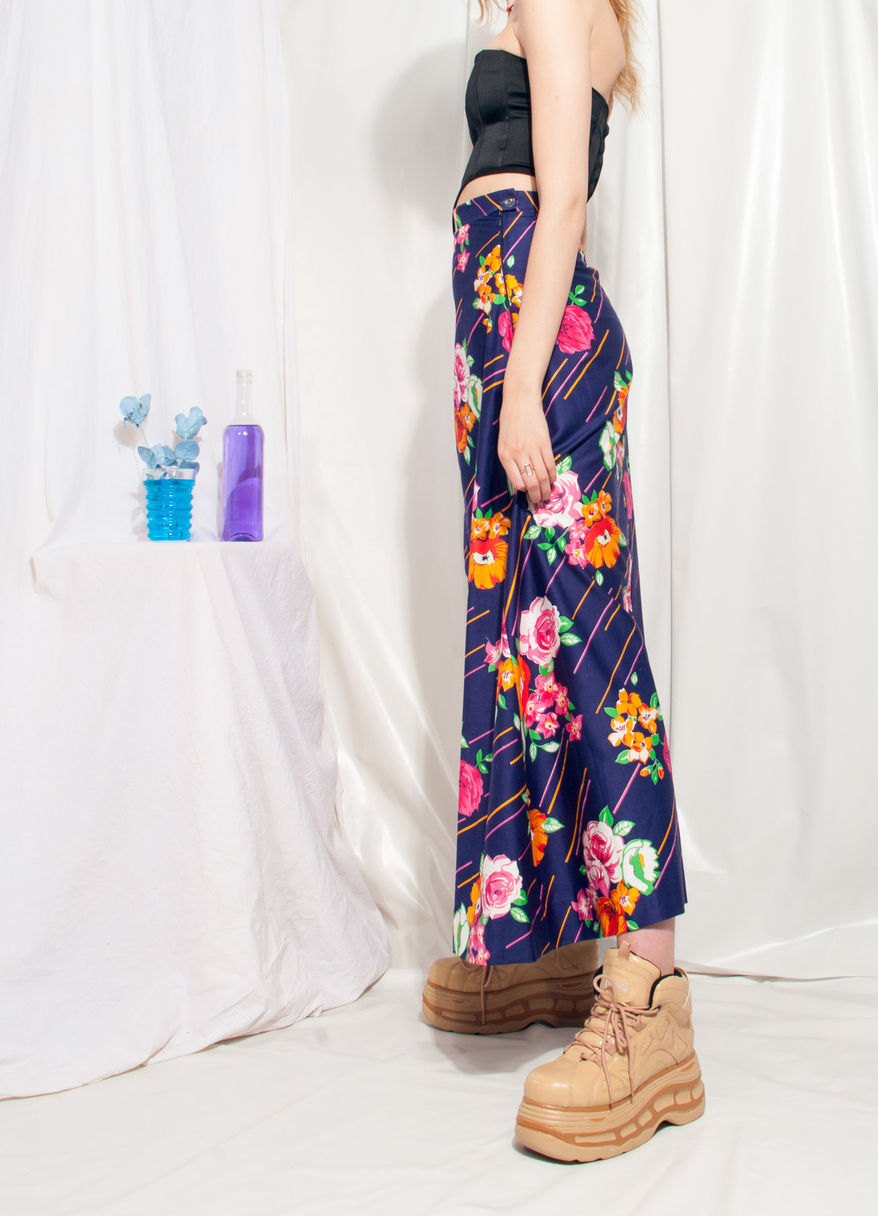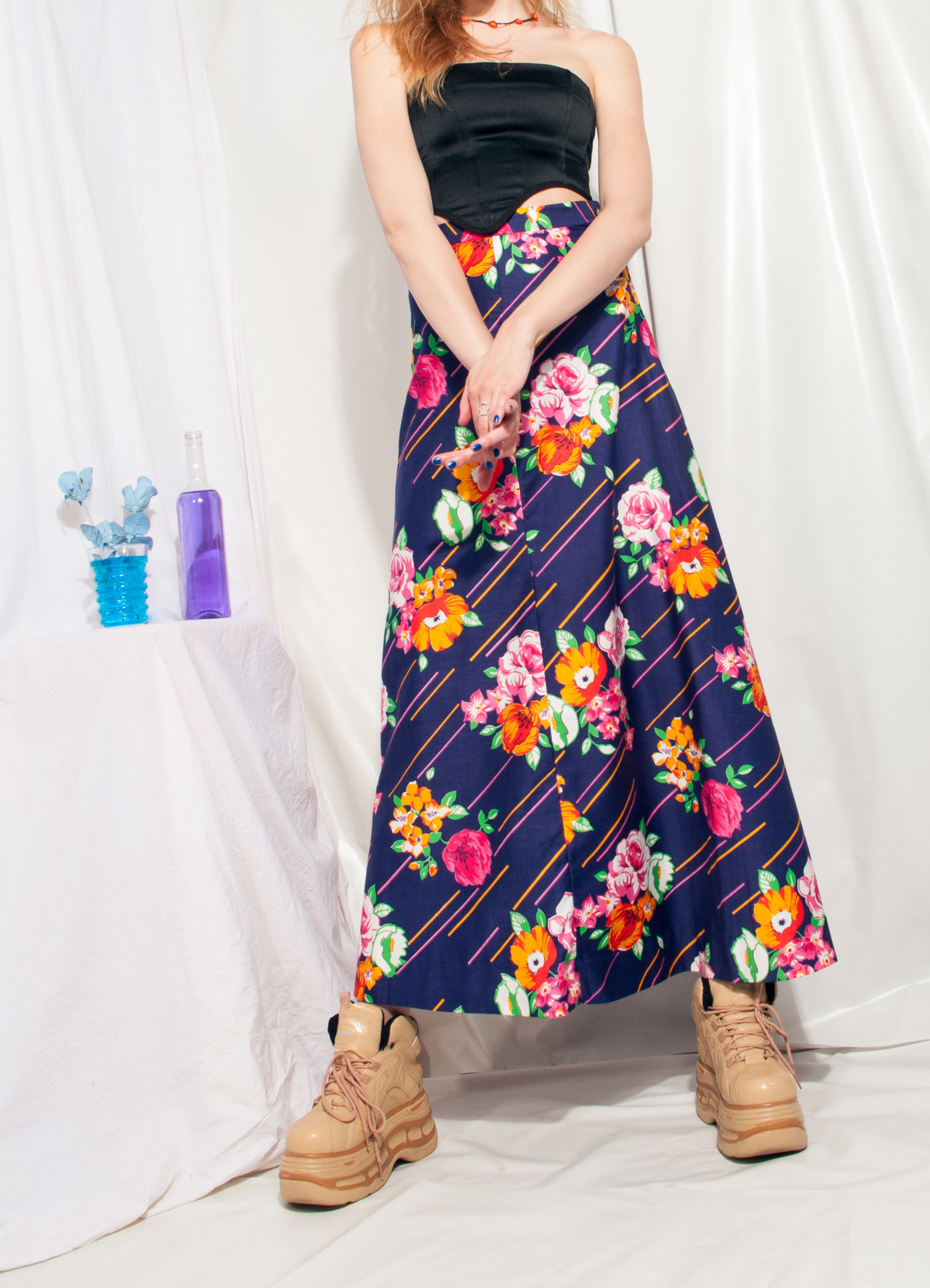 Lovely hippie skirt from the 70s with a lovely floral print. It features button closure at side, natural-feel fabric and the most amazing high-waisted cut.