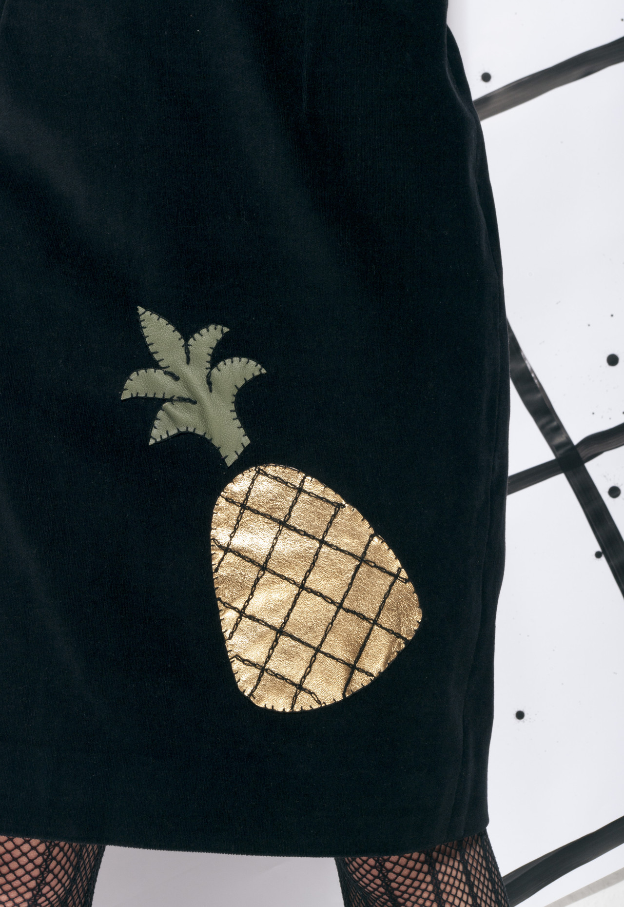 A Pop Sick Revintage skirt with a golden pineapple applied to it by our in-house rework team. The pineapple is made of real leather and it’s hand-embroidered. The skirt is originally from the 70s and it luckily survived in flawless condition. It features a zip closure and natural velvet fabric.