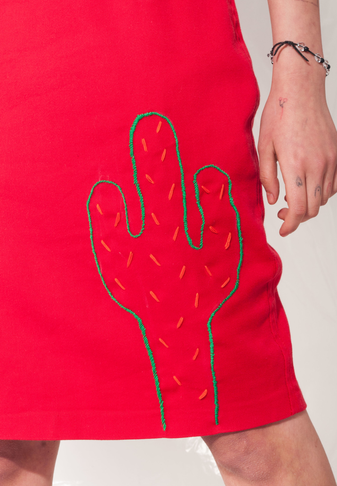 This red vintage skirt came through our time tunnel straight from the sunlit 90s in really good condition but it looked a bit boring, so we hand-embroidered a colour-crushing green cactus on it. It features a zip closure and natural yet easy-to-care cotton blend fabric.