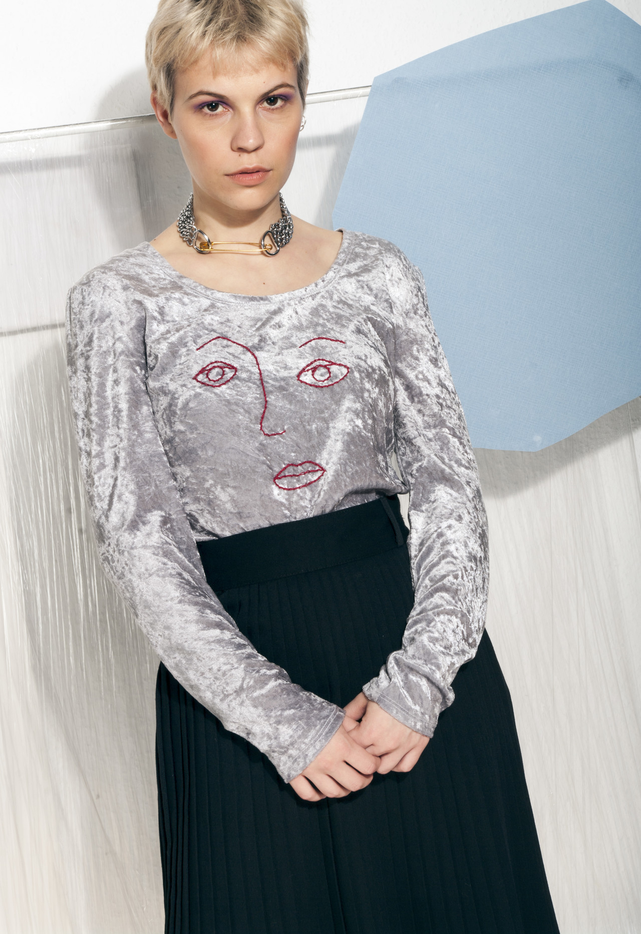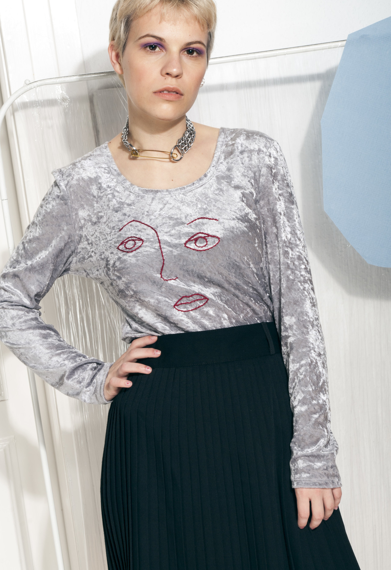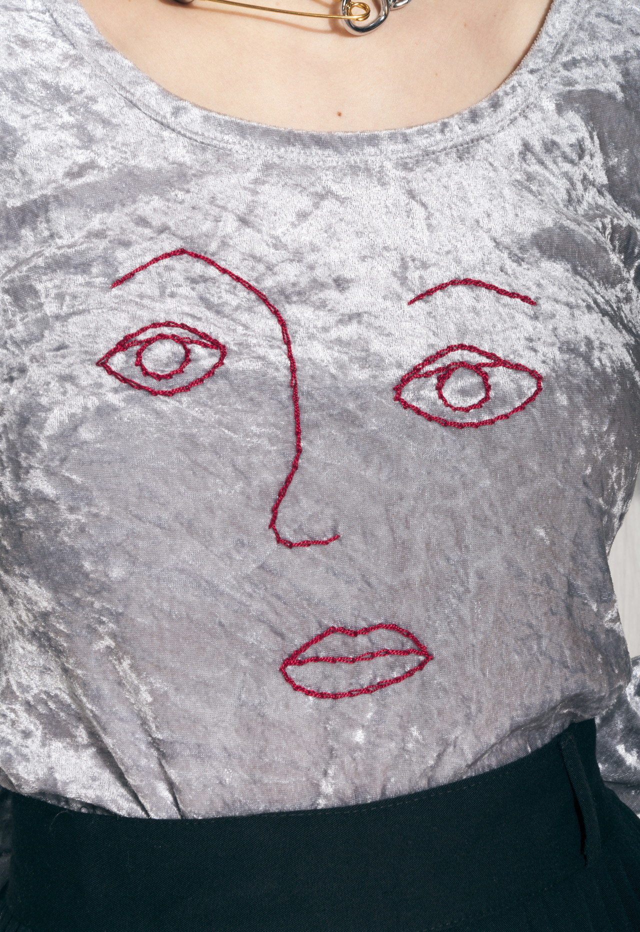 Reworked vintage silver velvet top with a hand-embroidered weird face pattern. It’s a real vintage babe that escaped from the 90s in flawless condition. It’s a one-off piece. Go go go!