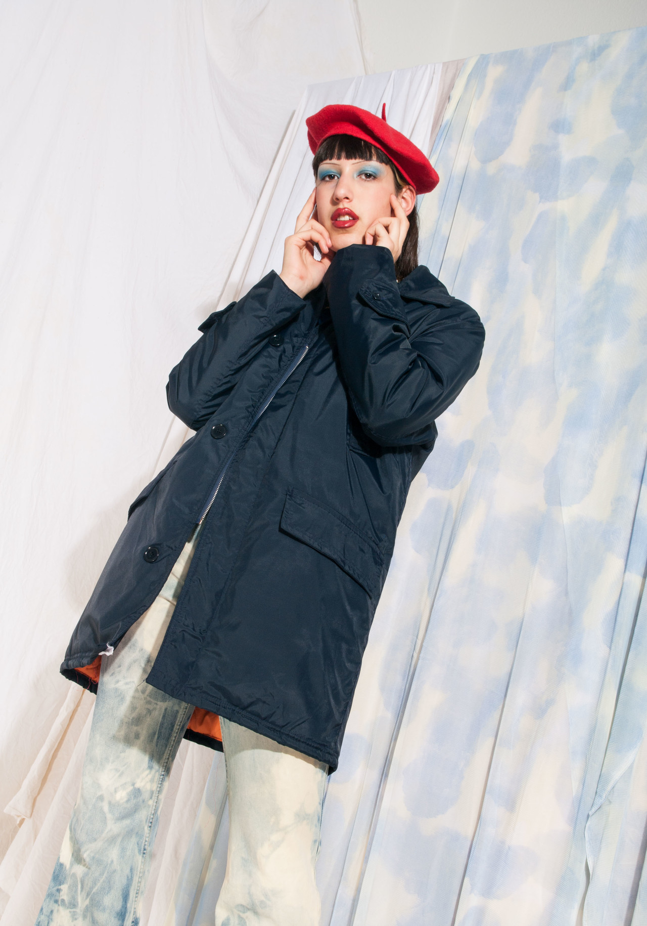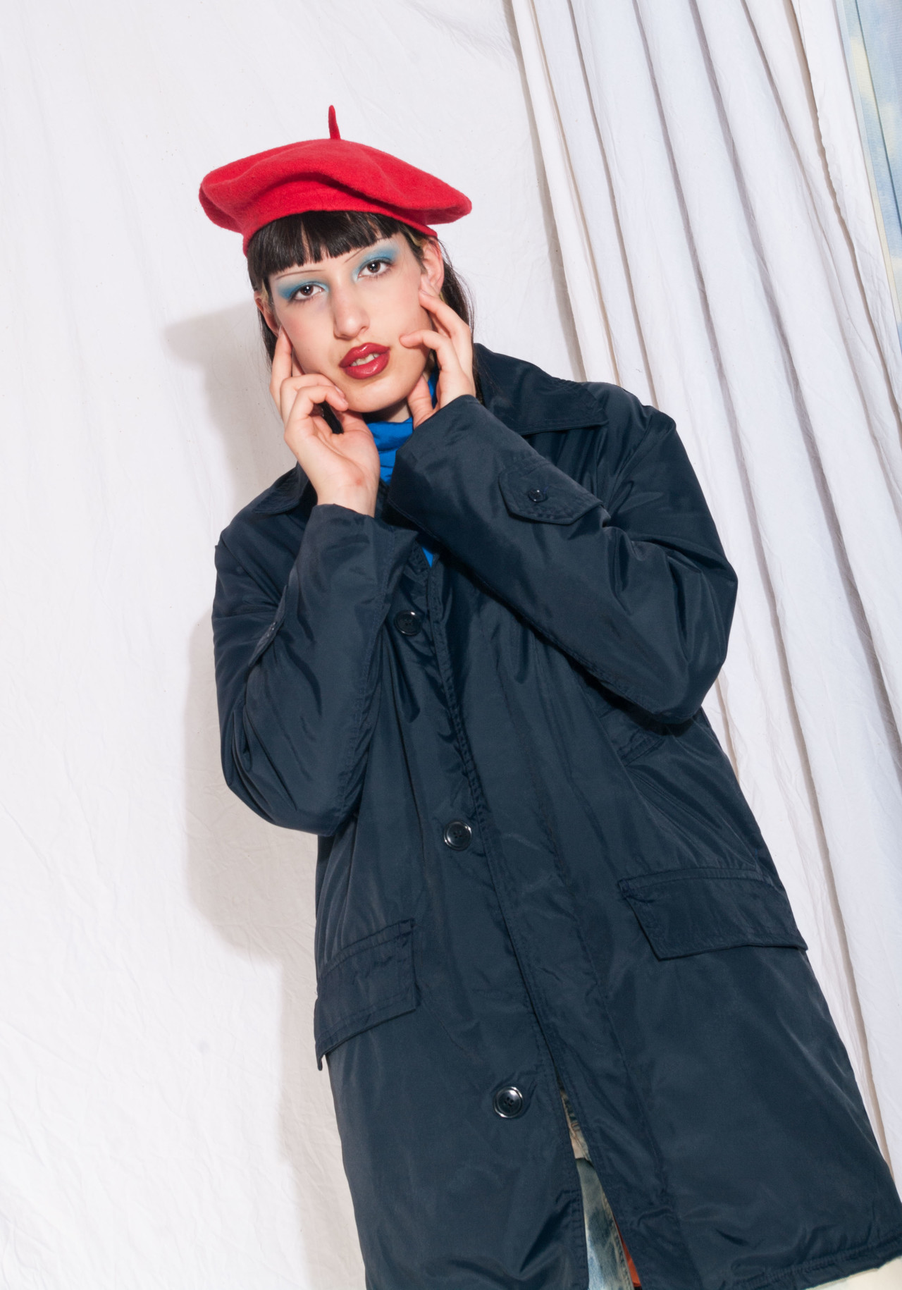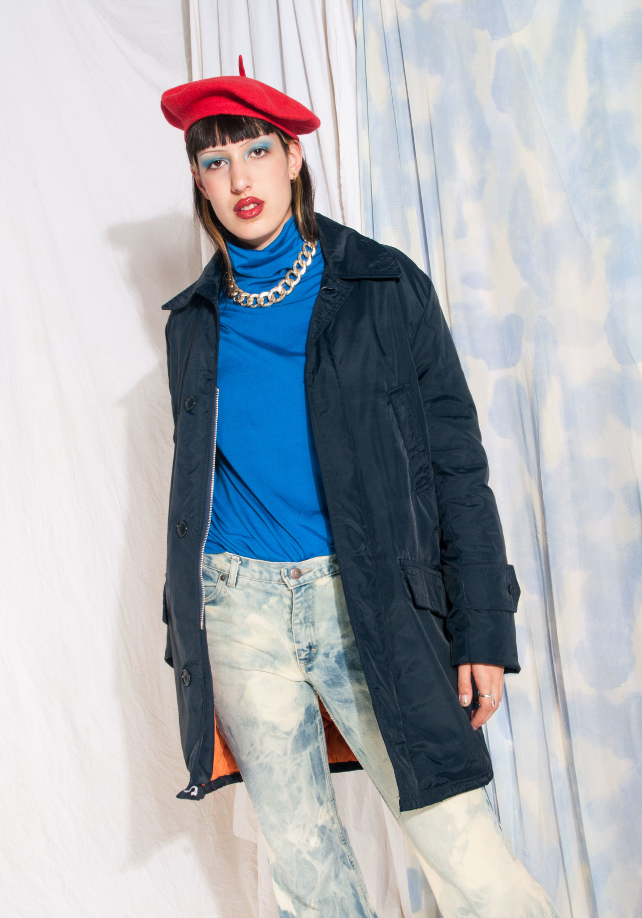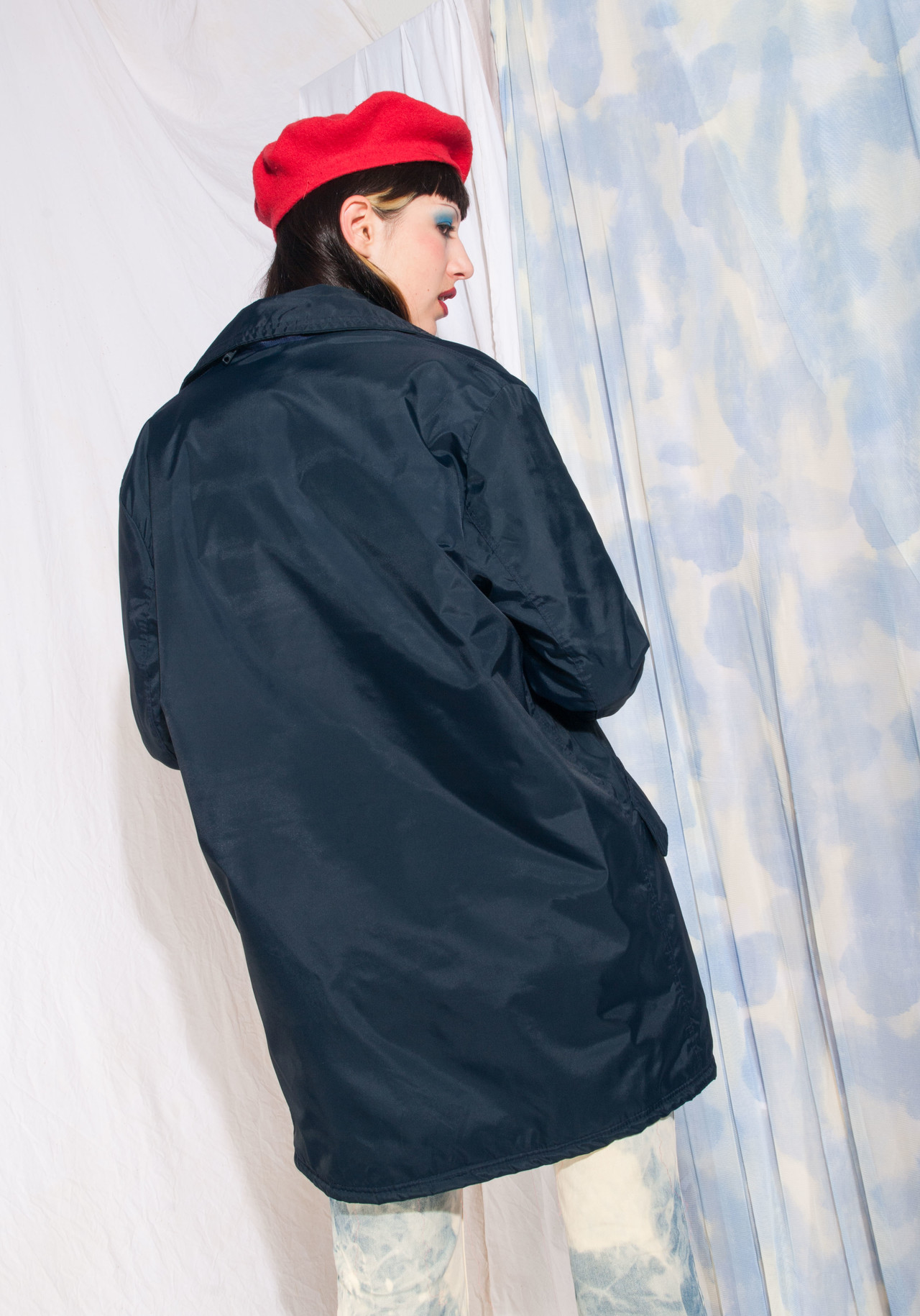 Vintage coat that entered our time tunnel in the 80s and just slipped out here in really good condition. It features blue nylon fabric, zip & button closure and four pockets. It’s fully lined with quilted orange fabric. It’s a unisex piece (made for men originally); we recommend it for an EU size 40 / UK size 12 as a nice oversized fit. Made in Scotland, perfect for mixing with more vintage stuff!