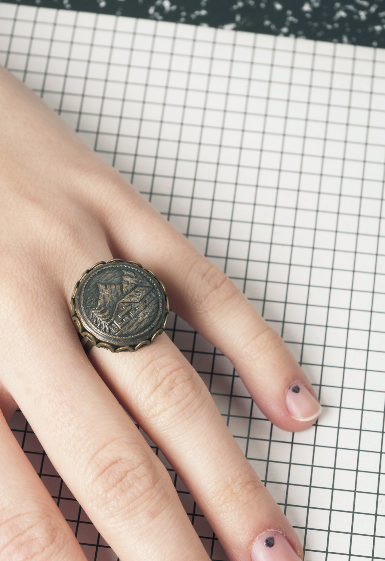 We made this ring from a vintage button that shows a real Twin Peaks scene with two mountains, a pine and a forest house. We glued the carefully polished vintage button to a high-quality adjustable ring base with super strong industrial glue.