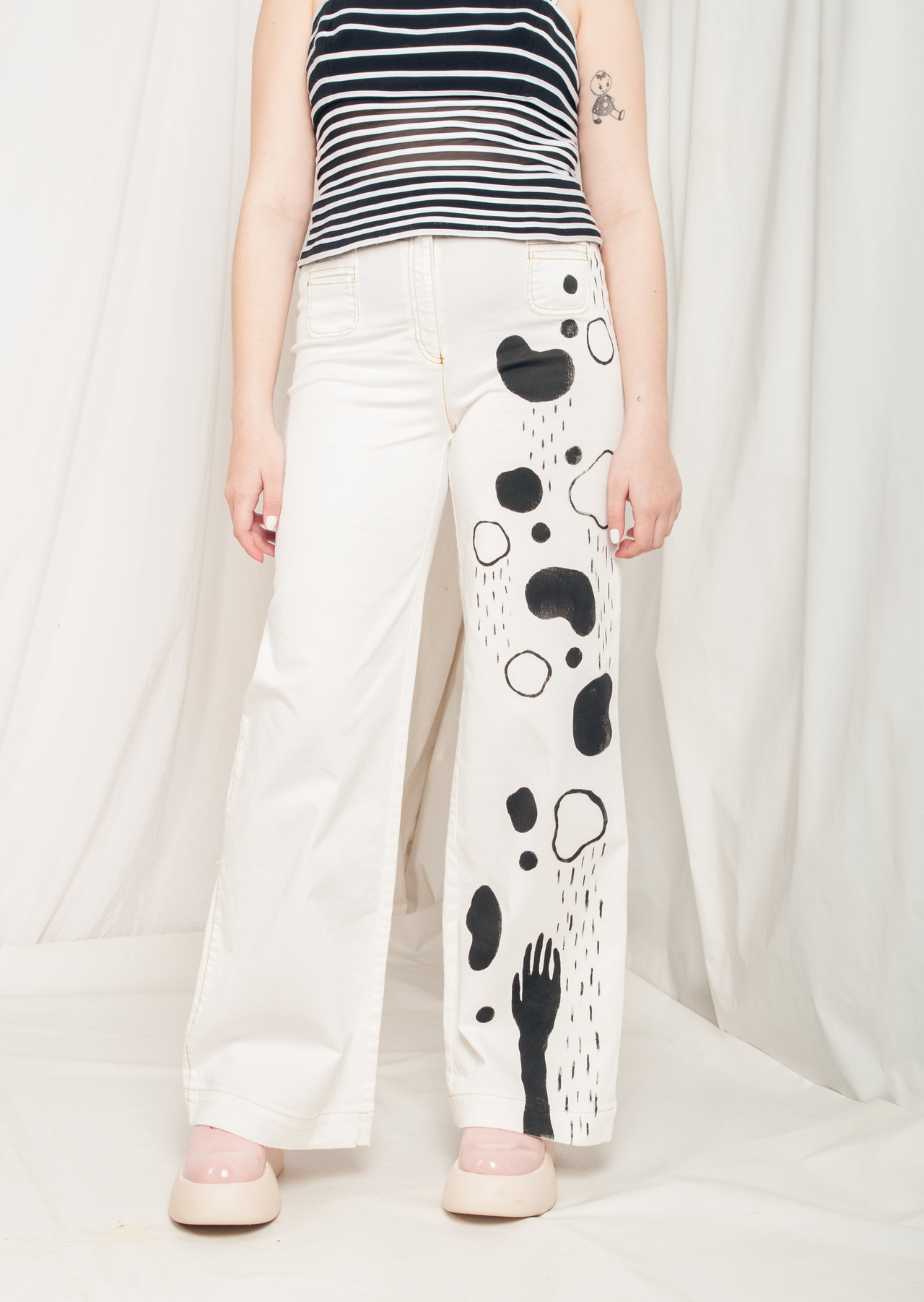 Reworked Y2K wide-leg jeans with hand-painted stencil art Pop Sick patternz, what could be better than this? It’s made of stretchy white denim fabric and comes with five pockets and zip and button closure. Don’t hesitate, grab your daily dose of reworked vintage fashion!