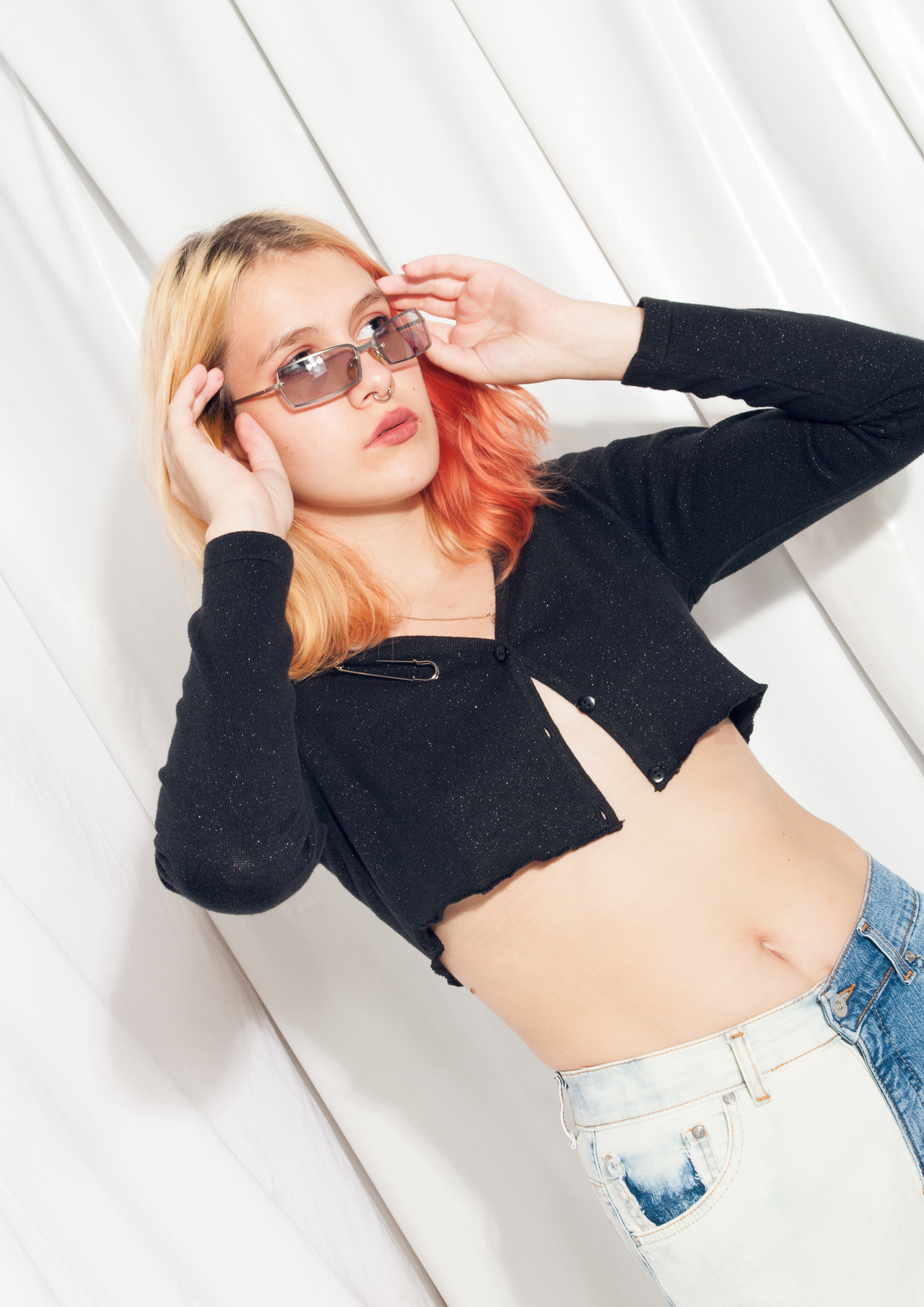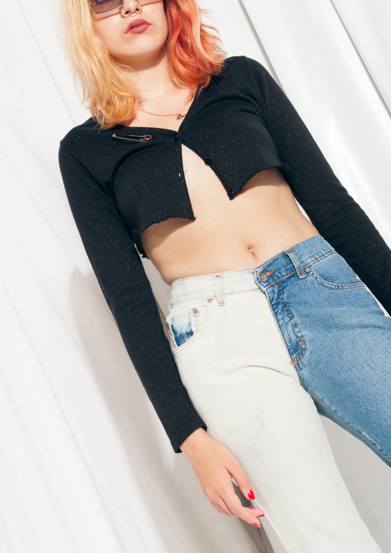 A vintage knit cardigan from the early 2000s, and we even reworked it for you: it has a cropped length with lettuce hem finish & a huge safety pin now. Although time travel is a bit exhausting, this piece withstood the test of time in mint condition. It features natural-feel black fabric and button closure. Let’s get sustainable – switch to vintage now!