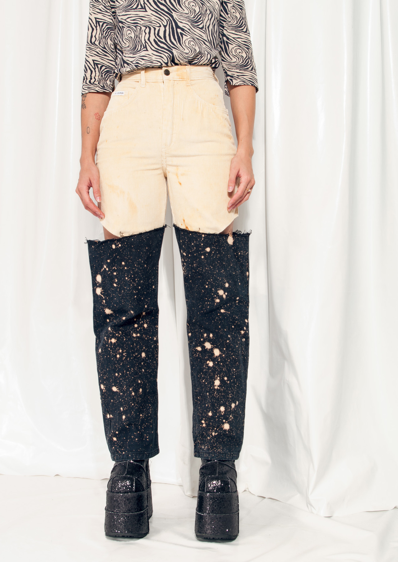Insane reworked vintage trousers made by us in our small home studio. We matched a pair of 80s Lee pants with the legs of shiny 90s jeans to get this rad look. The Lee trousers are extra high-waisted and we rust dyed them, the jeans are bleach-painted. This one-off gem features five pockets and a zip closure.