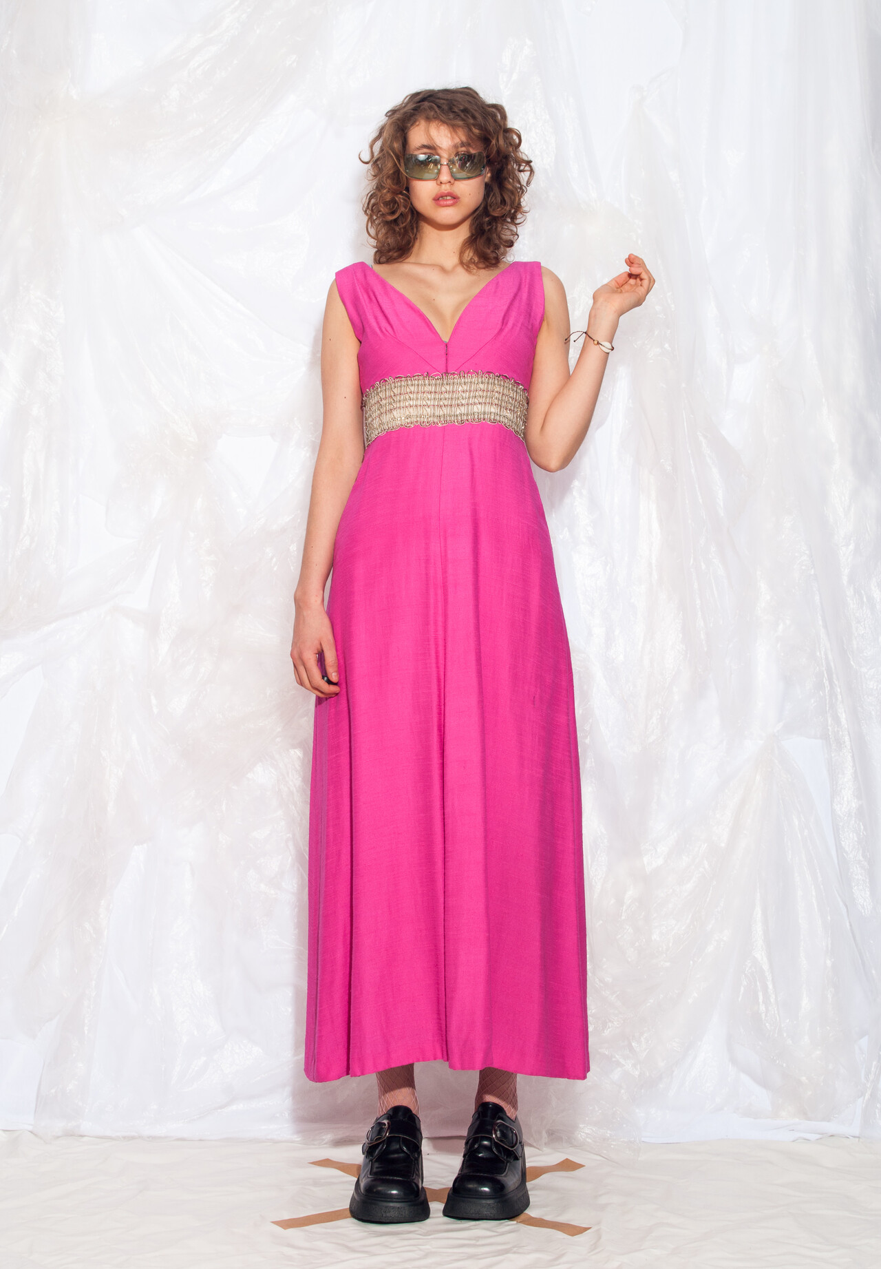 This stunning pink maxi dress escaped from the 70s in great vintage condition. It has a golden woven waist, zip closure and pink lining. Its fabric is heavy, natural and it’s non-stretchy.