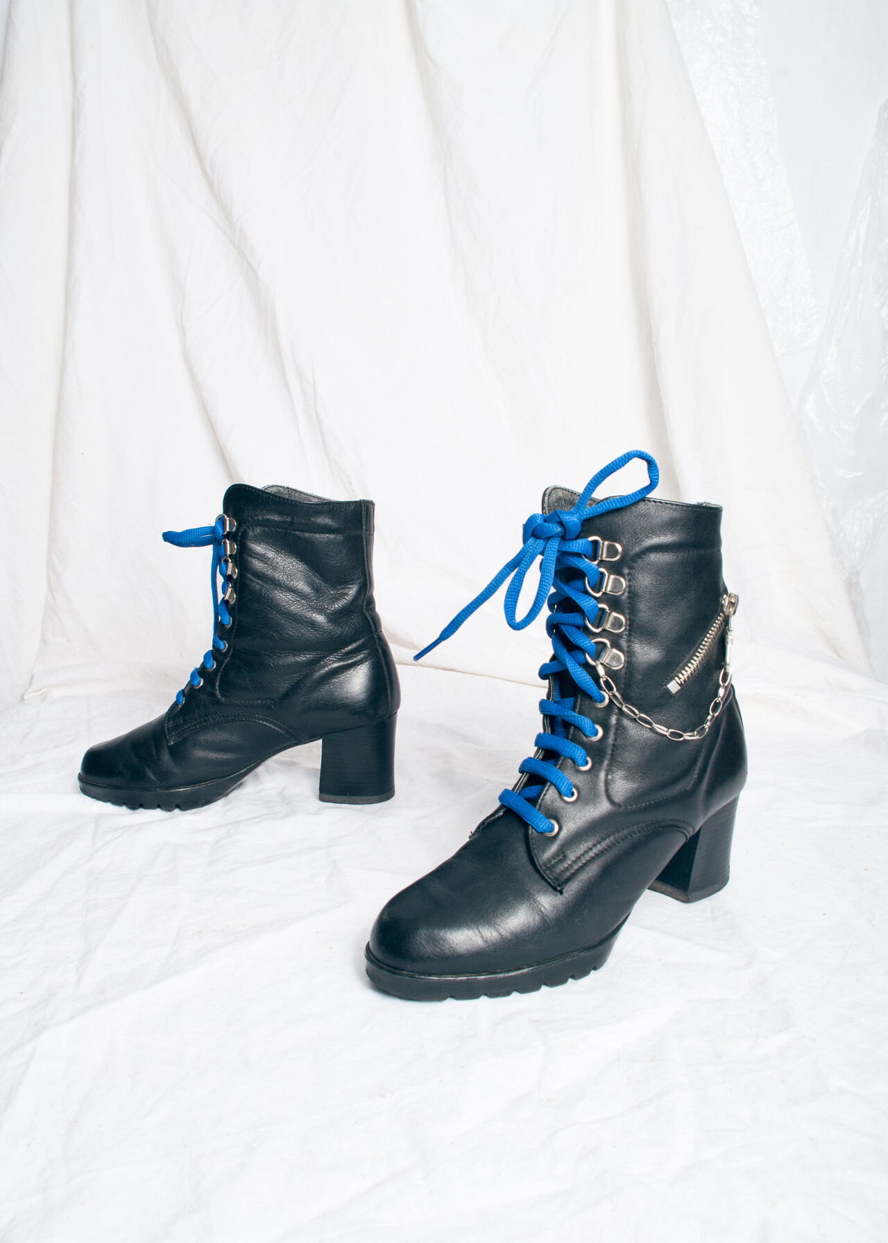 Vintage boots from the sunlit 90s still in good condition — the genuine leather outside is flawless but on the inside, the faux leather lining is quite worn out (check the pics!). We cleaned it for you & added the blue laces and the silver chain.