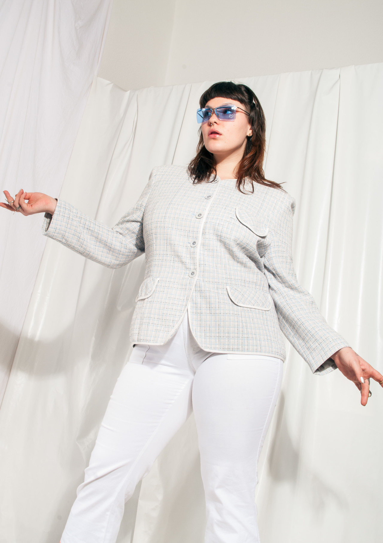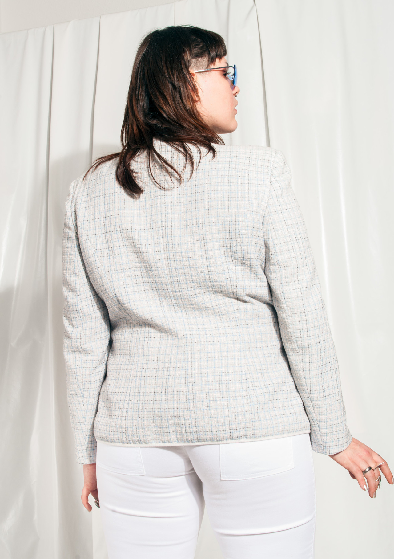 Checked blazer from the Millenium era in great condition. Closes with buttons at front. Beware, those pockets on the front are fake. The fact that it’s fully lined is not fake. Our daily styling advice: pair this with even more 2000s fashion gems for a rad vintage aesthetic look.