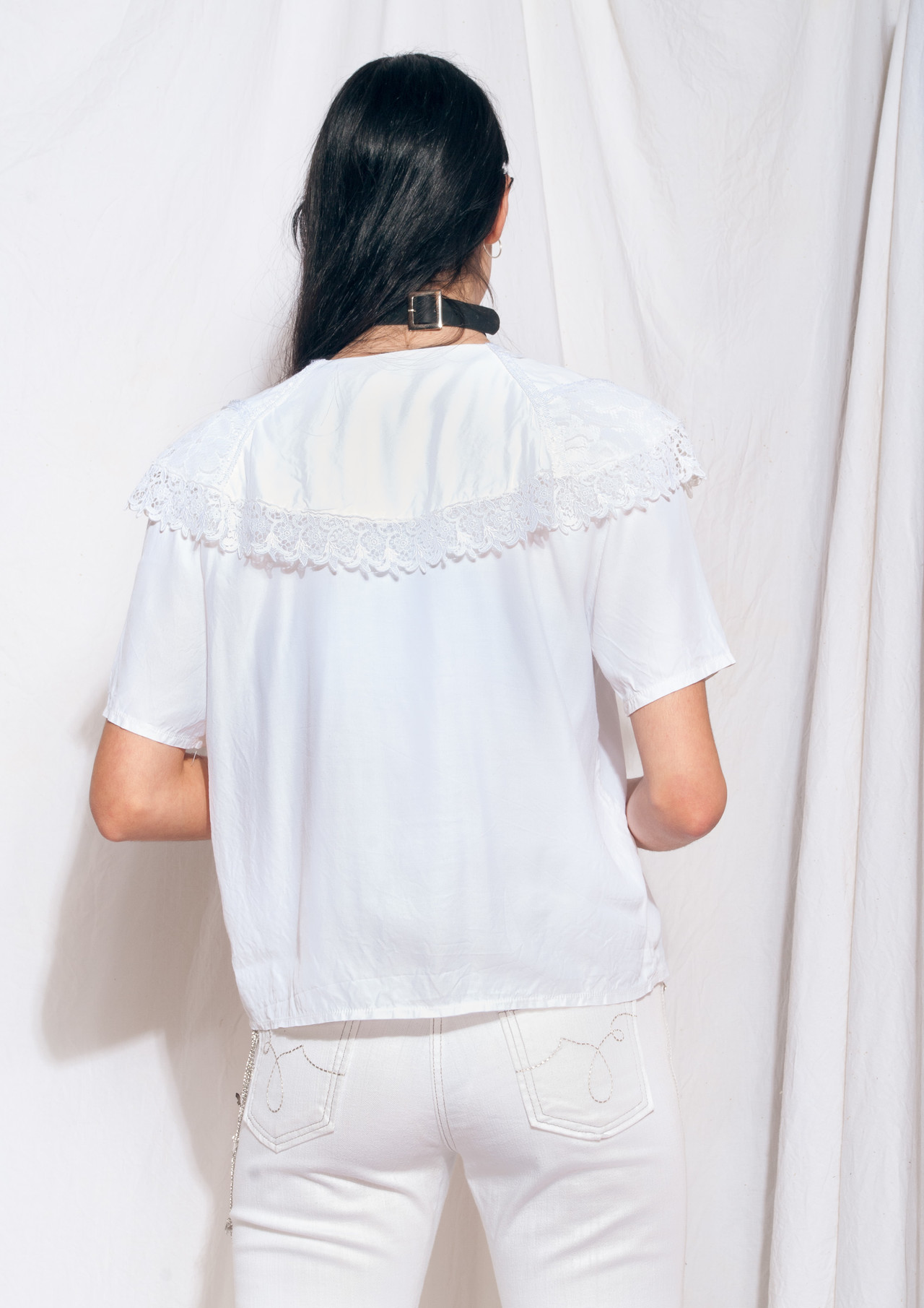 Vintage Blouse 80s Wide Collar Lace Frill Top in White