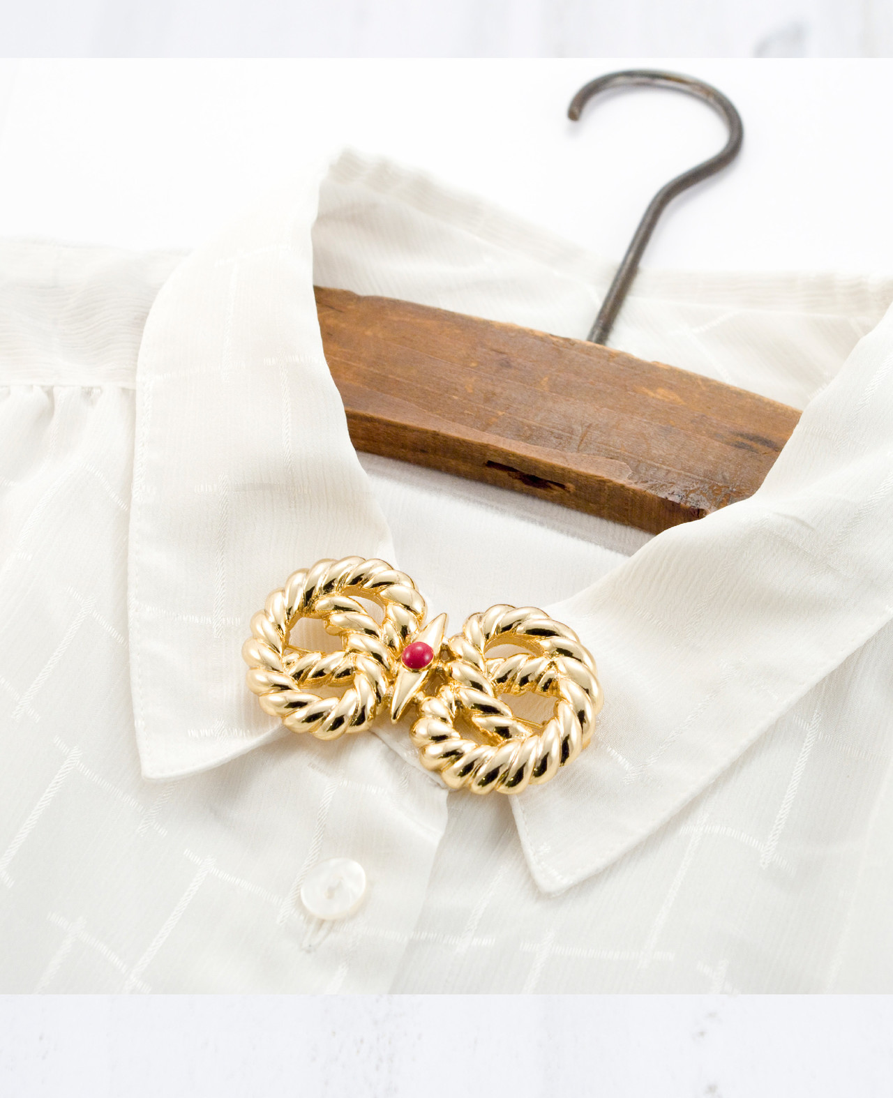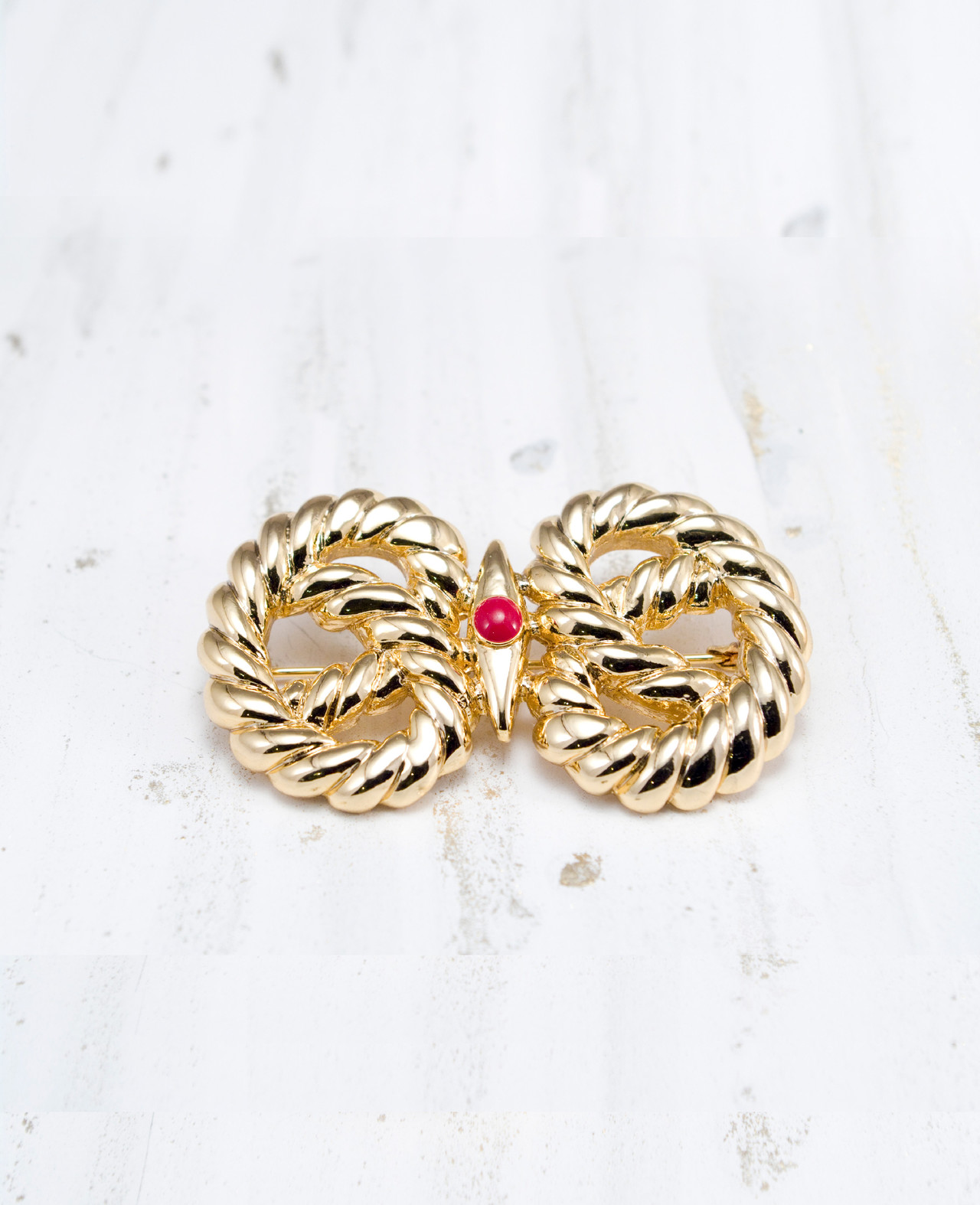 Golden plated pretzel shaped brooch from the 80s with a tiny red bead in the middle. Vintage, but still new: it came to light in a warehouse after many years.