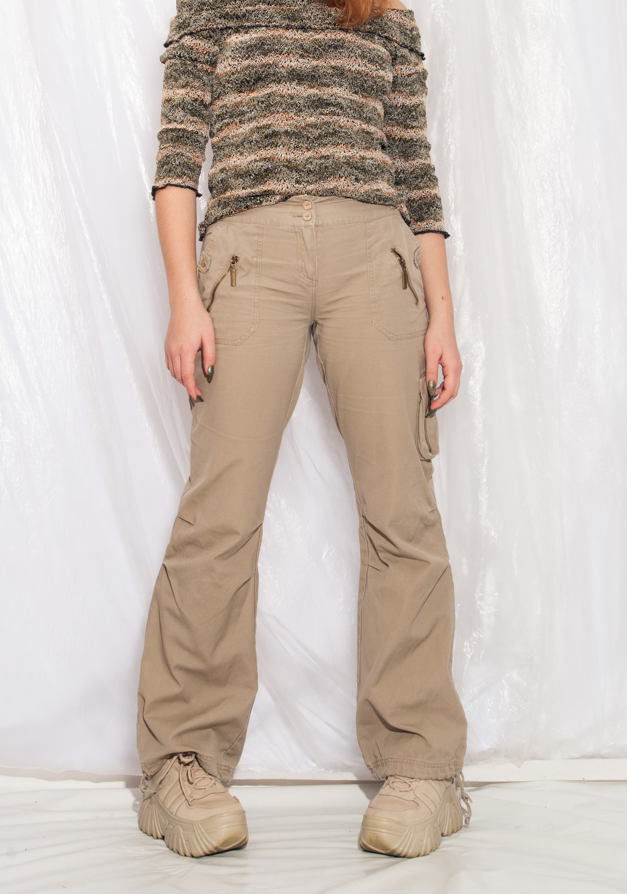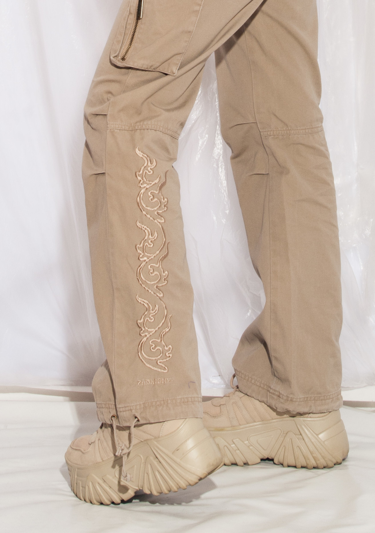 Vintage cargo trousers with flame embroidery on the leg, a real Y2K gem still in mint condition. This babe is made of beige cotton and features drawstring at legs, five pockets and a zip closure. Did you know that the most sustainable type of fashion is vintage fashion?