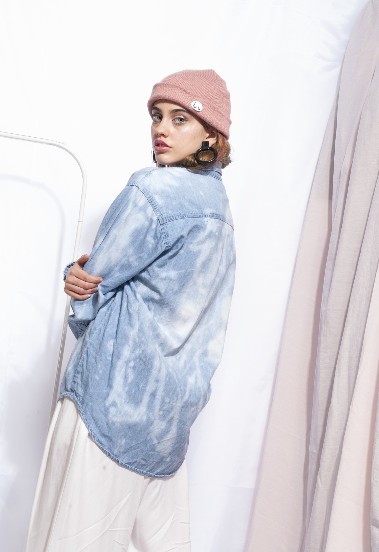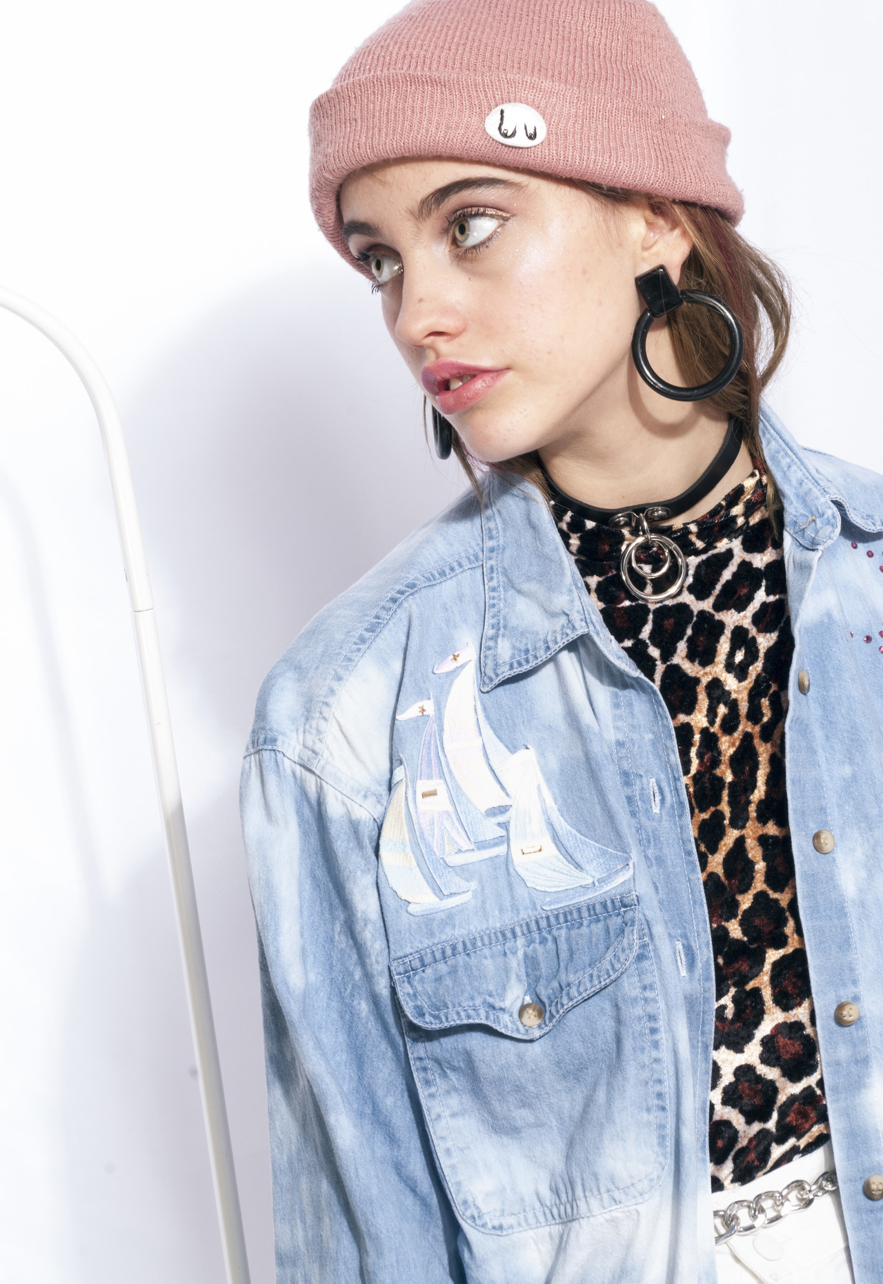 Oversized vintage denim shirt with embroidered ships and some rhinestones on the front. We bleached it to get this cloudy pattern, so it looks as if the ships were sailing through the sky. Pockets & button closure on the front.