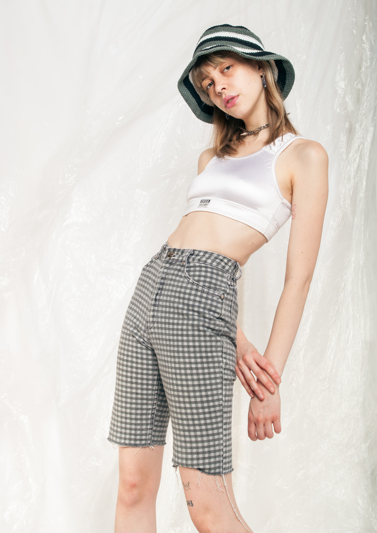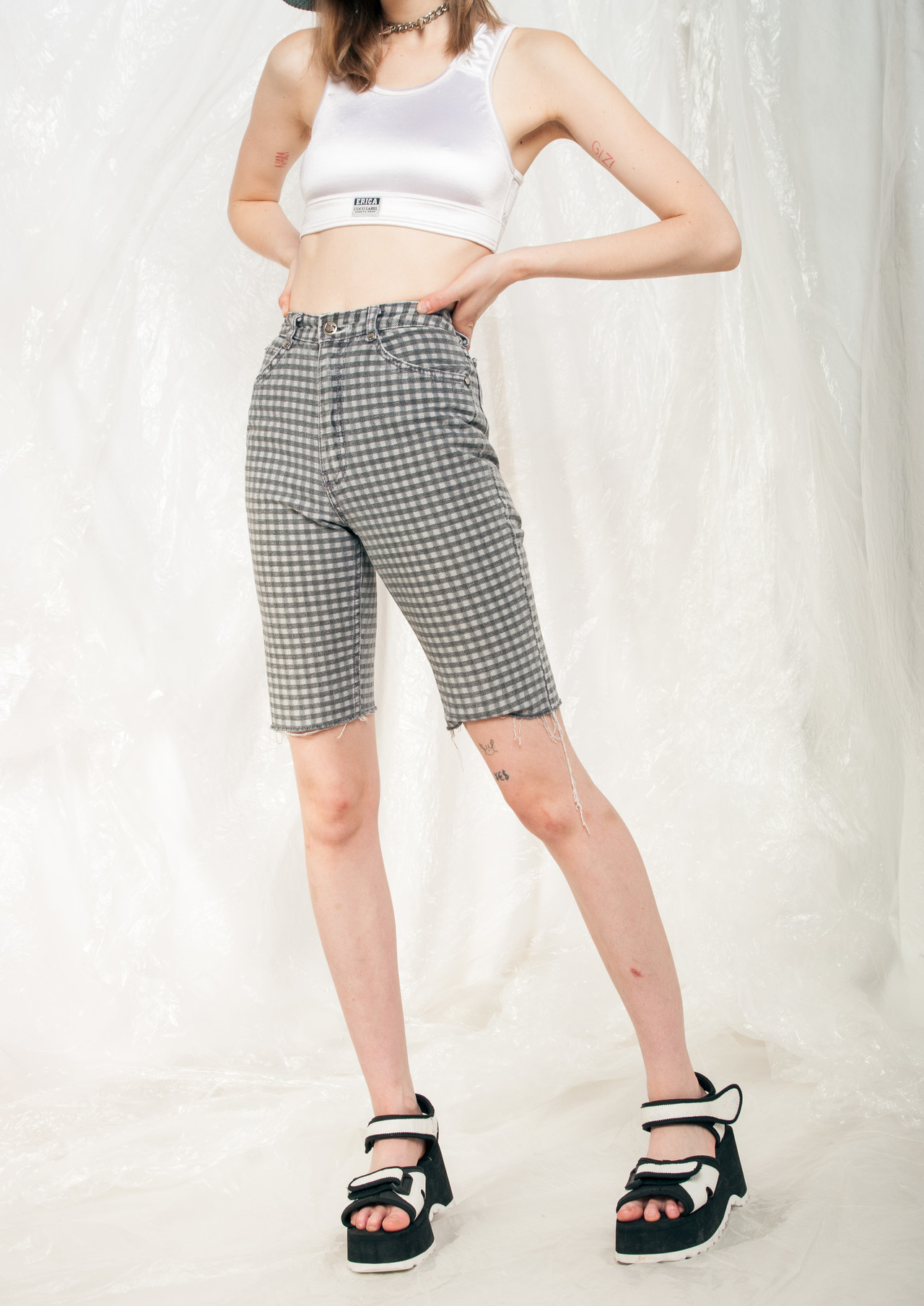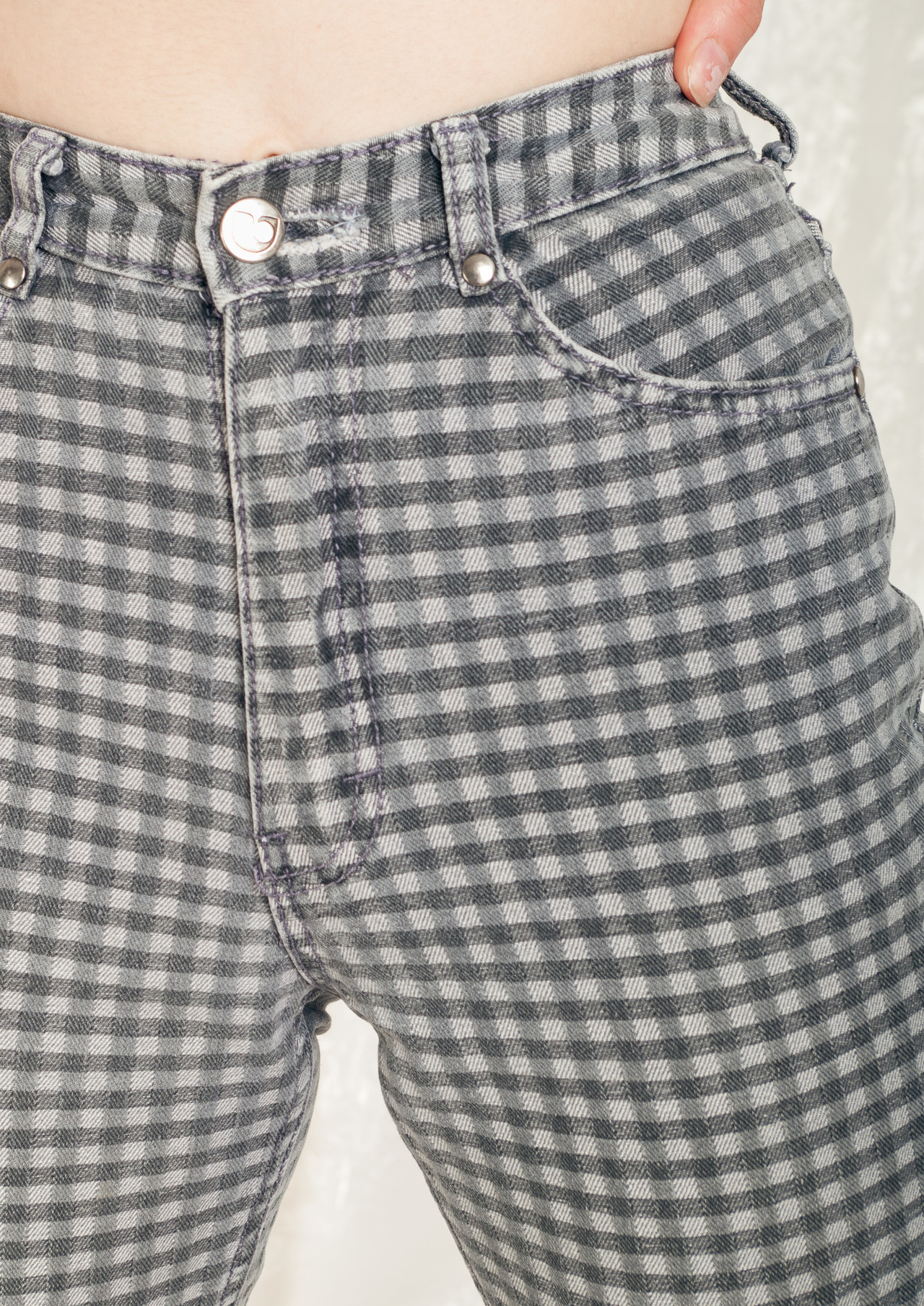 Vintage denim shorts in great condition even though they are from the early 90s! This babe rocks grey gingham fabric, five pockets, a high-rise cut and a zip closure.