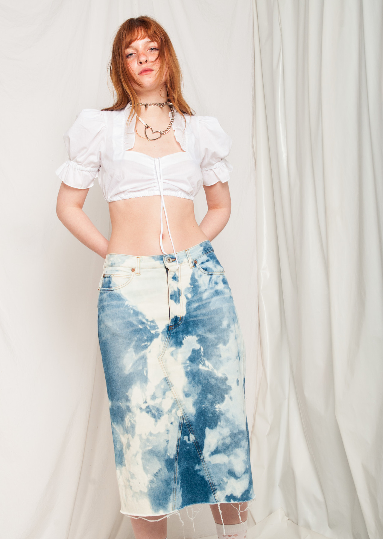 Look at that, a vintage skirt that escaped from the 2000s and it’s still in good condition! It’s a one-off reworked piece: we bleach-dyed and cropped it. It features blue denim fabric, five pockets and a zip closure. This gem radiates the true vintage aesthetic we all crave for. Go, go, go!