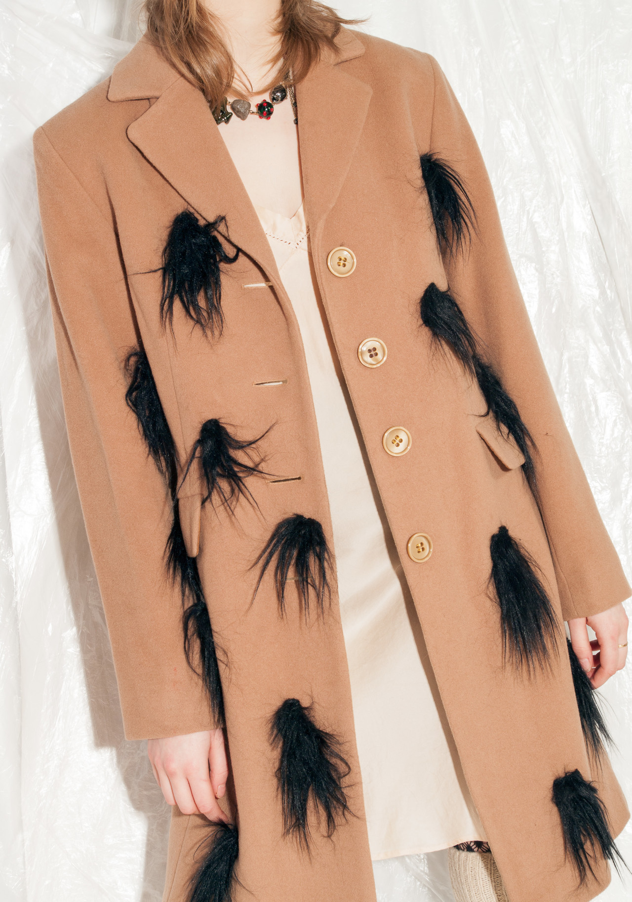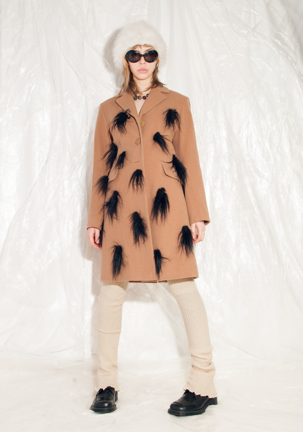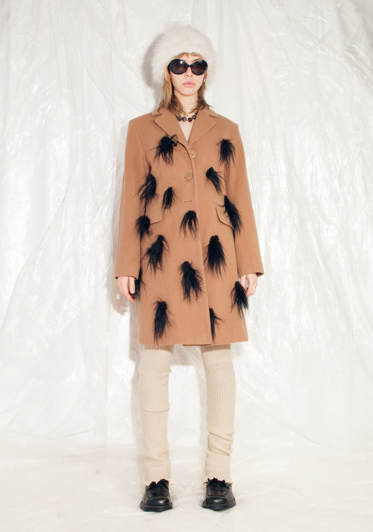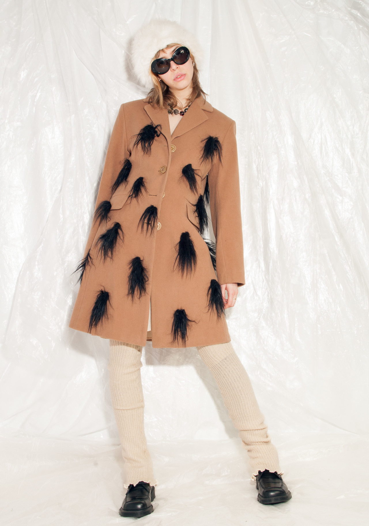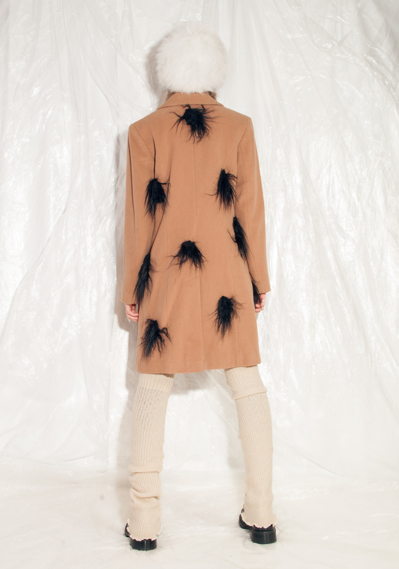 Reworked furry 90s vintage wool coat still in mint condition. Made of soft brown wool blend fabric, this babe comes with three pockets and a button closure. We hand-sewed the faux fur patches on it. Get this one-off gem before someone else does!