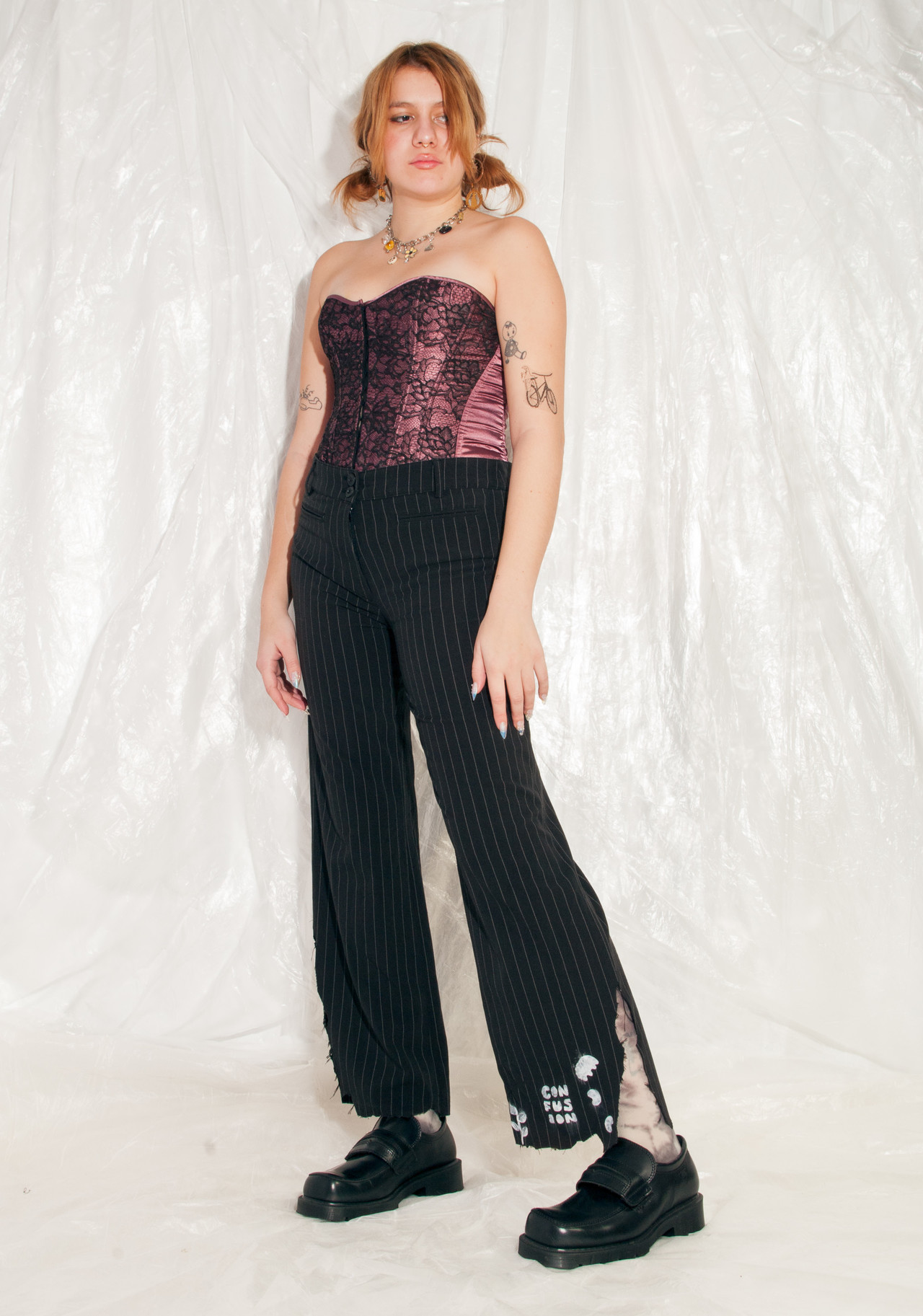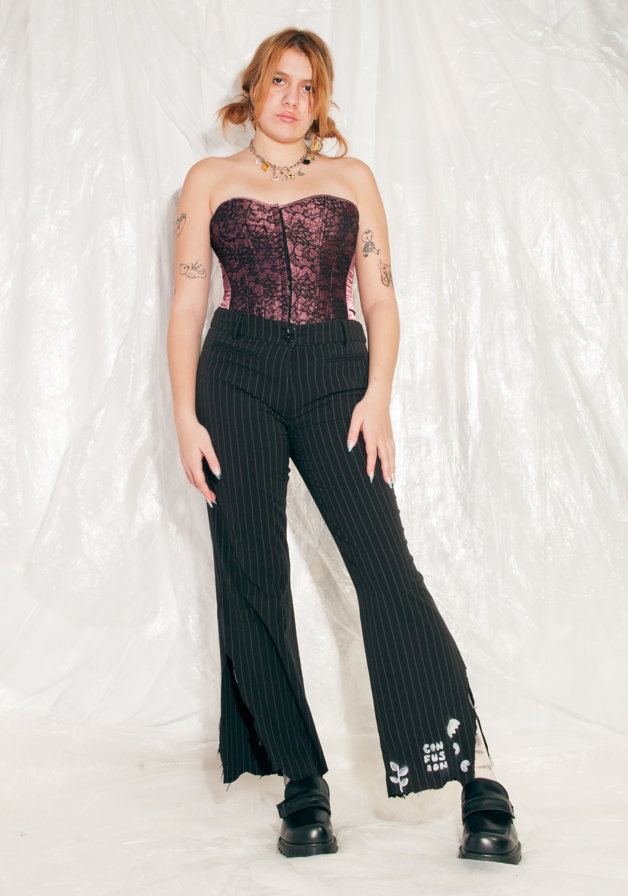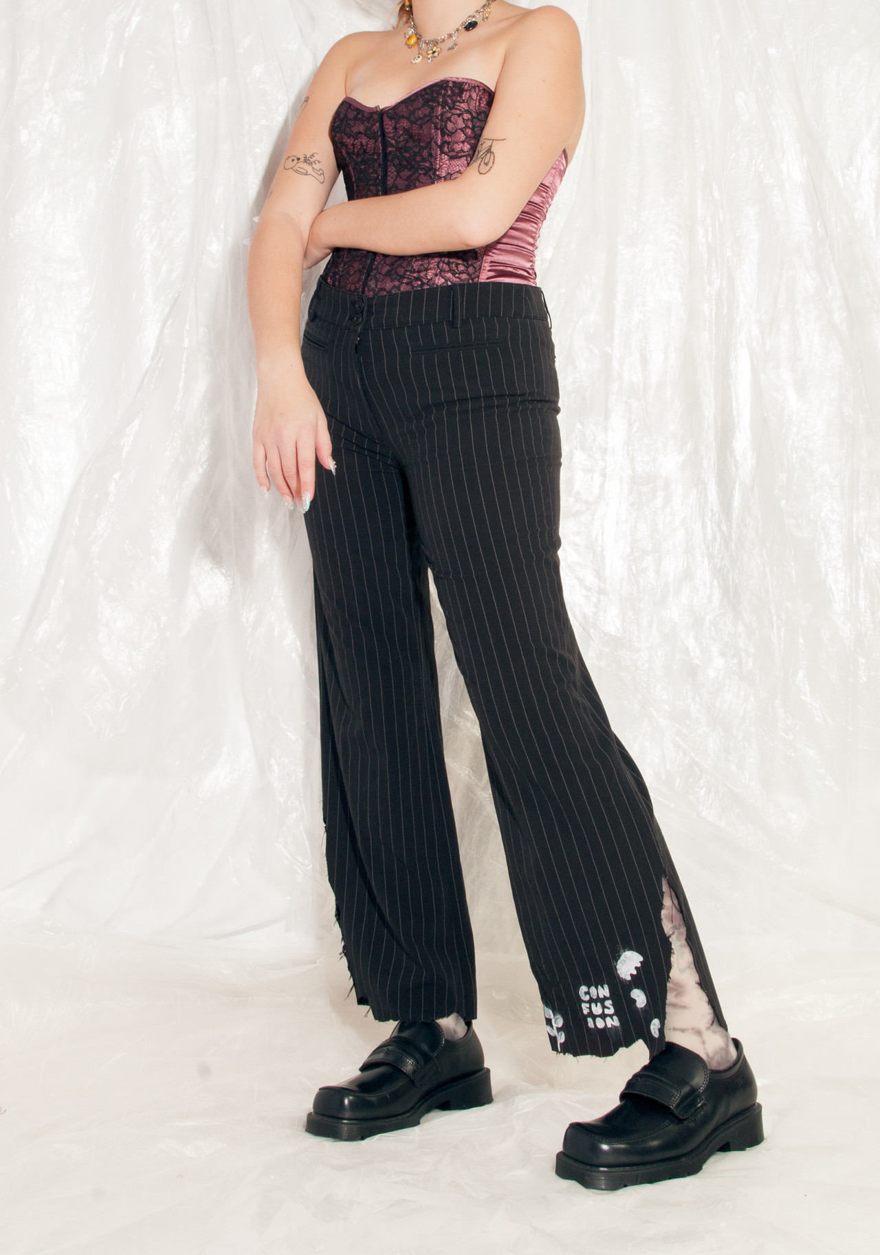 Reworked Y2K vintage flare trousers still in mint condition. We shredded its hem and hand-painted it. As we used industrial textile paint, it’s machine-washable. The pants themselves feature pinstriped black fabric, four pockets and a zip closure. Skip fast fashion, wear vintage!