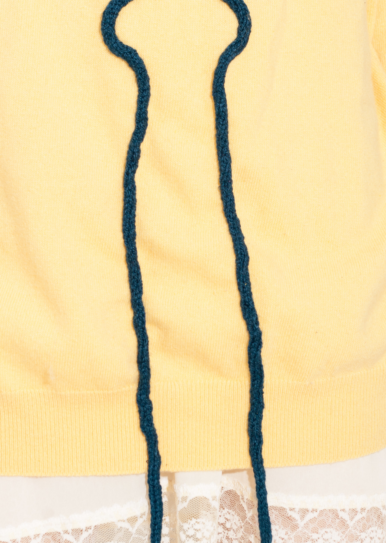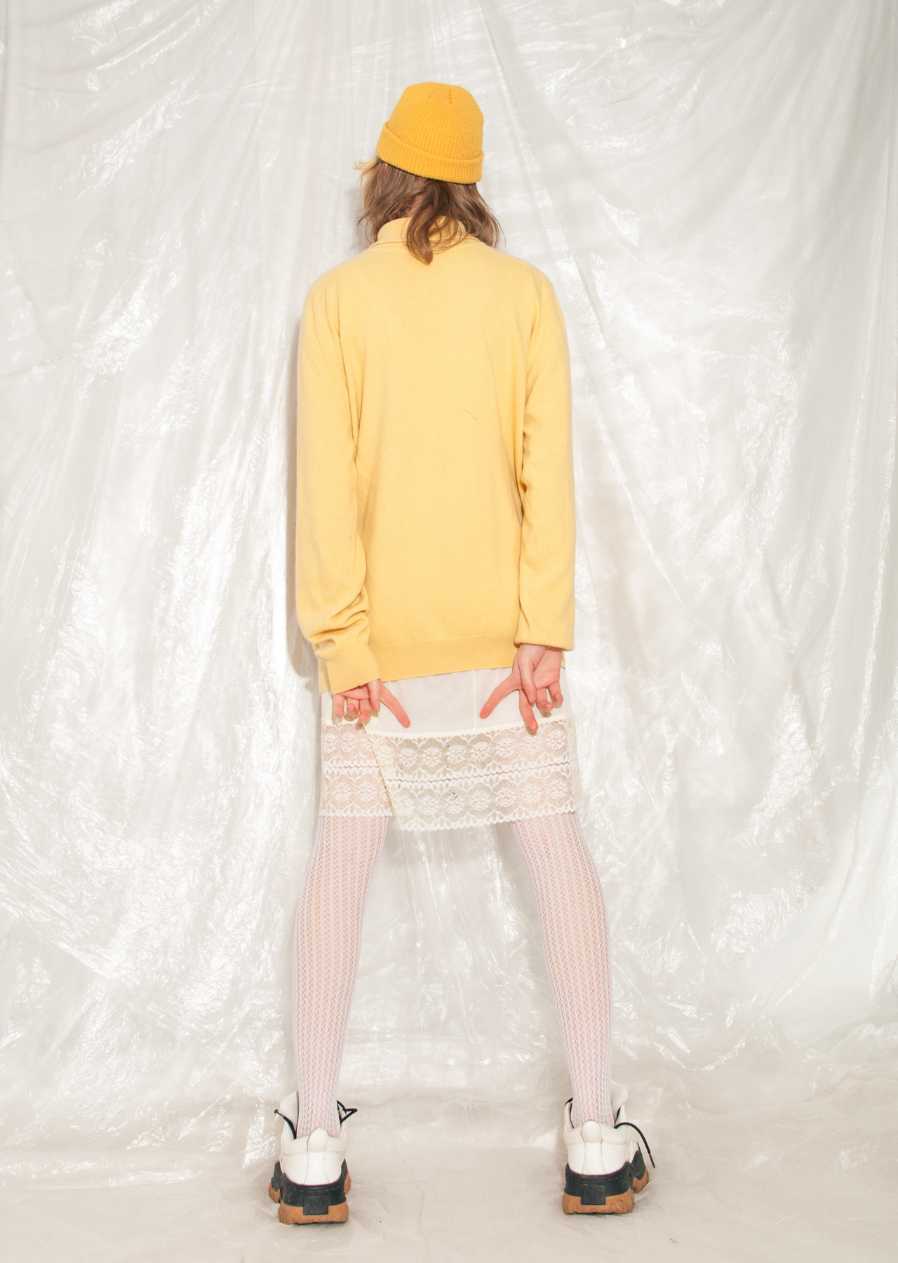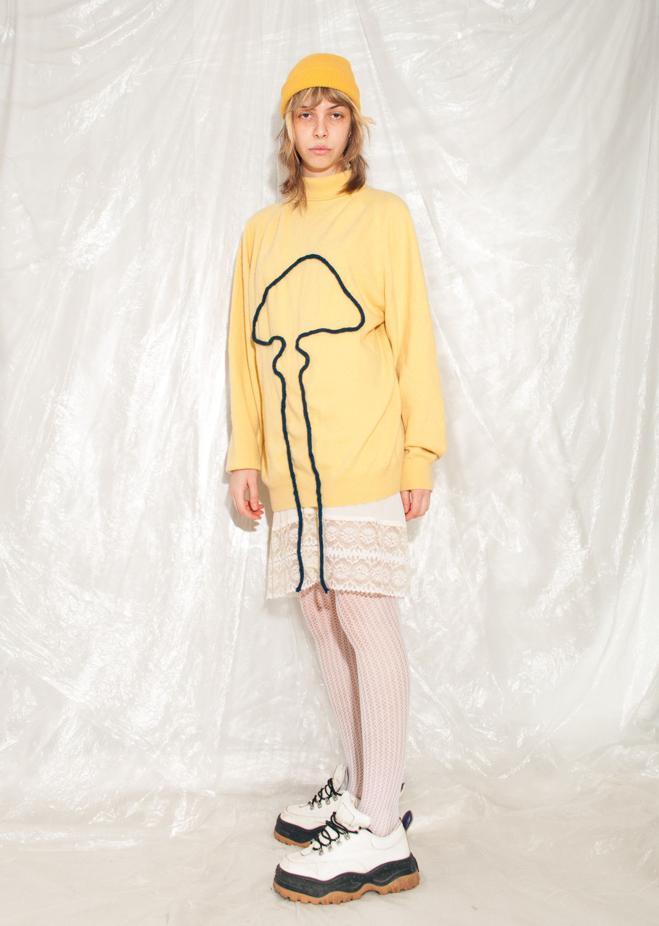 Reworked vintage knit jumper, a real 80s gem in mint condition. It’s a one-off piece that we decorated with a knitted ribbon — the mushroom is hand-sewn on the jumper. The sweater itself was made in Scotland from the softest yellow cashmere and rocks a nice oversized cut. Go, go, go!