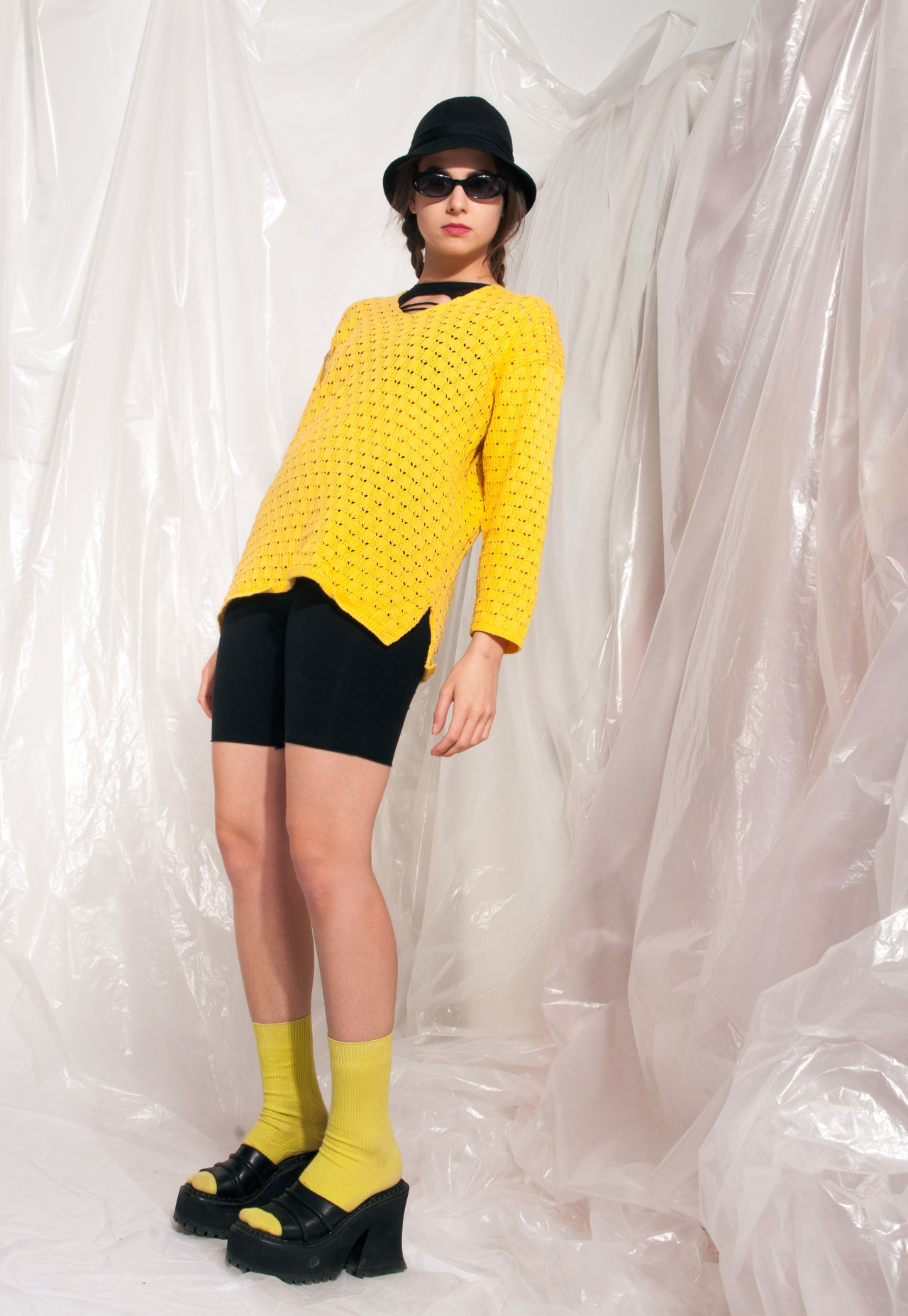 Vintage knit jumper 90s yellow openwork crocheted sweater