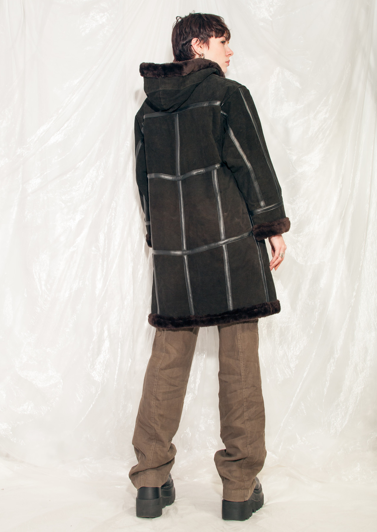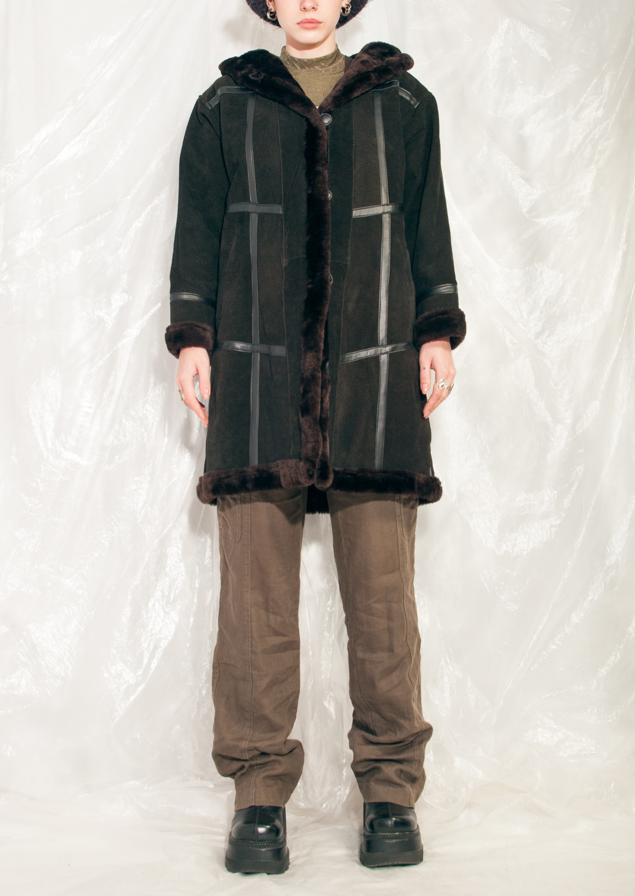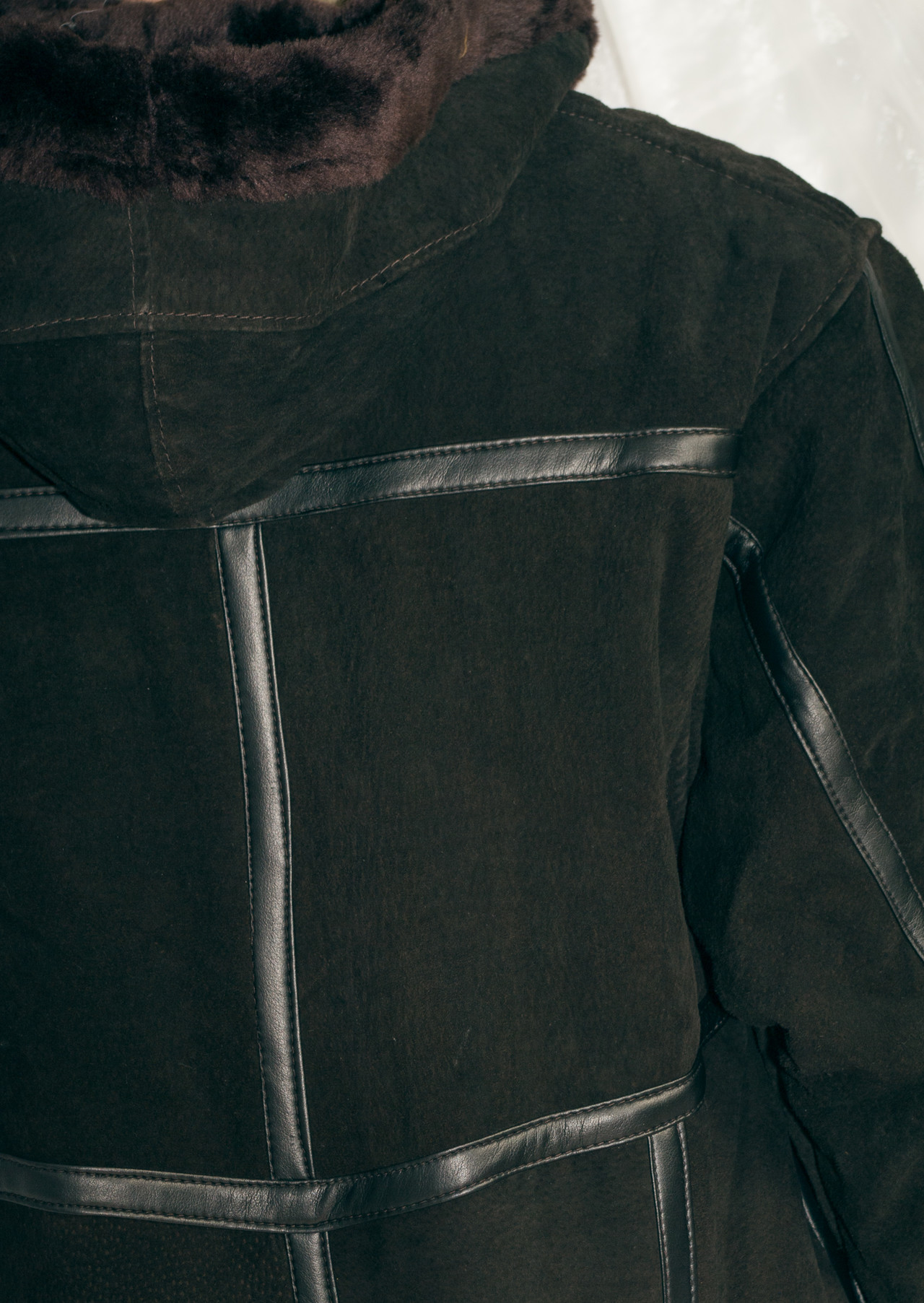 A vintage shearling-like leather coat from the 80s still in great condition. Featuring genuine suede with faux fur lining, button closure, two pockets and a hood. Recommended size: EU 40-42.