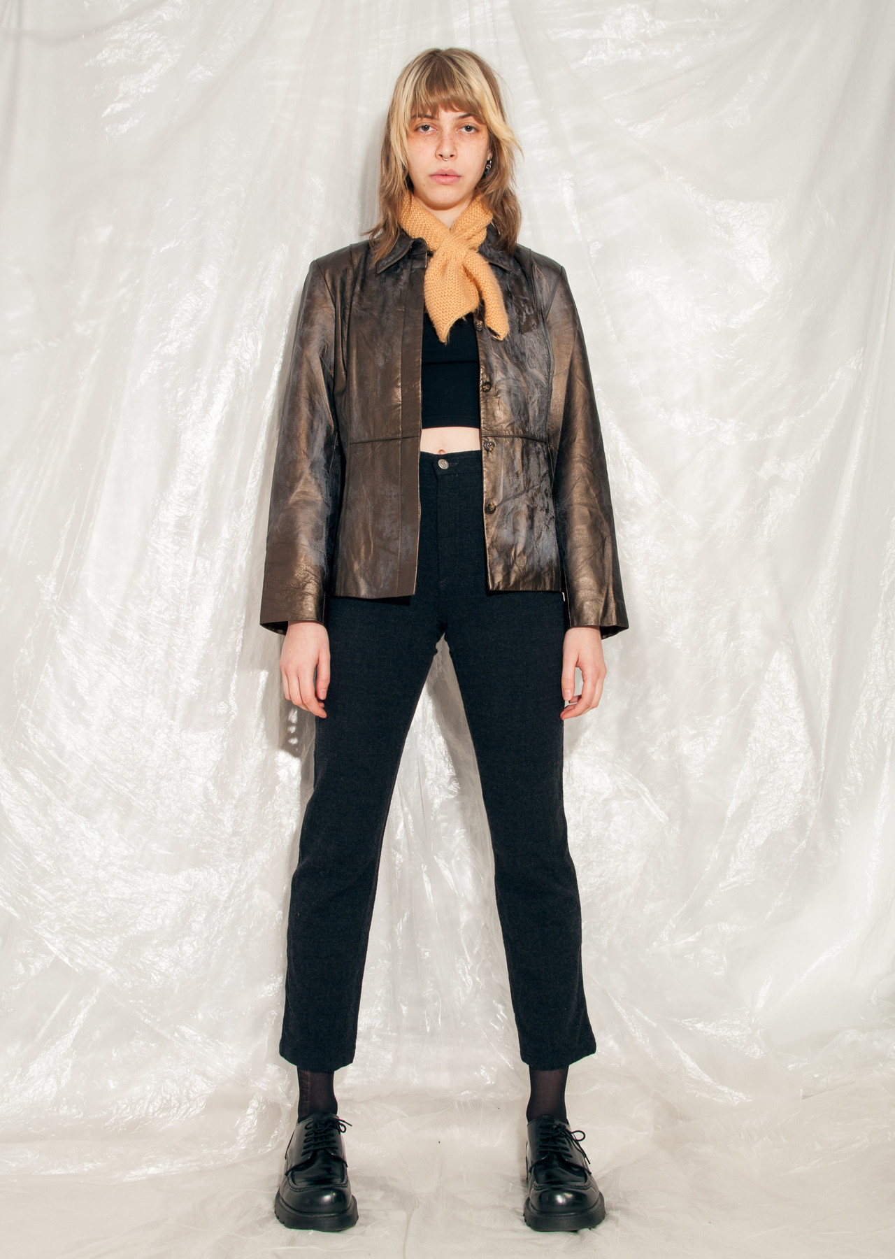 Unreal vintage leather jacket, a Y2K gem in great condition. It’s made of bronze leather and has a button closure. Aaand we even reworked it to get this smokey grunge look. Style this one with more vintage clothes.