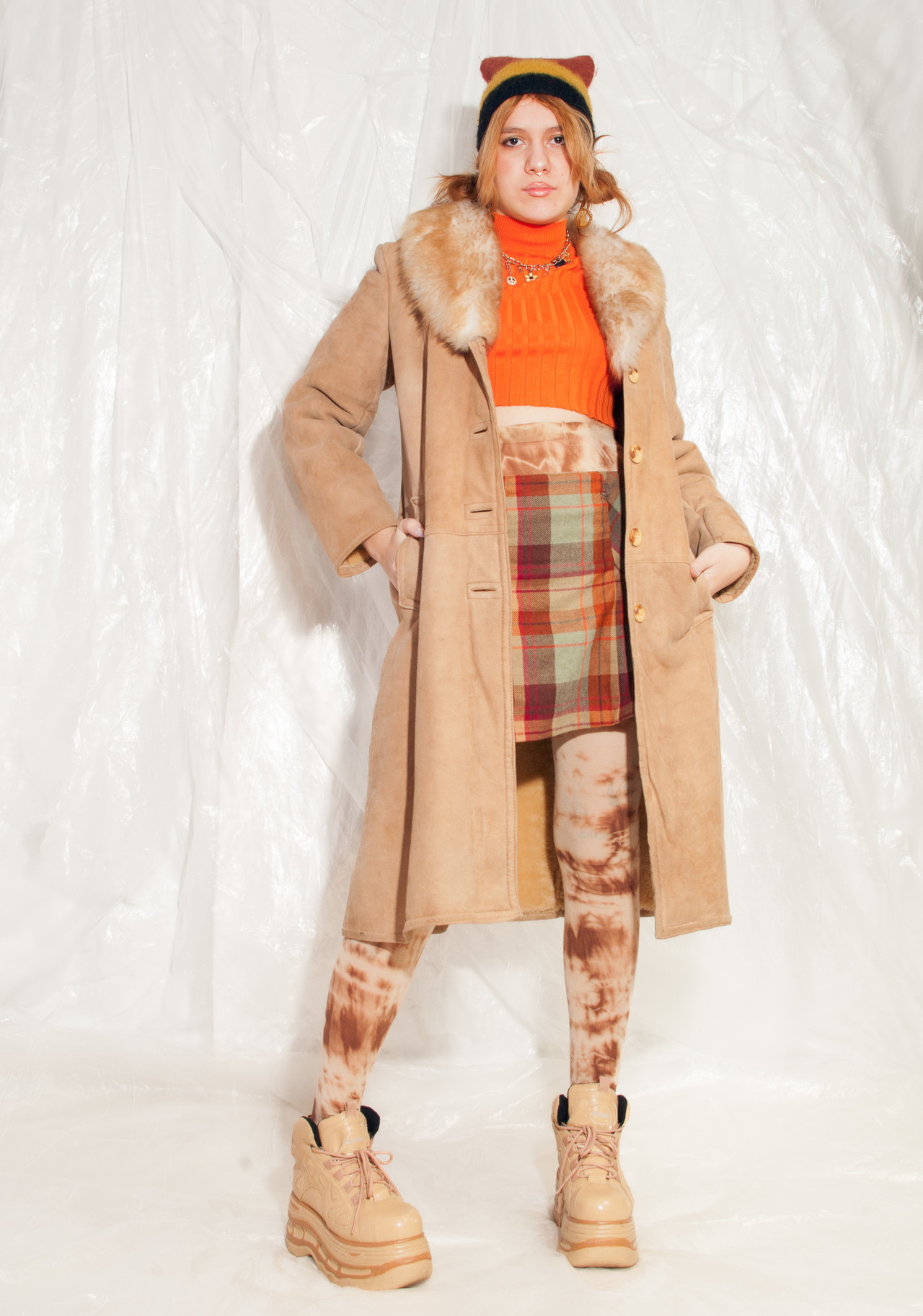 This Penny Lane-style vintage shearling coat just arrived through our time tunnel from the 70s, and it is still in good condition — its only fault is a small hole in one of its sleeves. The coat itself features a beige suede surface with real fur inside, a button closure and two pockets. Grab this gem before someone else does.