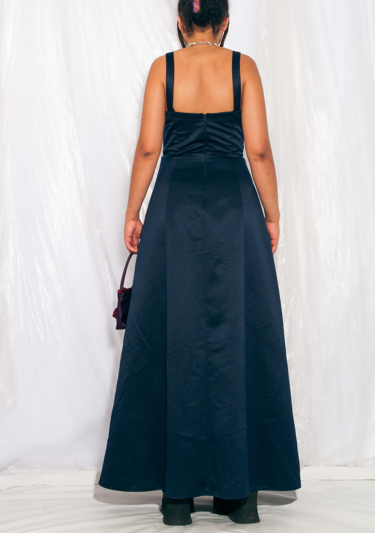 A 90s vintage prom evening dress and it’s still in mint condition. It’s made of blue satin fabric and comes with ruched front details and a zip closure. It’s also lined. Save the planet, wear vintage!