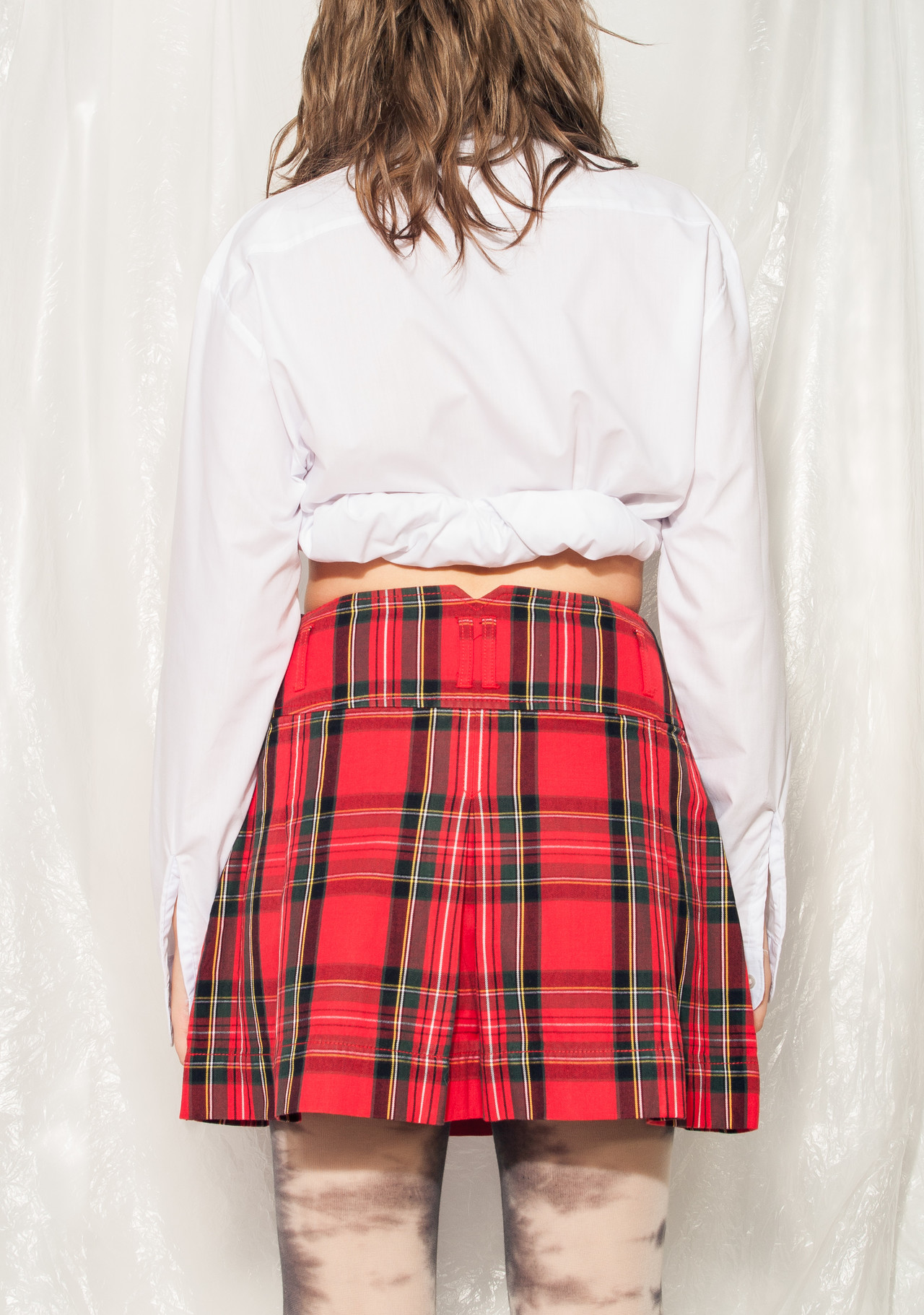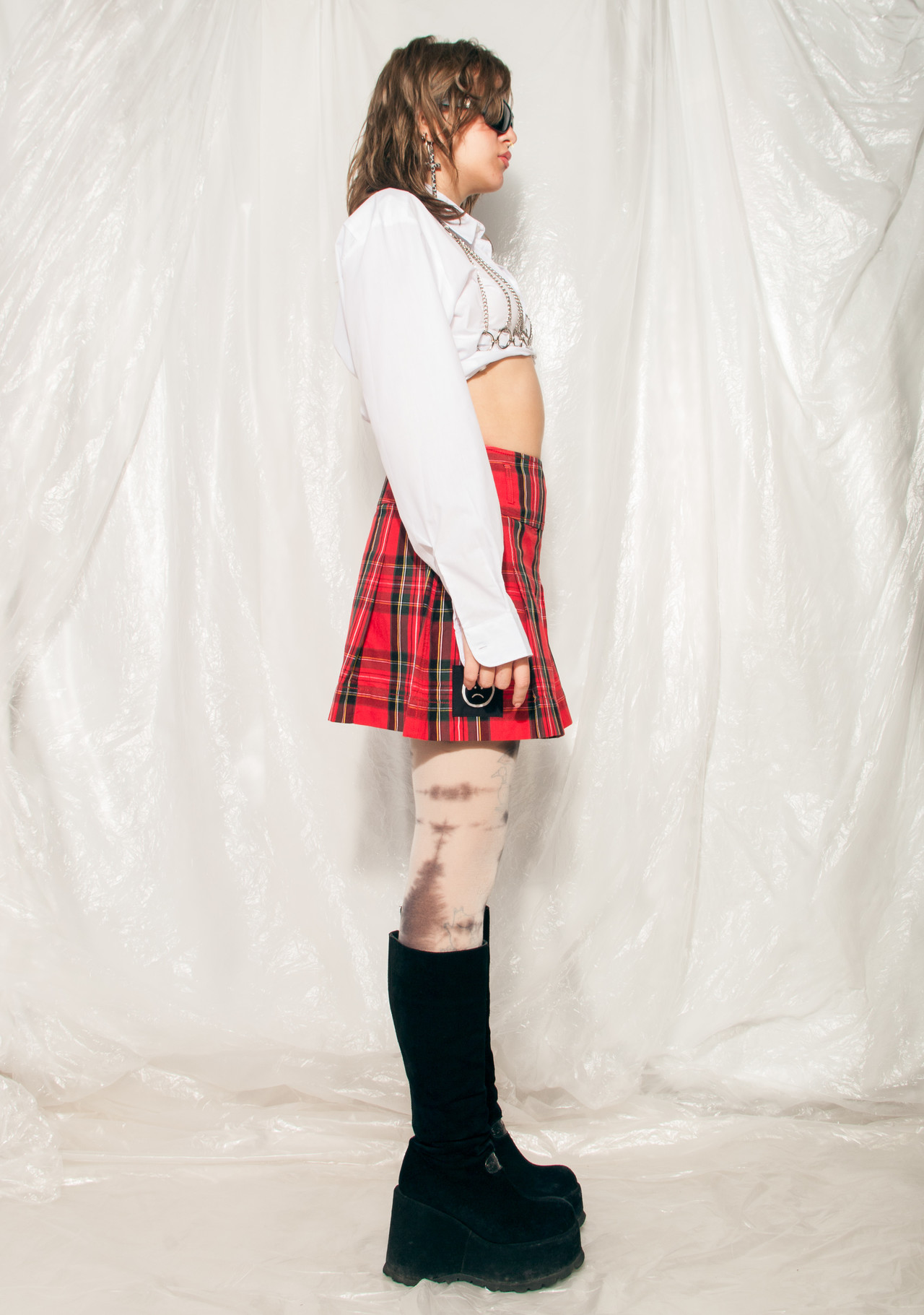 Reworked vintage punk plaid skirt, a real Y2K piece that we spiced up with a hand-printed sad smiley patch. The skirt itself is made of red cotton and has wide pleats and a zip closure. It’s an EU size 40 worn on the waist and an EU size 38 worn on the hips.