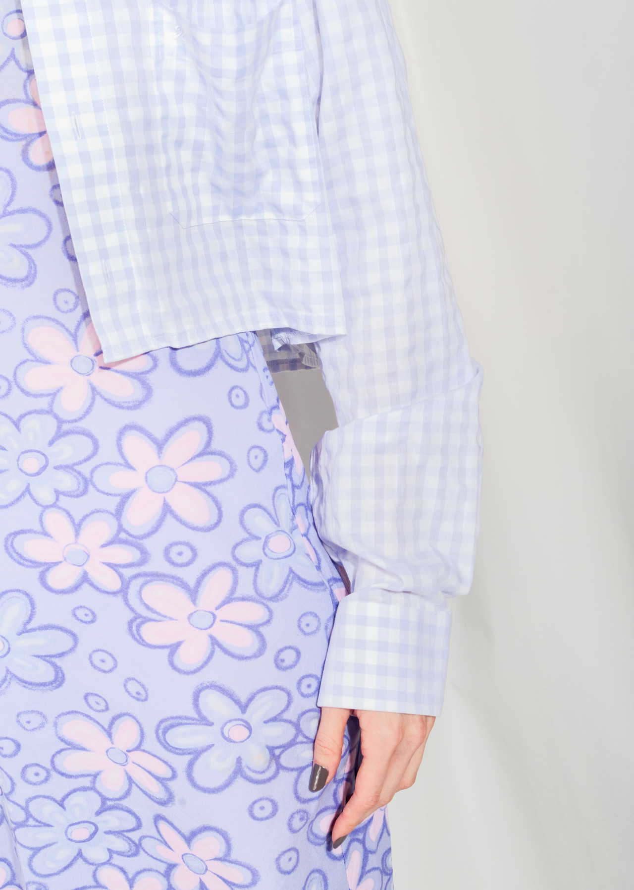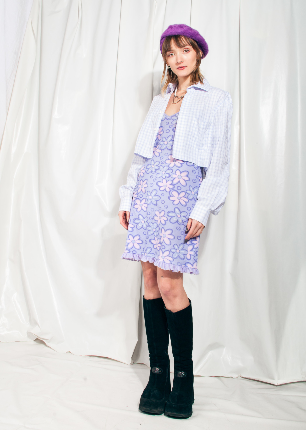 Let us enumerate the cool things about this vintage shirt. It’s from the 90s and it’s still in great condition. It’s made from natural yet easy-to-care fabric. And we even shortened it to get this sweet cropped length. More facts: front button closure, long sleeves, pointed collars. That’s all. Now go and pick this piece of sustainable reworked clothing instead of planet-killer fast fashion.