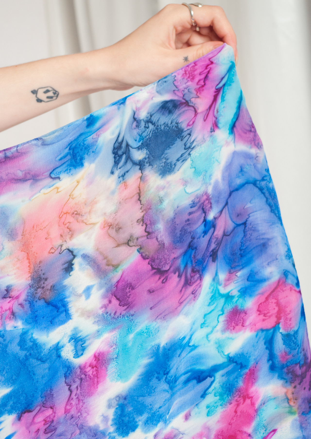 Tie-dyed pure silk vintage scarf that entered our time tunnel in the 90s and just slipped out here in mint condition. It features vivid colours and hand-sewn edges.