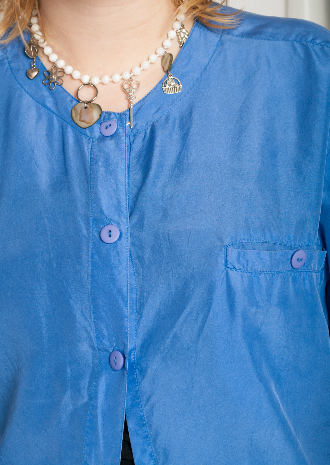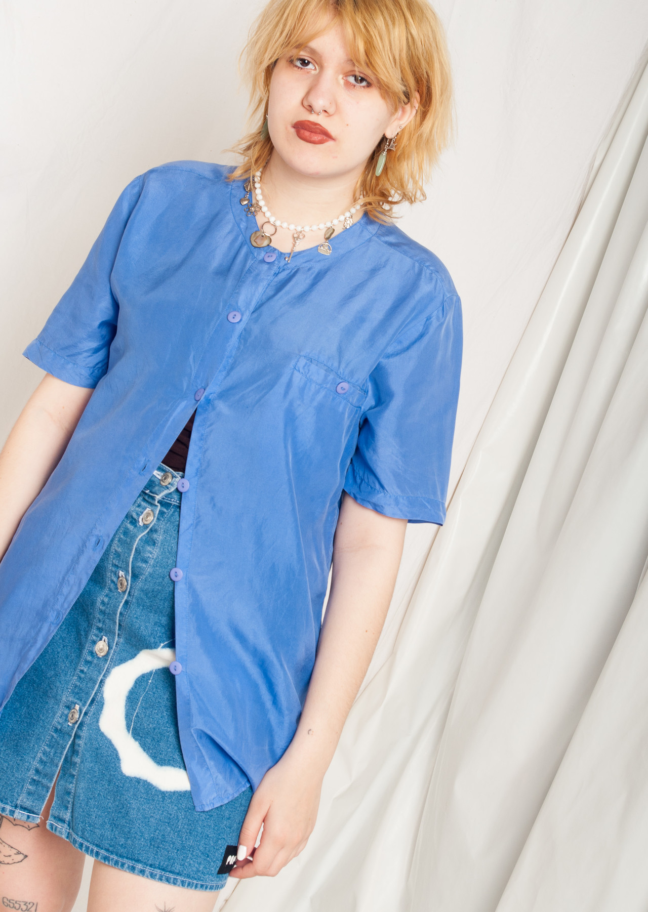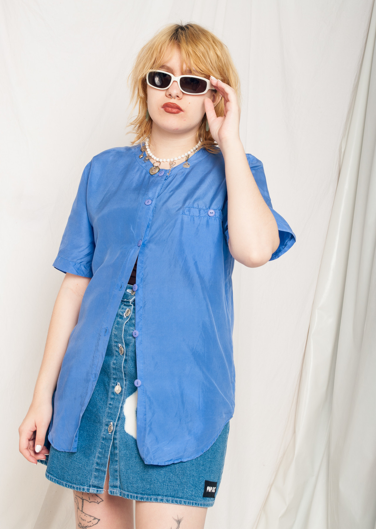 Vintage Silk Shirt 90s Oversized Top in Blue