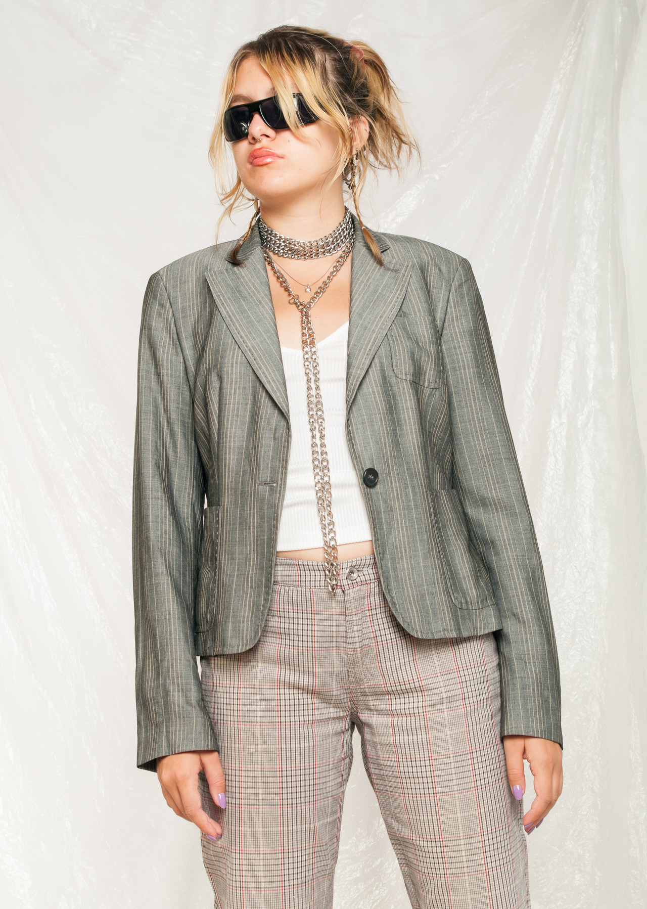 A Y2K vintage blazer that survived all these years in excellent shape. It features silver viscose-wool fabric, three pockets and a button closure. It’s also lined. For an EU size 36-38 as an oversized fit and for a size 40 as a regular fit.