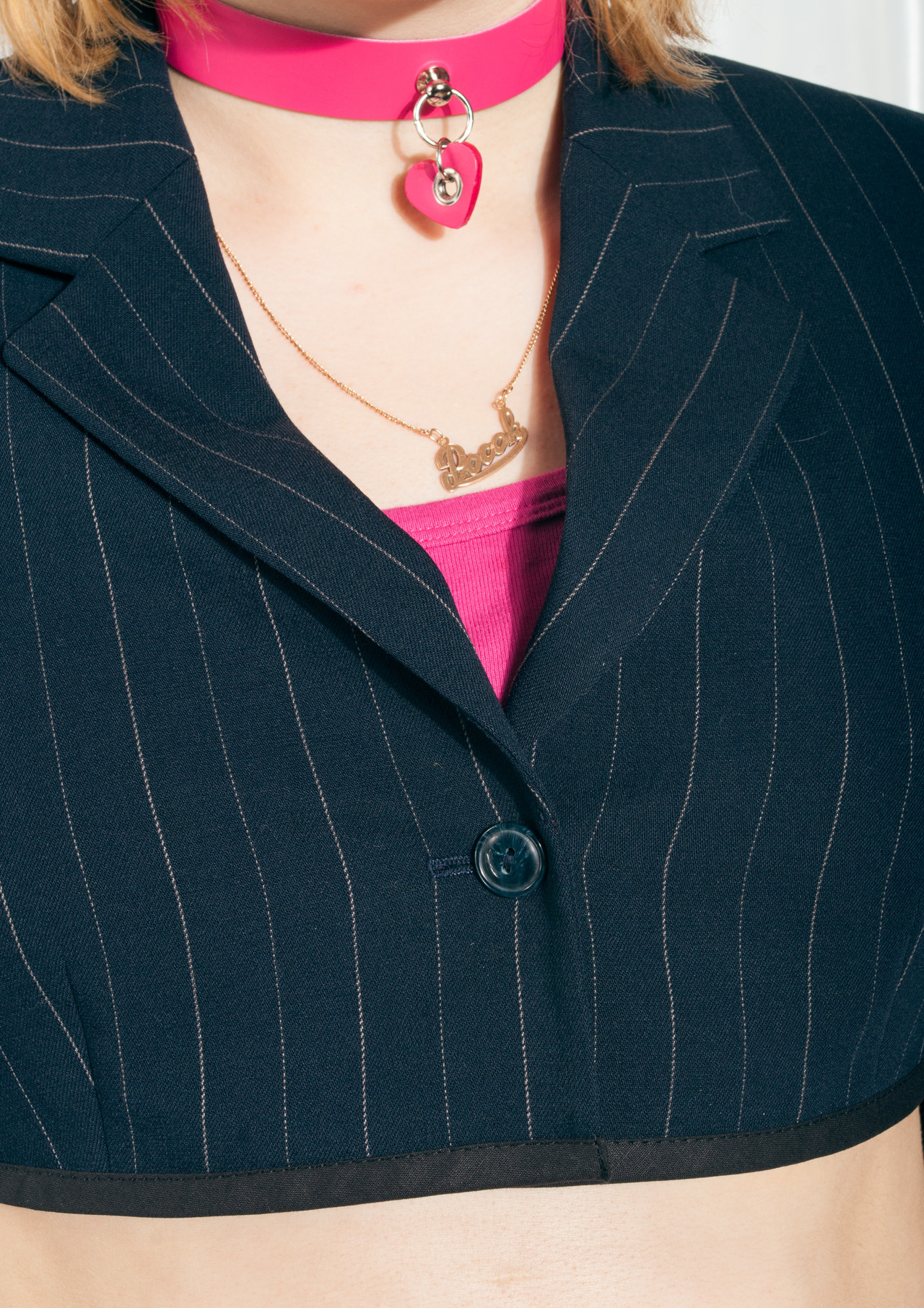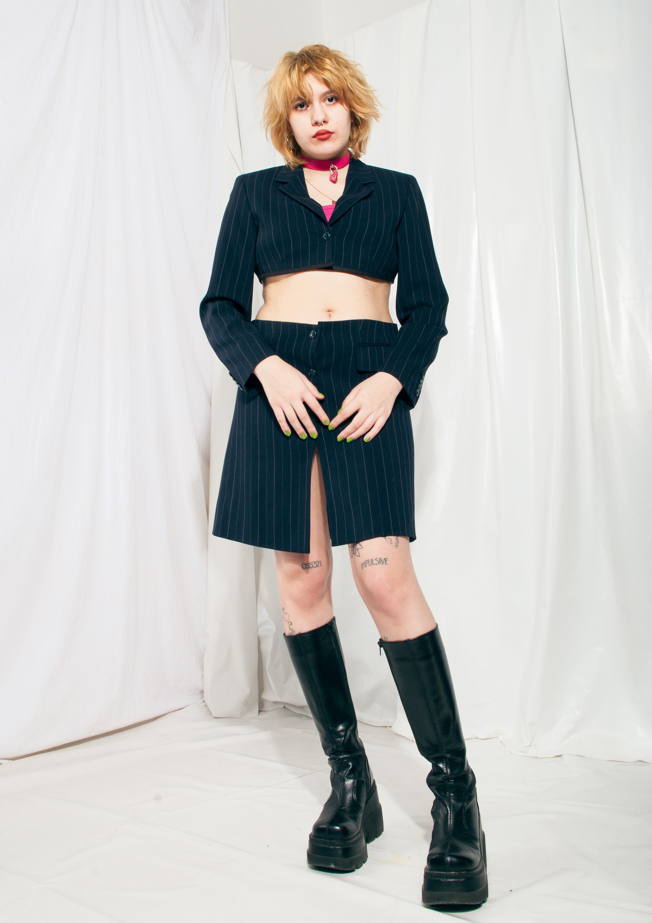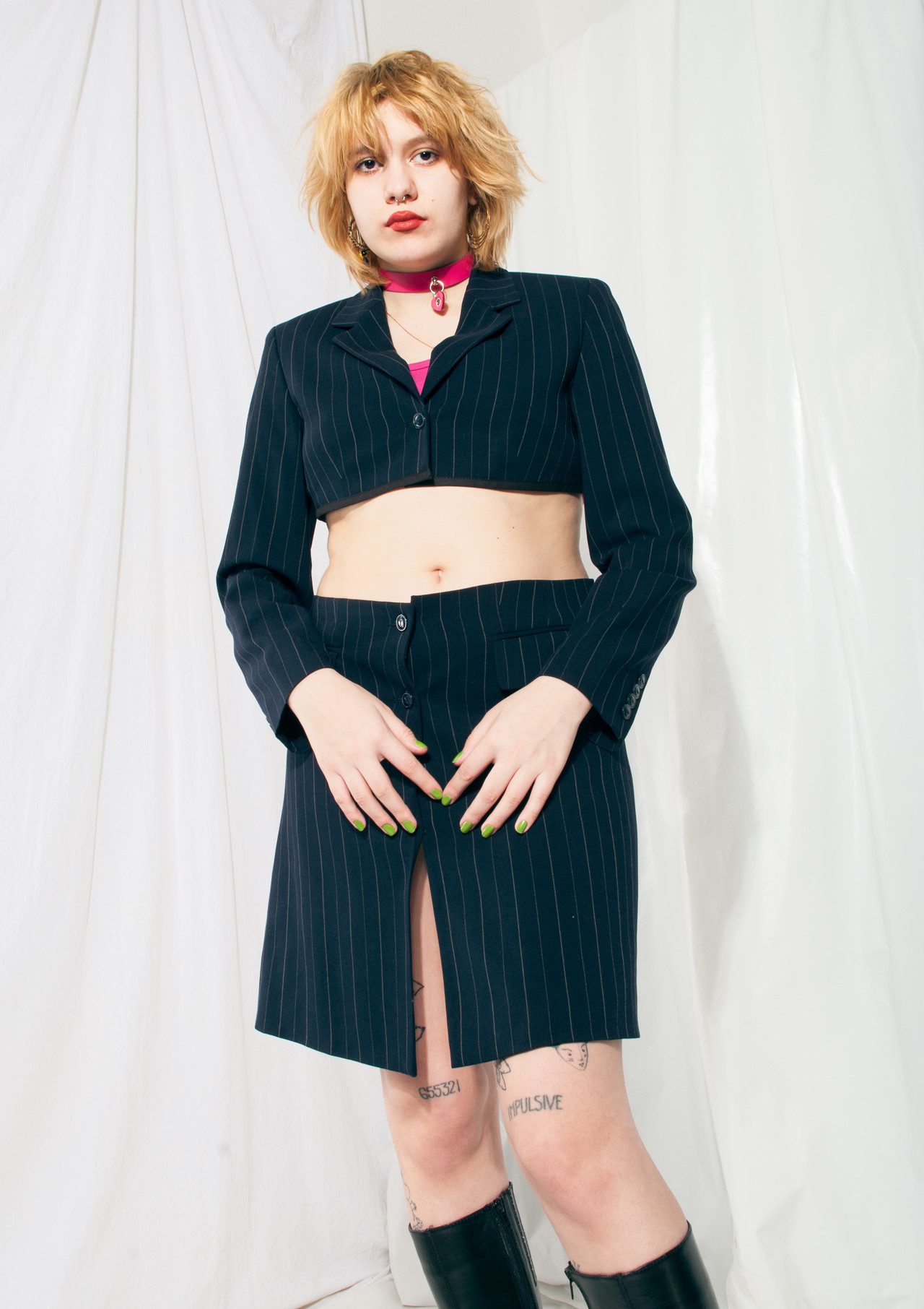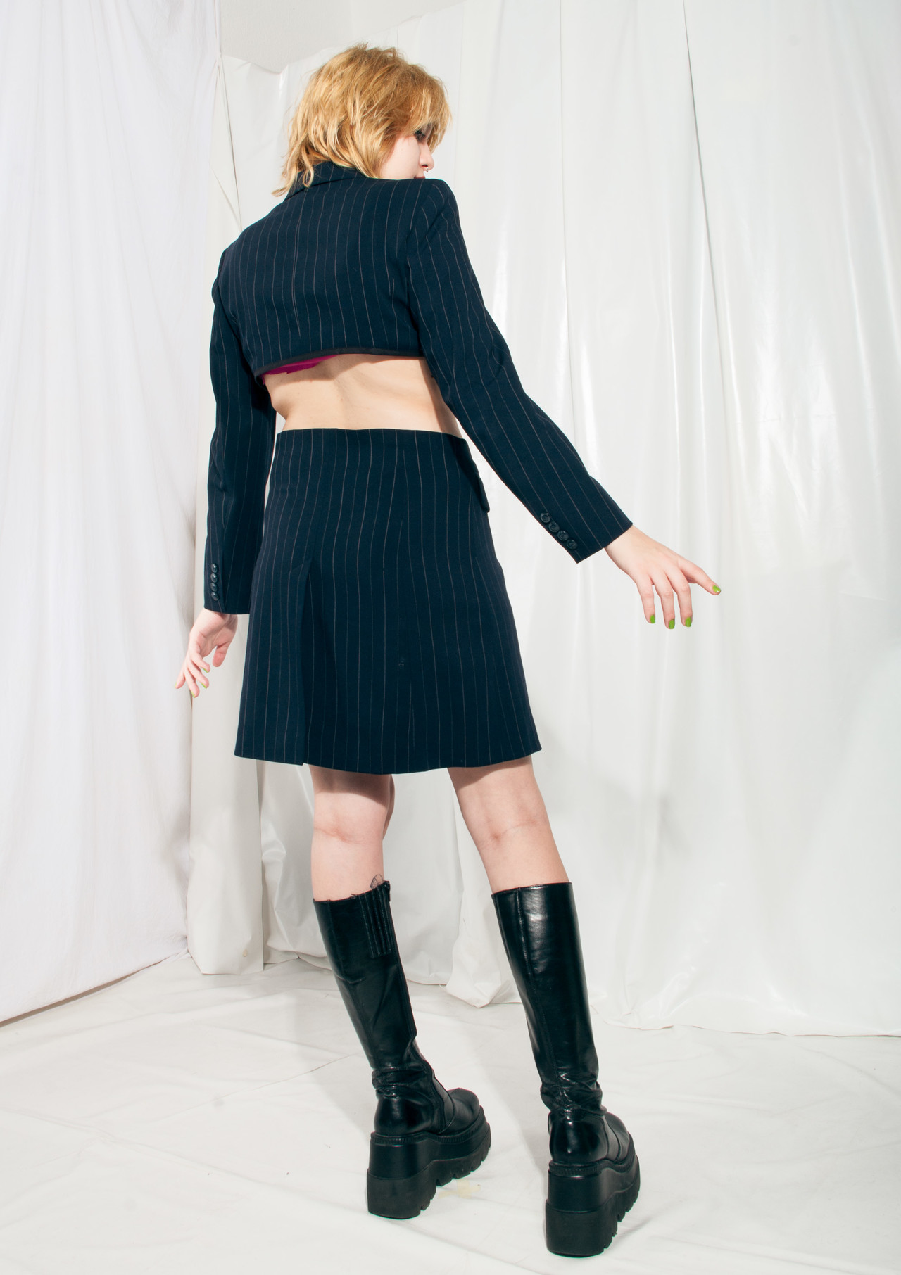 We made this suit set from a long vintage Betty Barclay blazer. It features soft dark blue fabric, an extra cropped blazer and a middle-rise skirt with long step slits. Don’t hesitate to grab this one-off gem before someone else does.