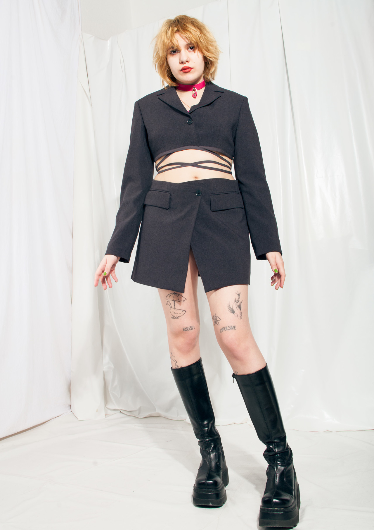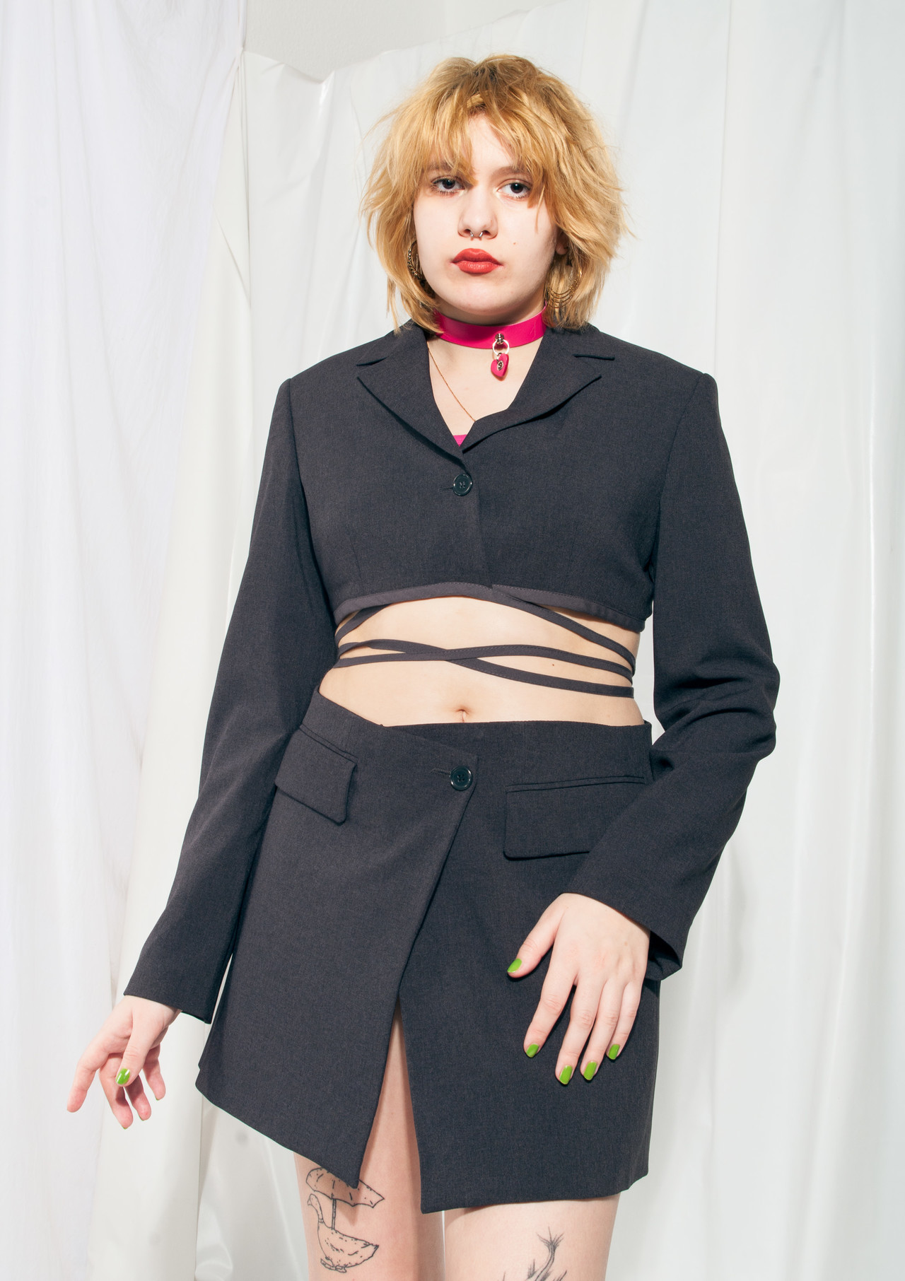 We made this suit set from a long vintage Benetton blazer that entered our time machine in the 90s. It features long ties on the blazer and a middle-rise skirt. Let’s get sustainable – switch to vintage now!