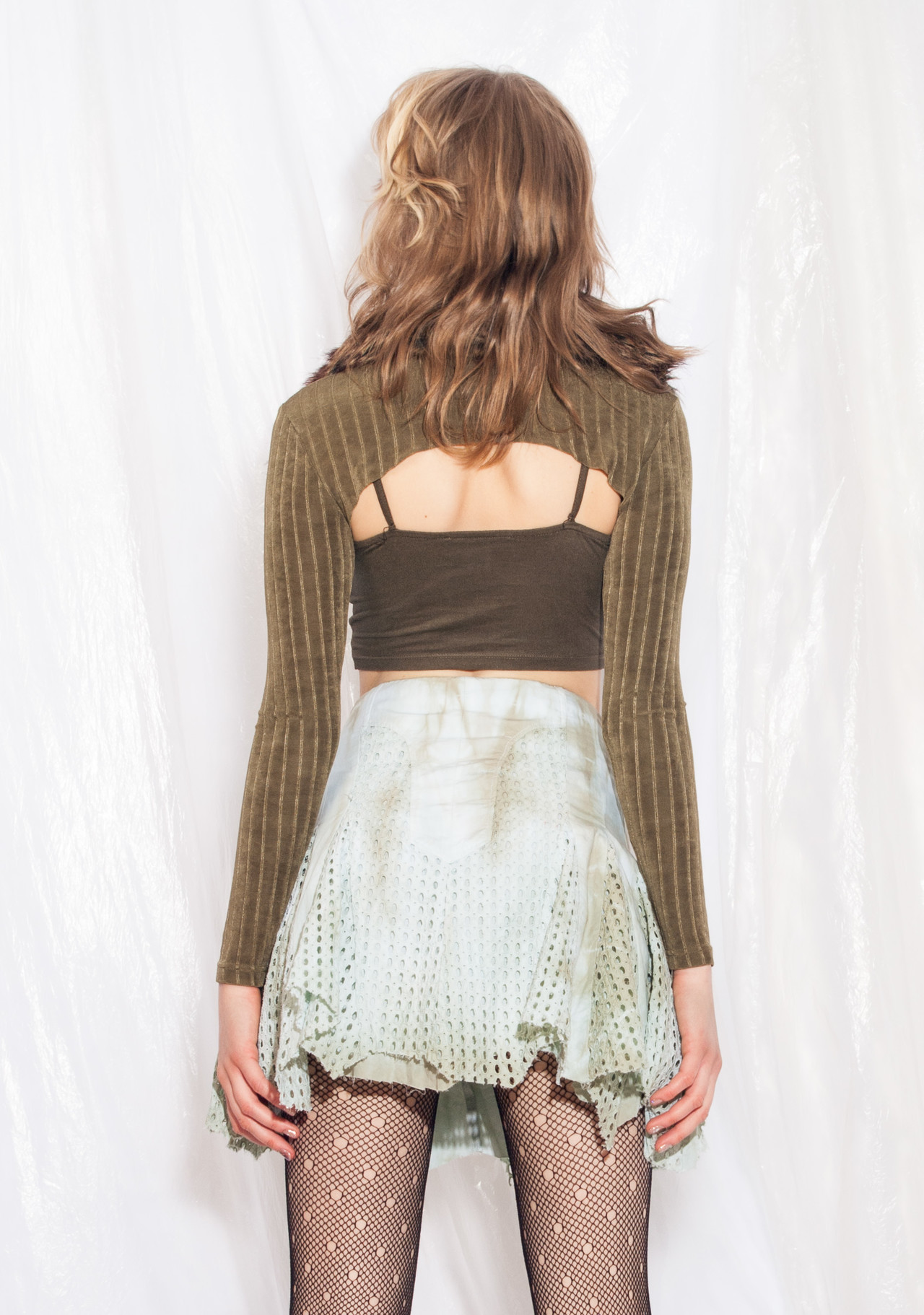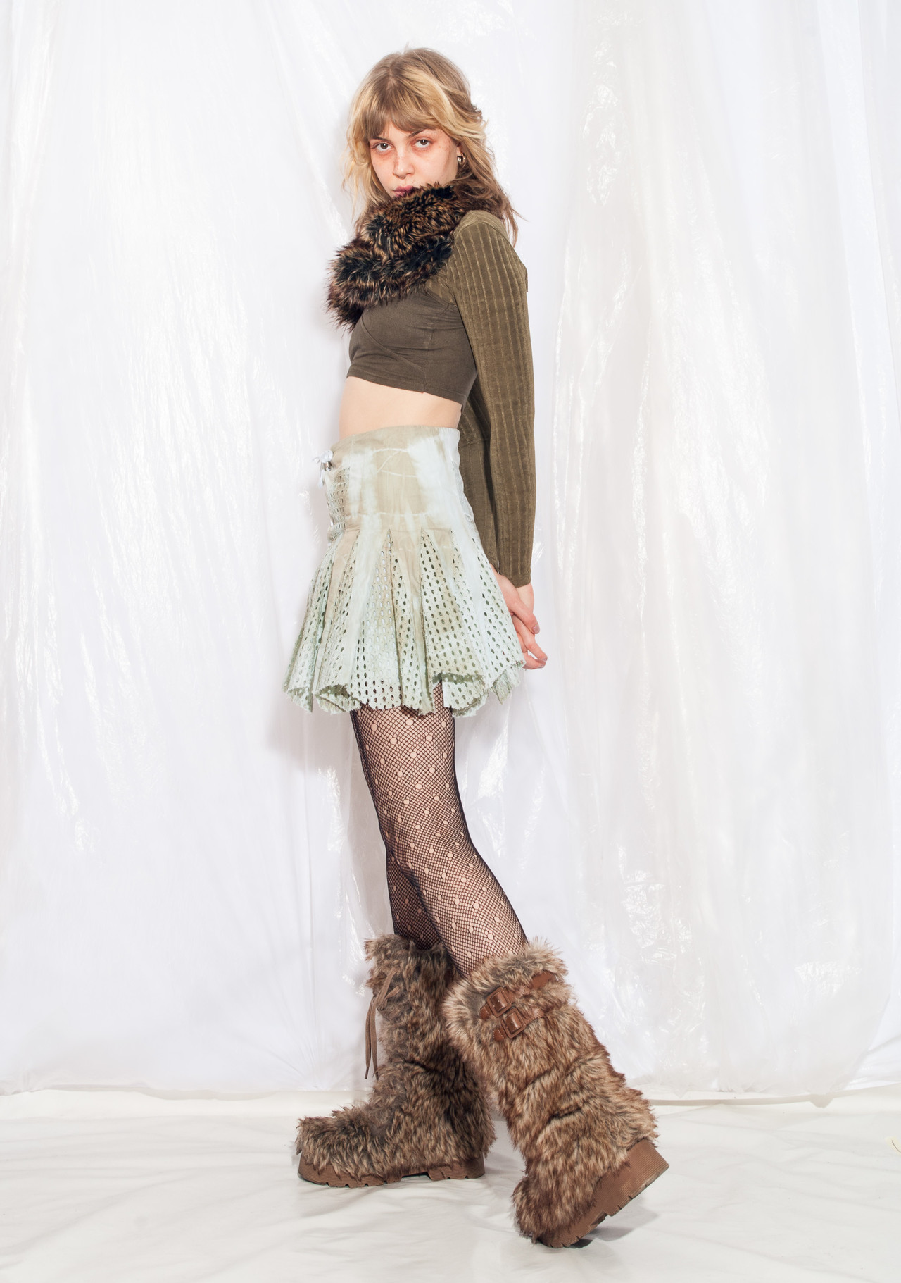 Reworked Y2K vintage skirt, our tie-dyed and re-cut piece with a frilly raw hem. Featuring brown and green cotton fabric and lace-up closure. This piece is a one-off chance. Go, go, go!