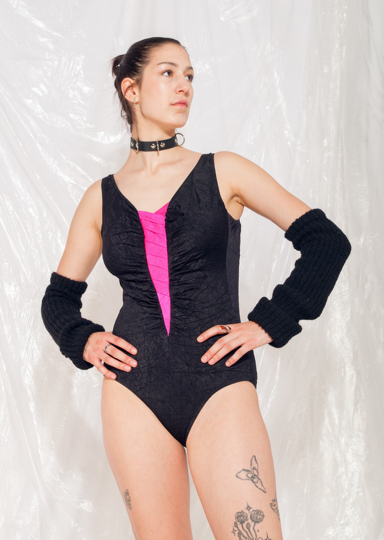 Vintage swimsuit that entered our time machine in the dreamy 80s and just slipped out here in mint condition. It rocks creased and ruched black fabric with a pink inset.
